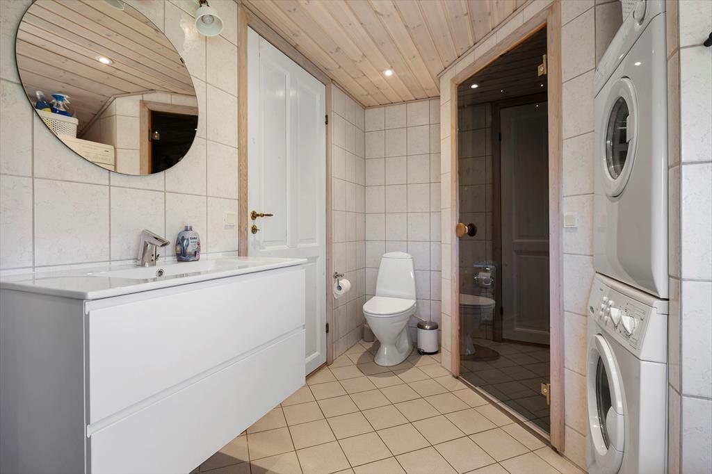 Die beiden Schlafbereiche sind durch einen kleinen Flur mit einer gemütlichen Sitzecke und Ausblick in den Garten getrennt. Das Haus verfügt über ein Gäste-WC und ein großes Badezimmer mit Whirlpool und Sauna – und jetzt auch über exklusiven Wellnesskomfort im Außenbereich.