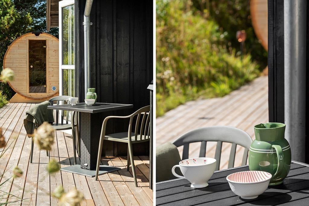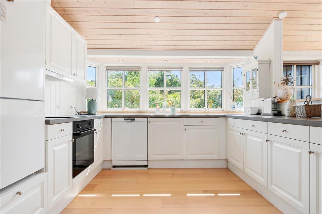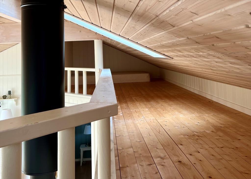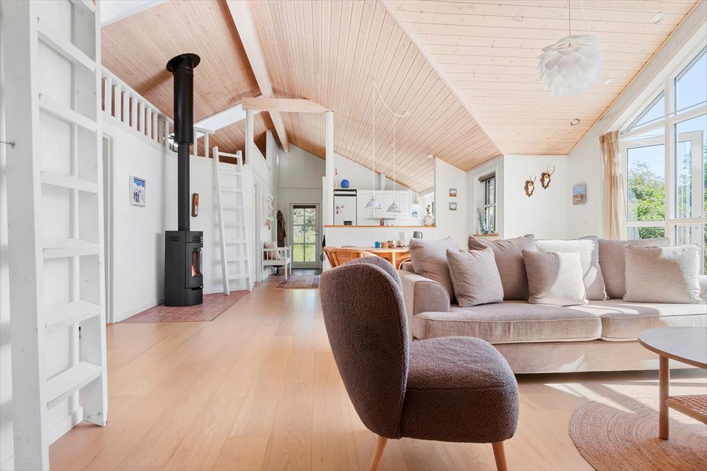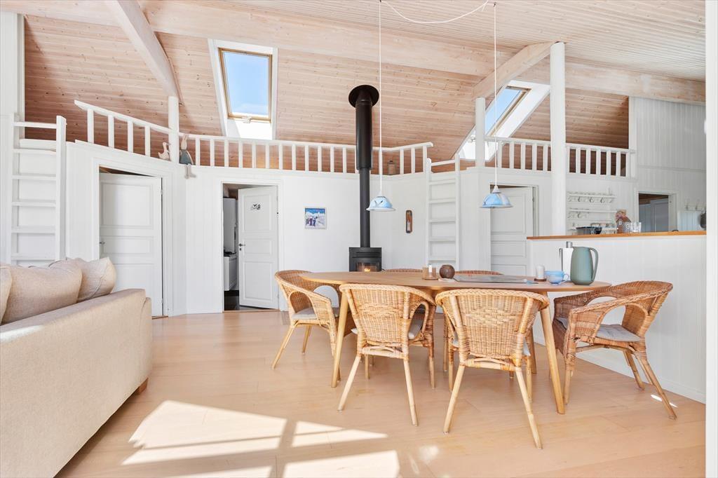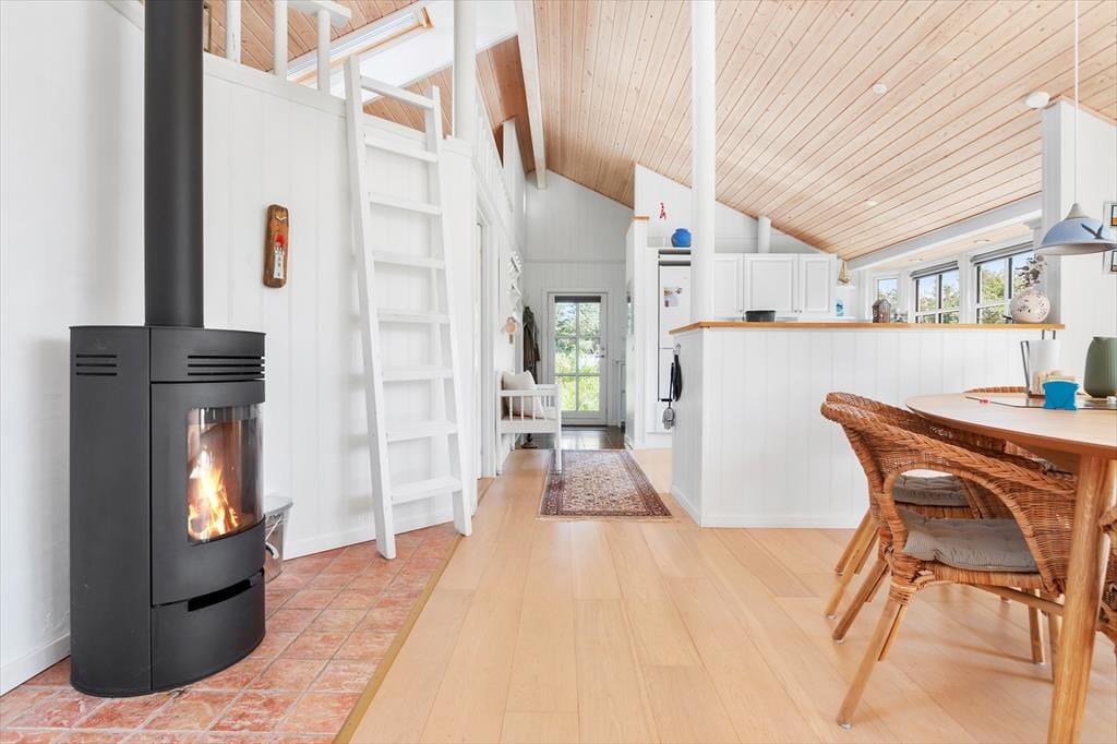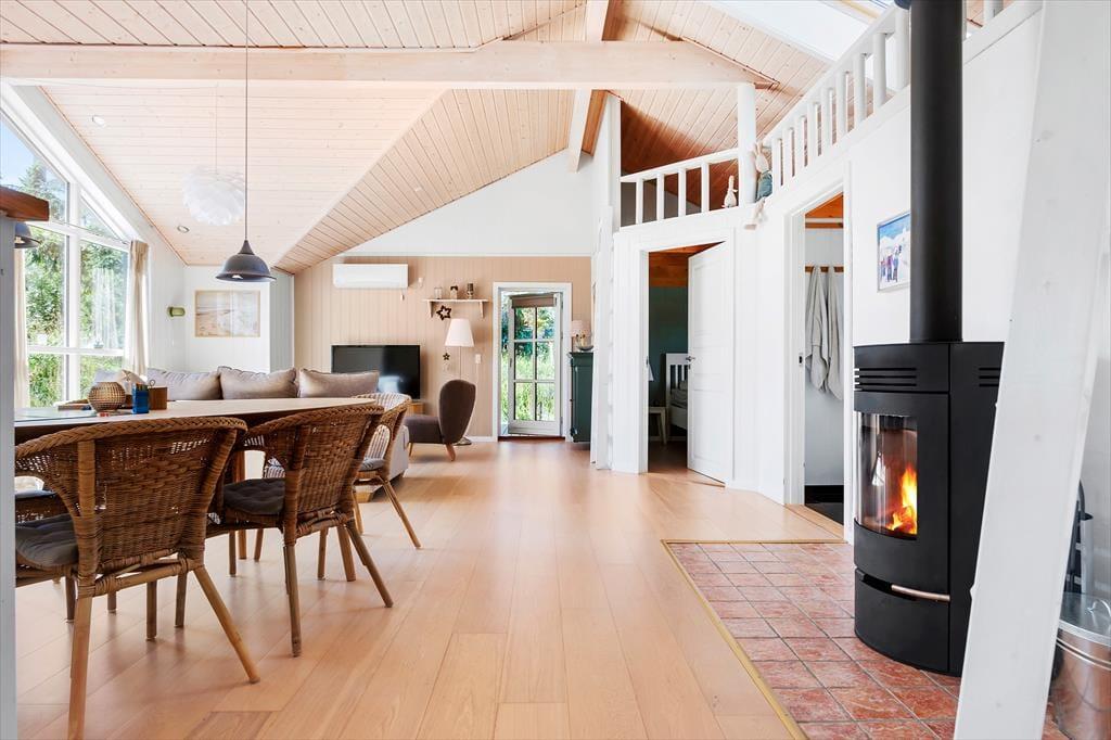 Bei diesem Urlaubdomizil handelt es sich um ein ansprechendes und wohlproportioniertes Gebäude mit einer Wohnfläche von 99 m². Das Haus wurde im Jahr 2008 gebaut. Im Badezimmer und in der geräumigen, offenen Küche wird schnell ersichtlich, dass es sich um ein neueres, qualitativ hochwertiges Objekt handelt. Insgesamt ist der Einrichtungsstil als freundlich und ansprechend zu charakterisieren. Die gemütlichen Möbel und die hellen Farbnuancen verleihen den einzelnen Räumen ein wunderbares Ferienhausflair. Die bereits erwähnte Küche ist in den Wohnraum integriert. Der Wohnraum besticht zudem mit einem behaglich knisternden Kaminofen, hohen Decken und großen Fensterpartien, die einen schönen Tageslichteinfall gewähren. Der Eingangsberiech schließt ebenfalls offen an den Aufenthaltsbereich an. Hier stehen Waschmöglichkeiten zu Ihrer Verfügung, sodass Sie sich praktischerweise unnötig viel Reisegepäck ersparen können. Vom Wohnraum aus gelangen Sie auch hinauf auf einen großen Schlafboden, der sich oberhalb der drei Schlafzimmer und des Badezimmers befindet.
