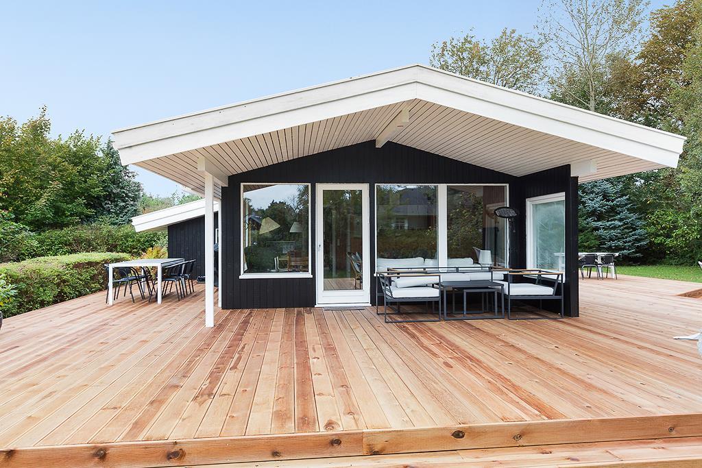 Draußen entfaltet sich das Ferienhaus in eine geschützte grüne Oase, in der Groß und Klein das Urlaubsleben genießen können. Die große Holzterrasse umgibt das Haus nach Osten, Süden und Westen – so findet man den ganzen Tag über sowohl sonnige als auch schattige Plätze. Auf dem überdachten Teil der Terrasse lädt eine gemütliche Loungegarnitur zu entspannten Morgenstunden und langen Sommerabenden unter freiem Himmel ein.