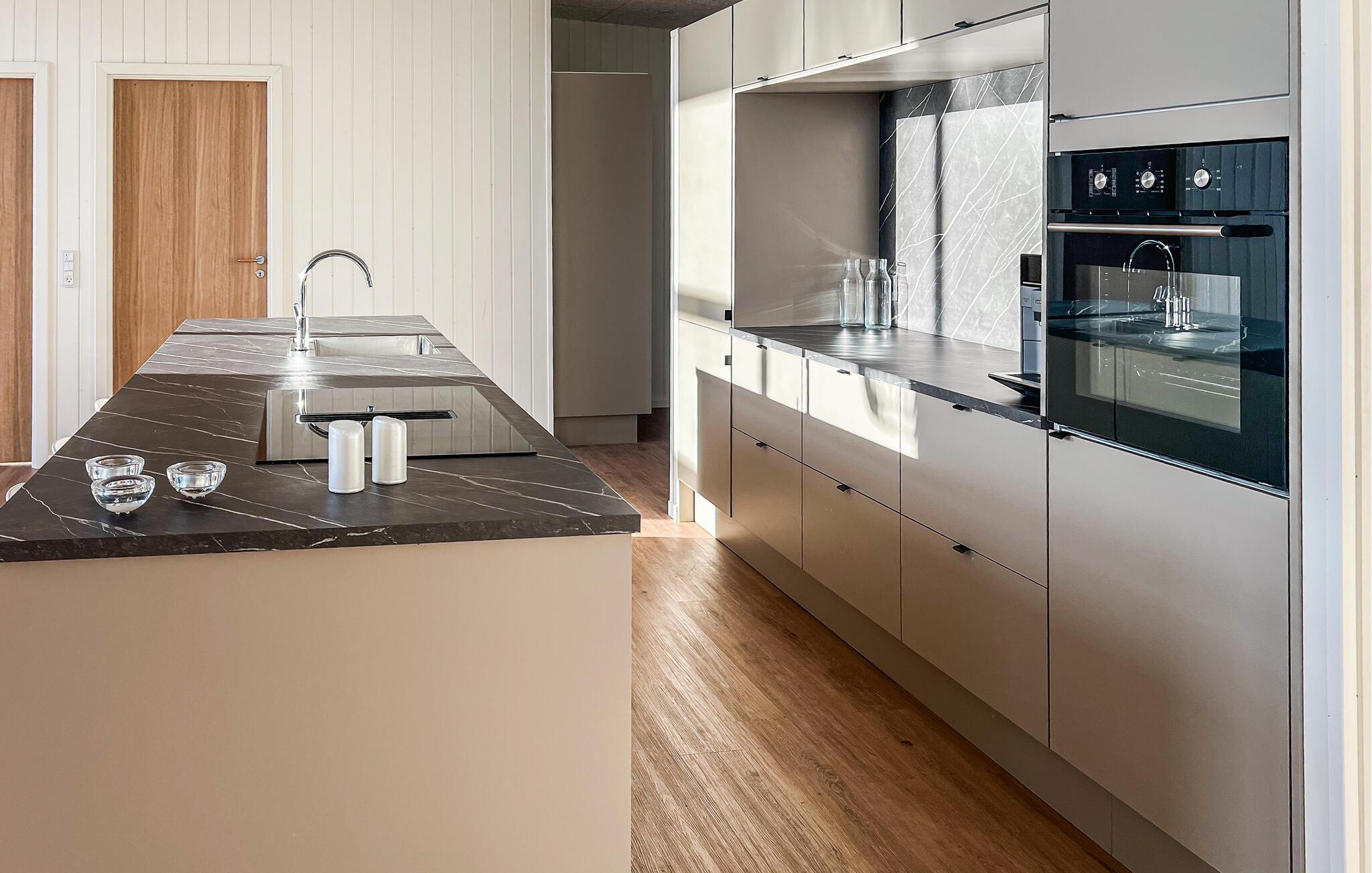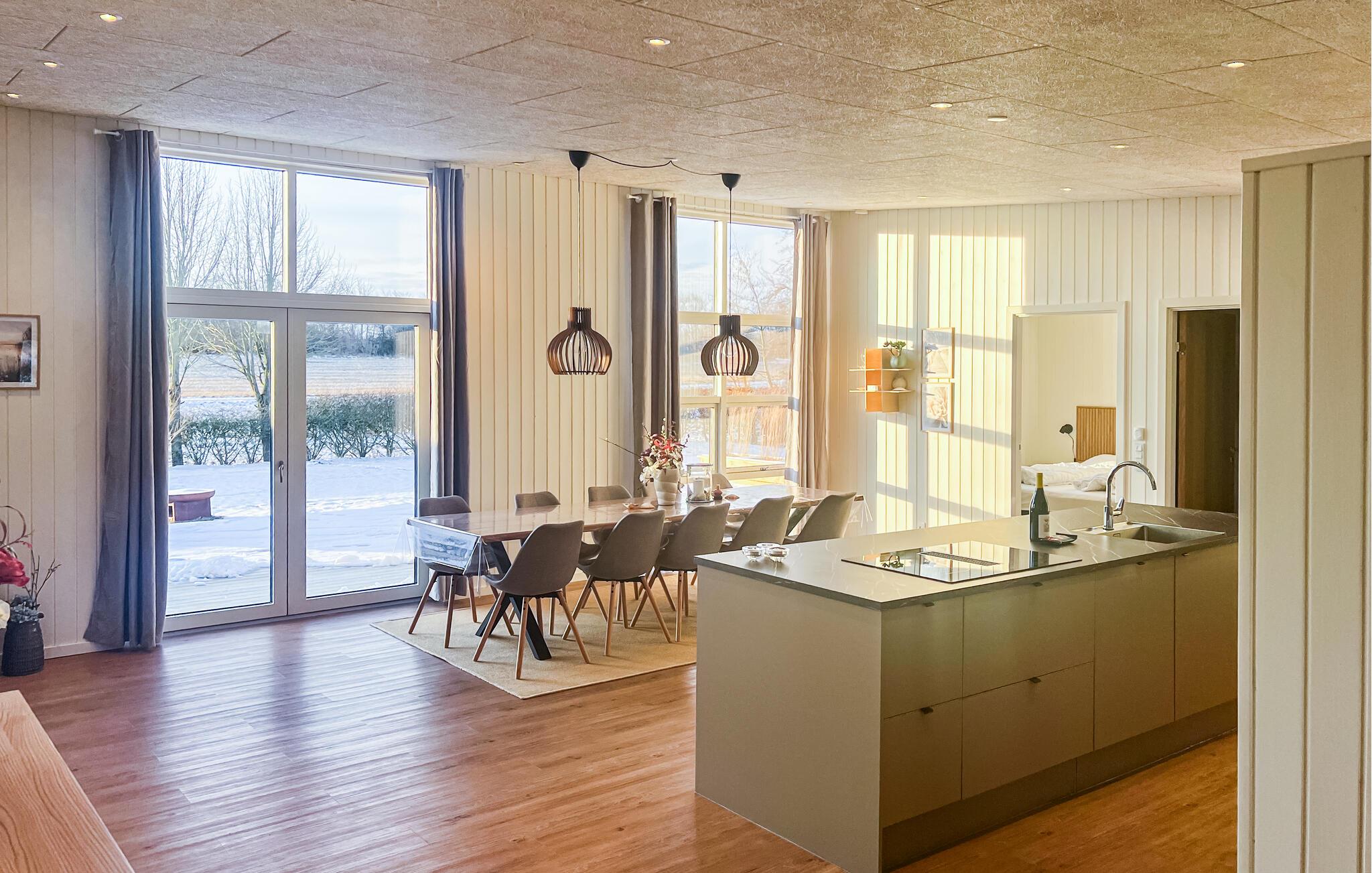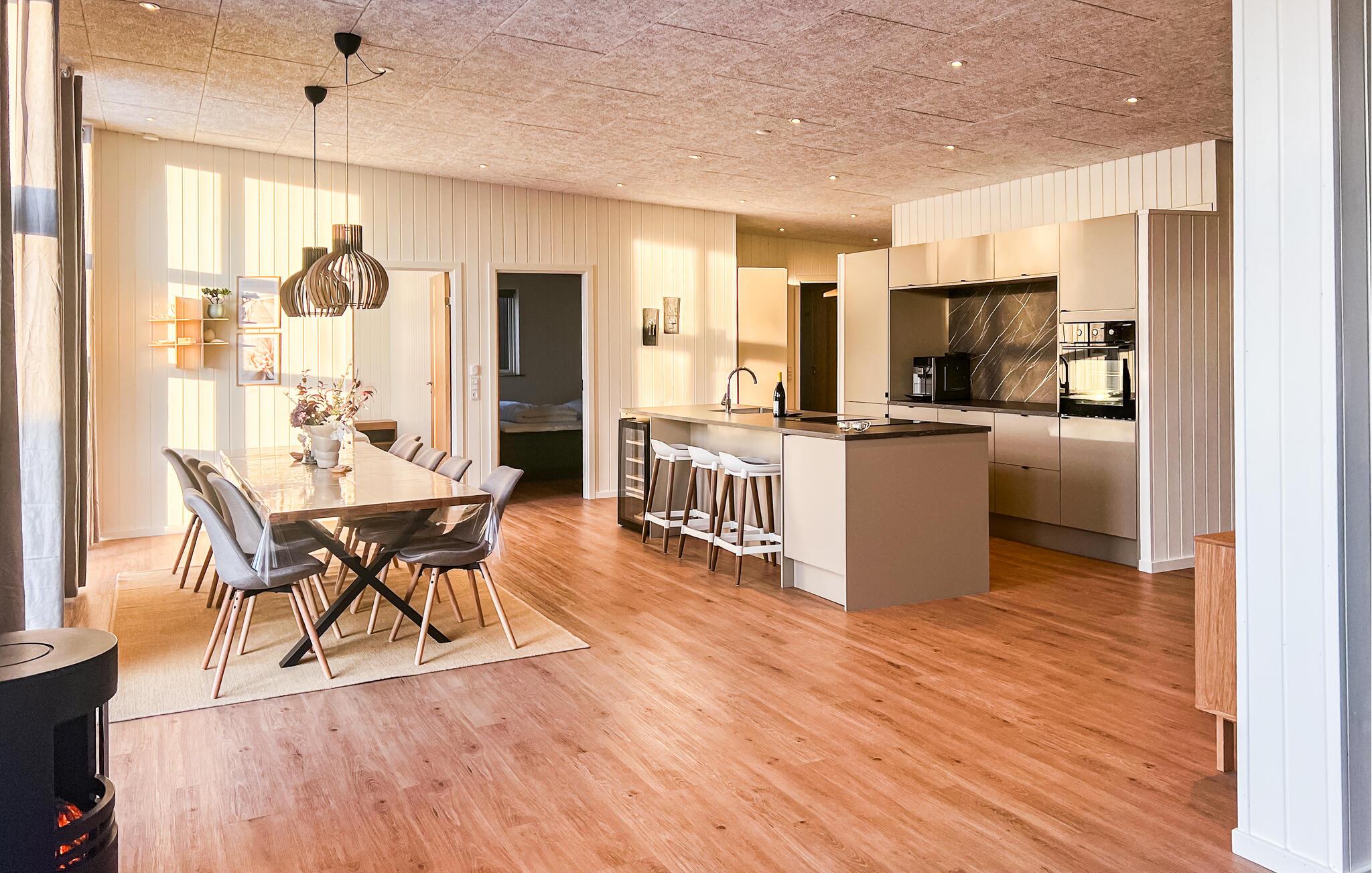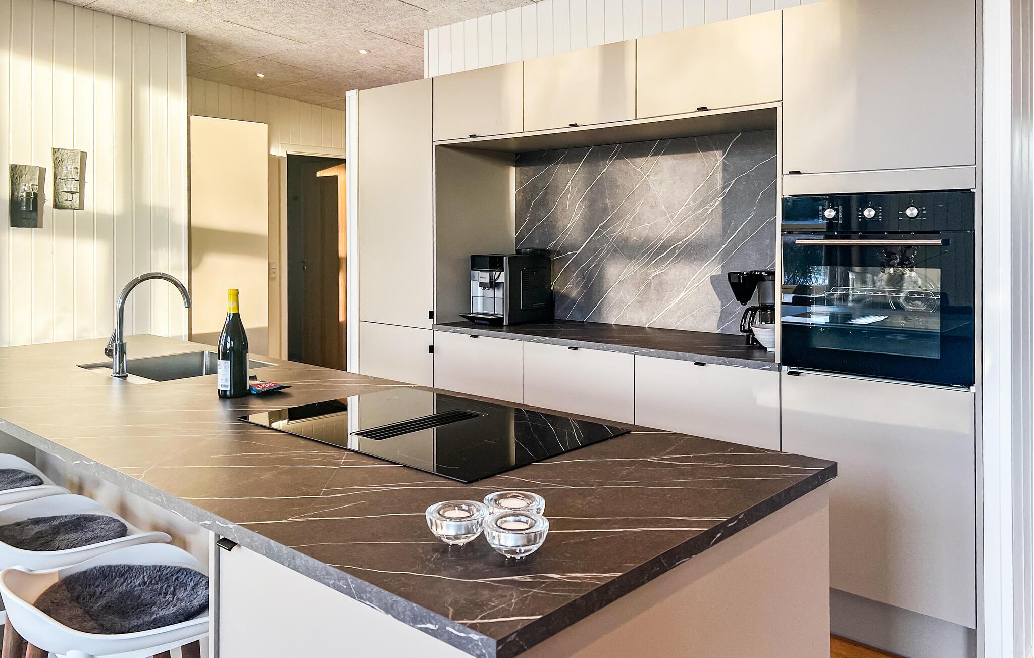 Nehmen Sie Platz auf dem bequemen Sofa im Wohnraum und lassen Sie den Blick durch die großen Fenster über die umliegende Landschaft schweifen. Oder entspannen Sie in den komfortablen Sesseln und machen Sie es sich mit einem Buch gemütlich. Nutzen Sie den offenen Küchen- und Essbereich für gemeinsame Kochabende. Bereiten Sie Ihre Mahlzeiten in der hochwertig ausgestatteten Küche mit Kochinsel zu. Verbringen Sie gesellige Stunden am großen Esstisch oder fordern Sie sich gegenseitig im Aktivitätsraum mit Billard, Airhockey und Darts heraus.