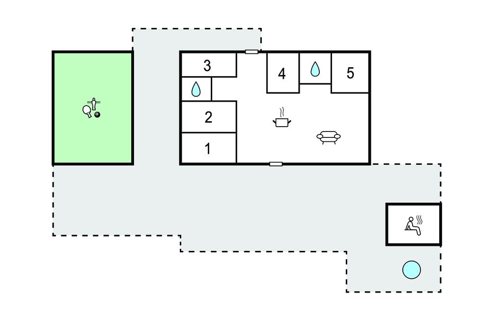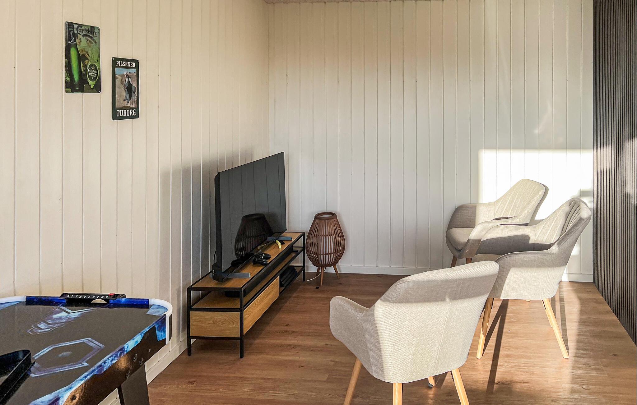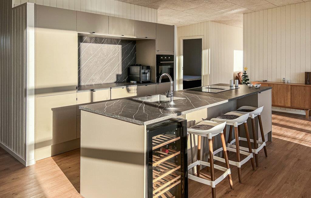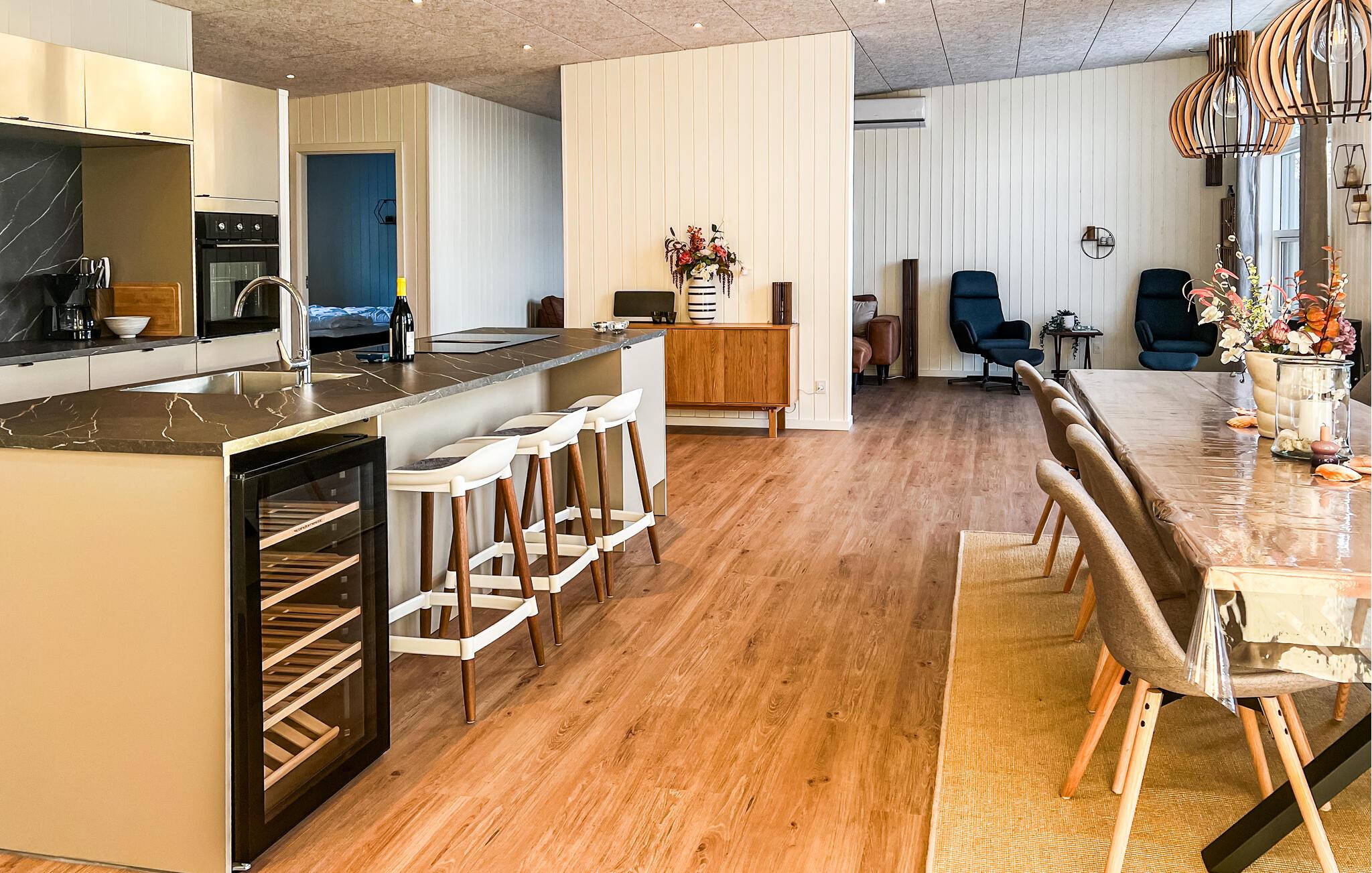 Nehmen Sie Platz auf dem bequemen Sofa im Wohnraum und lassen Sie den Blick durch die großen Fenster über die umliegende Landschaft schweifen. Oder entspannen Sie in den komfortablen Sesseln und machen Sie es sich mit einem Buch gemütlich. Nutzen Sie den offenen Küchen- und Essbereich für gemeinsame Kochabende. Bereiten Sie Ihre Mahlzeiten in der hochwertig ausgestatteten Küche mit Kochinsel zu. Verbringen Sie gesellige Stunden am großen Esstisch oder fordern Sie sich gegenseitig im Aktivitätsraum mit Billard, Airhockey und Darts heraus.