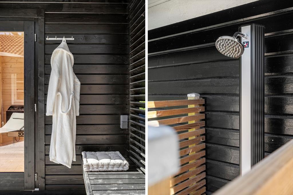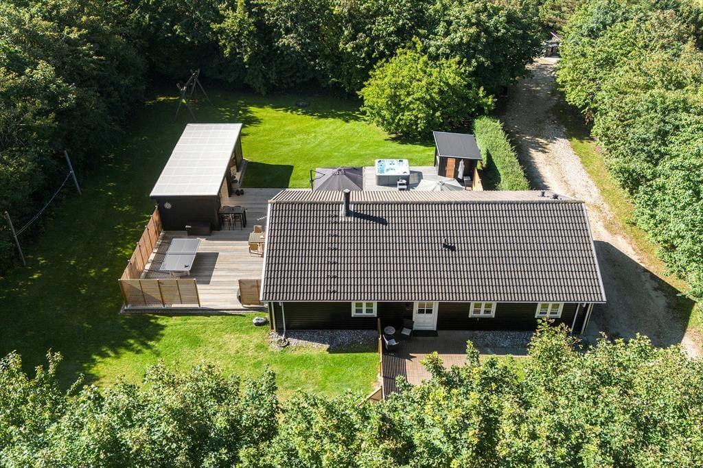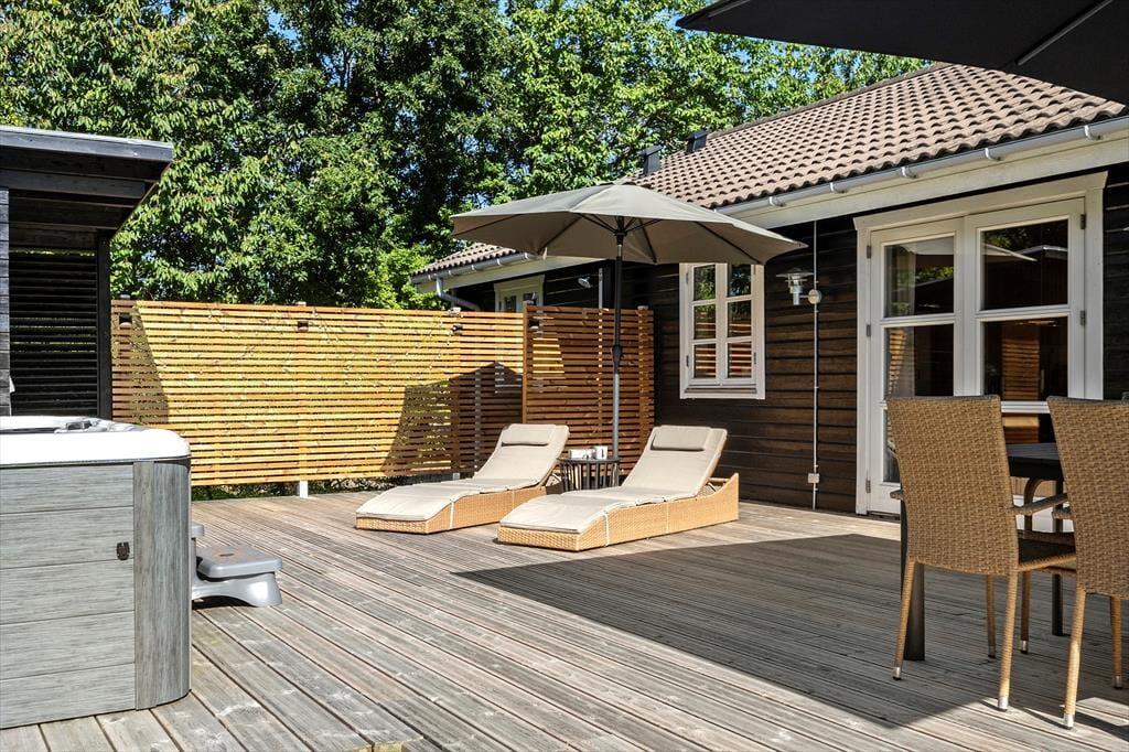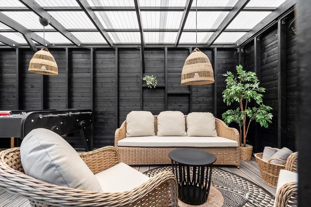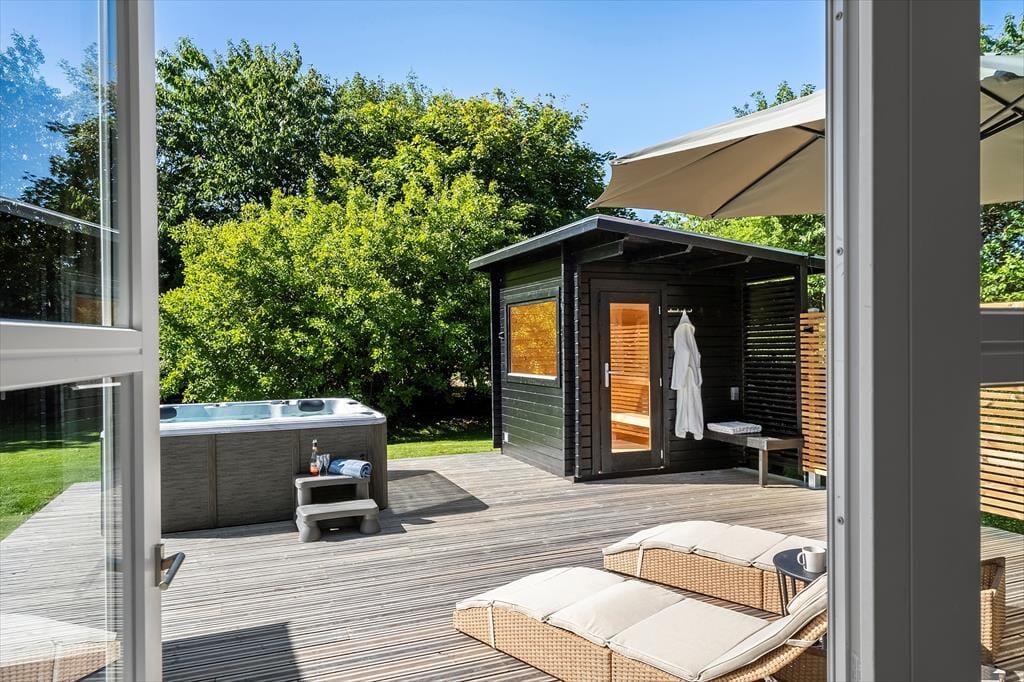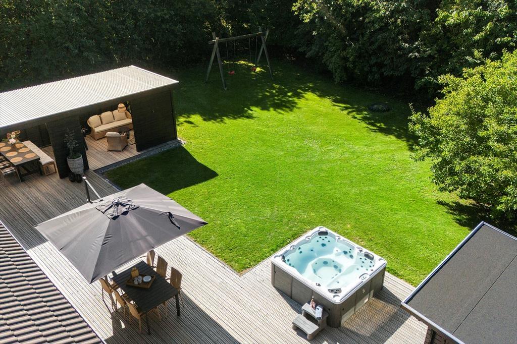 Draußen entfaltet sich die Fyrrealle 3 als wahres Urlaubsparadies. Auf dem komplett uneinsehbaren Grundstück findet ihr mehrere schöne Terrassen – perfekt für Spiel, Entspannung und pure Wohlfühlmomente. Im großen Wellnessbereich im Freien erwarten euch ein beheizter Whirlpool für sechs Personen, eine Sauna und eine solarbeheizte Außendusche – die ideale Kombination nach einem erfrischenden Bad in der Nordsee. Unter dem überdachten Lounge-Bereich könnt ihr den Schatten genießen, Tischfußball spielen oder das Abendessen auf dem Gasgrill zubereiten, begleitet vom Duft des Sommers in der Luft. Die zweite Terrasse bietet euch Tischtennis und Darts, und im Garten können die Kinder auf der Doppelschaukel herrlich toben. Und: Auf dem eingezäunten Grundstück wachsen Pflaumen und Mirabellen– eine süße Kostprobe des dänischen Sommers direkt vor eurer Tür.