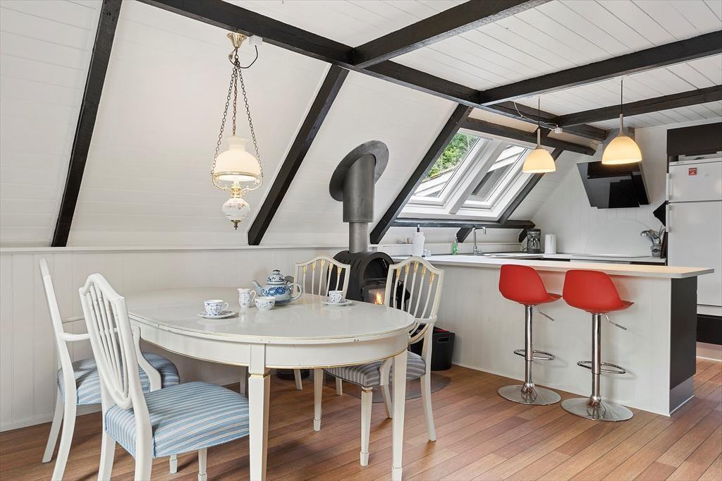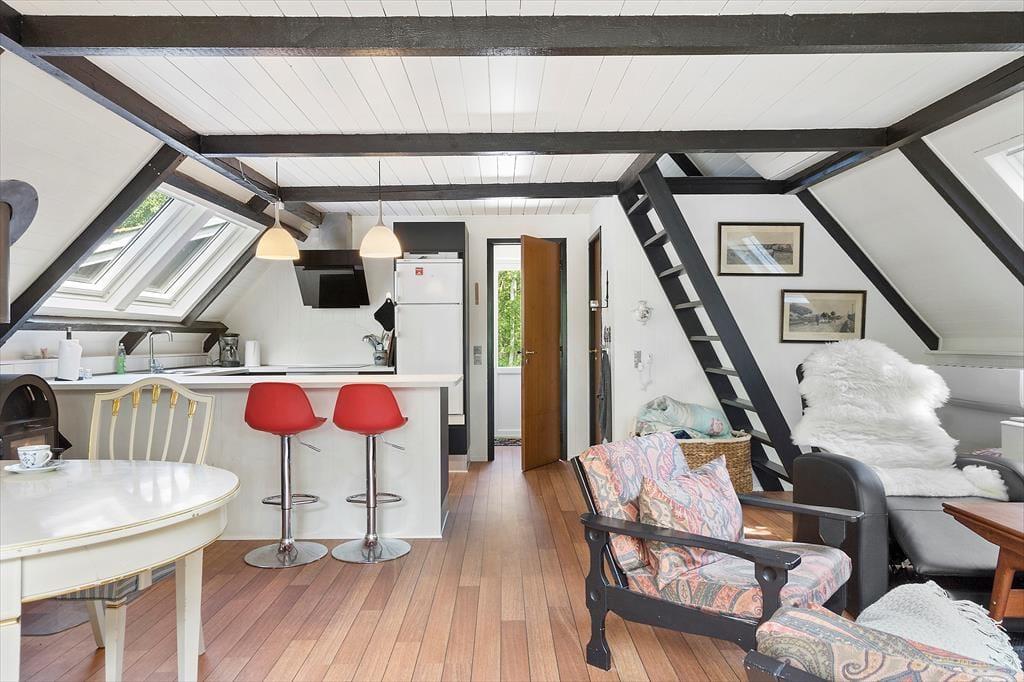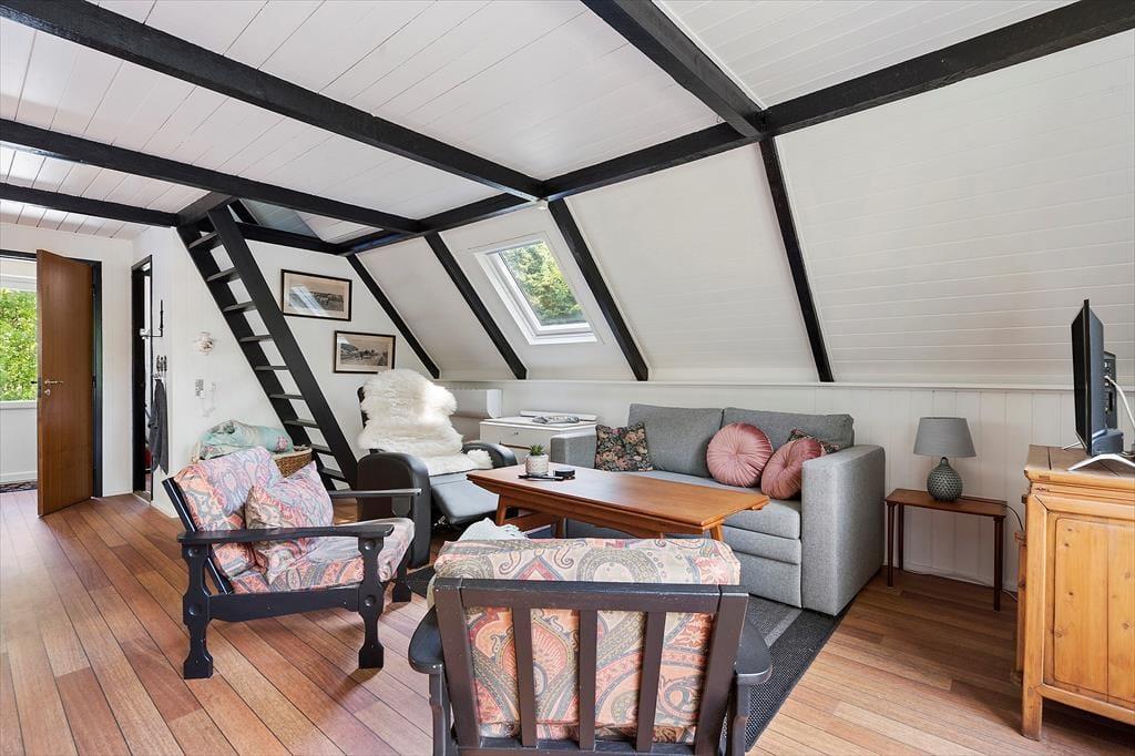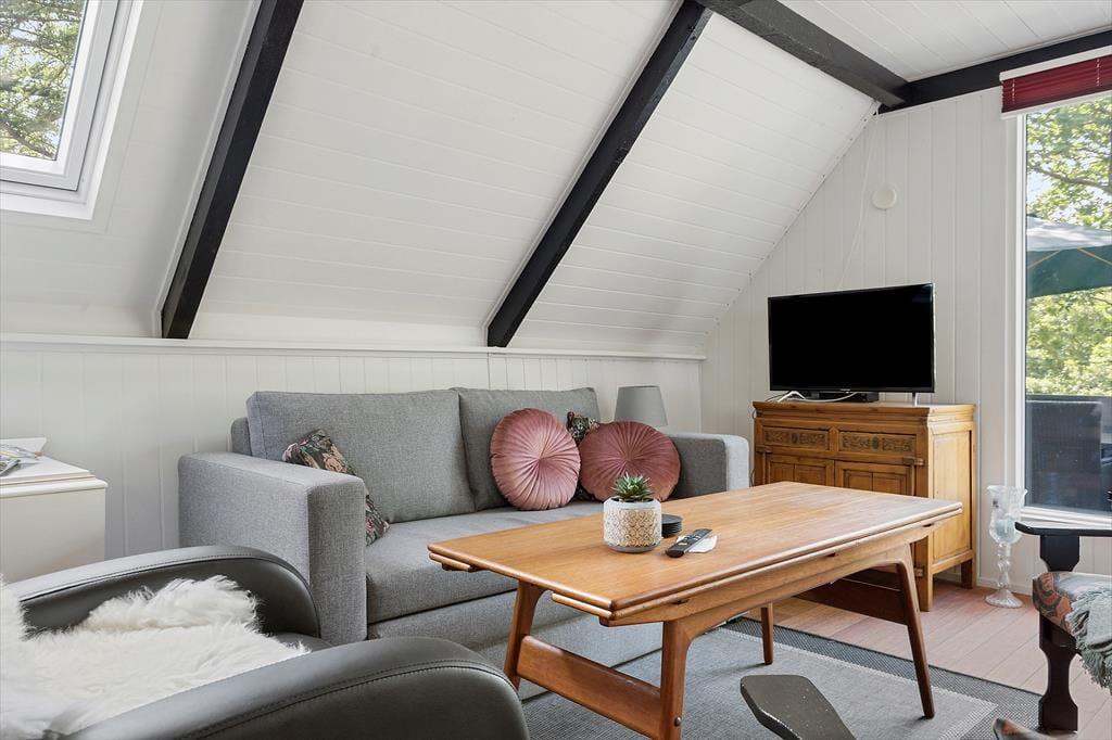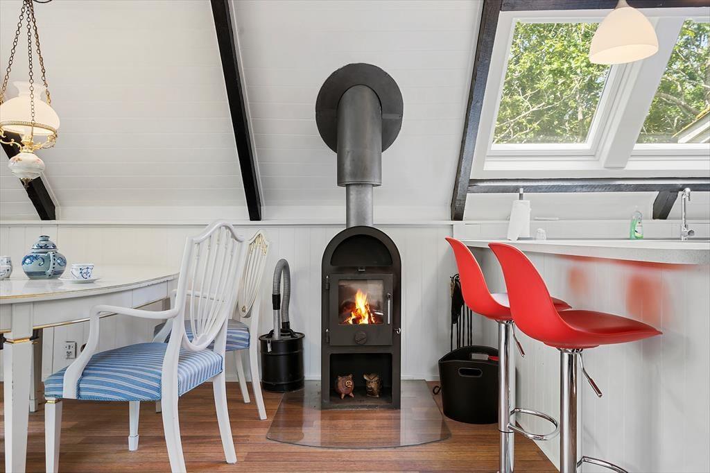Um zum Haus zu gelangen, folgen Sie einer kleinen Straße, die von grünen Bäumen umgeben ist. Und das Wohngefühl mitten im Wald lässt sich auch drinnen spüren, denn Sie blicken direkt auf die grüne Üppigkeit - vom Aufwachen im Schlafzimmer bis zum gemütlichen Beisammensein mit der Familie im Wohnzimmer. Im offenen Küchenbereich lassen die schrägen Fenster zusätzliches Licht herein, und in der Mitte des Wohnraumes steht ein Holzofen bereit, wenn das Wetter es erlaubt, die Temperatur etwas höher zu stellen. Der Esstisch ist ein schöner Mittelpunkt für leckere Mahlzeiten und die Sofalandschaft lädt zum Entspannen ein – mit guten Büchern, Stricken oder einem Film auf dem Flachbildfernseher.