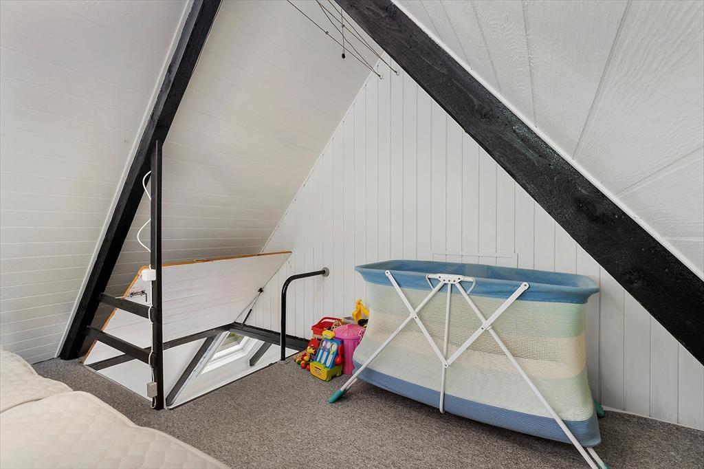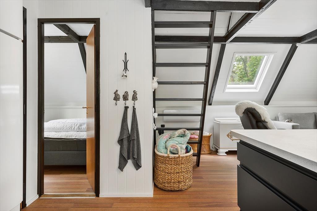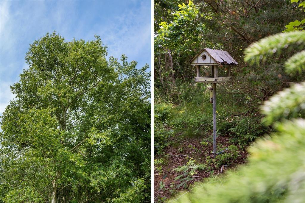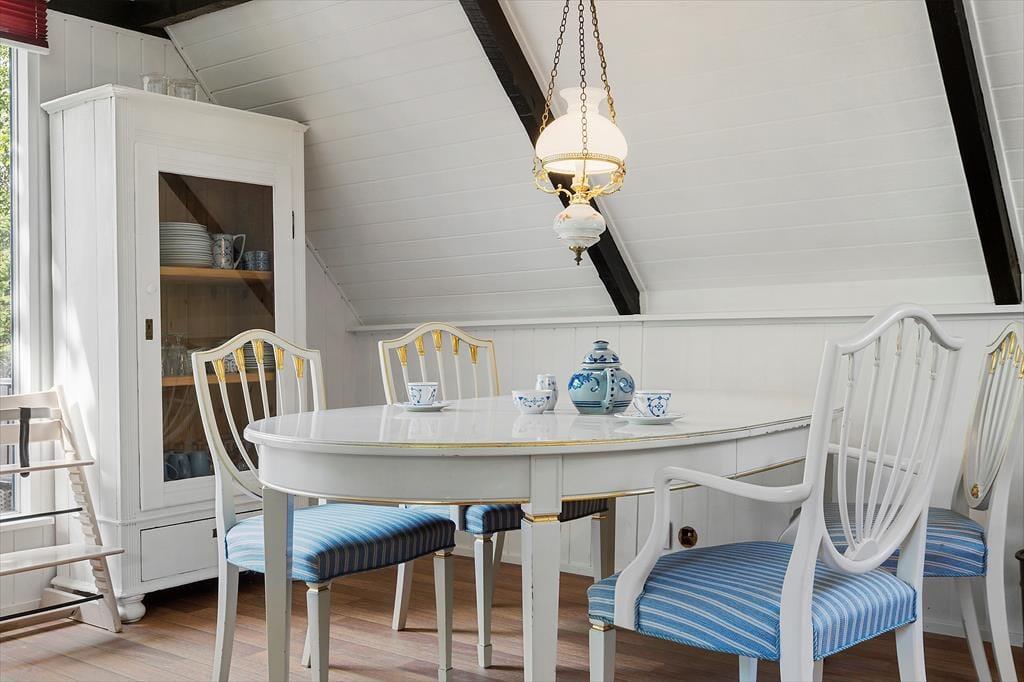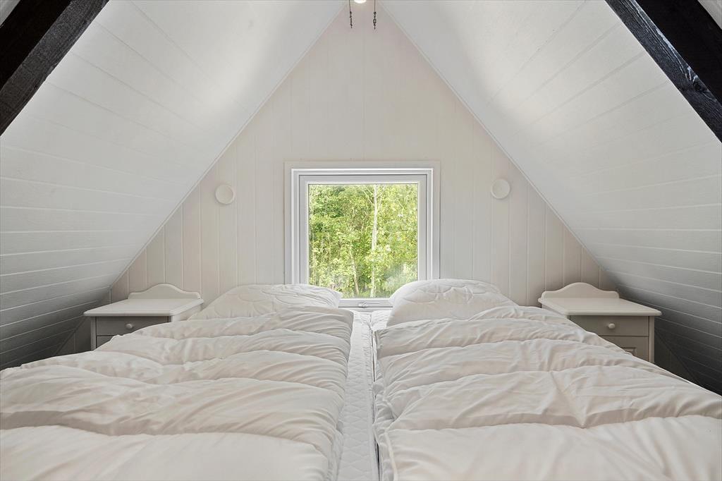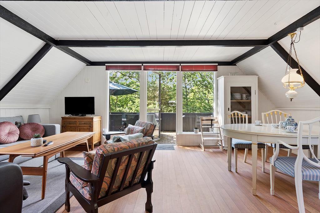 Um zum Haus zu gelangen, folgen Sie einer kleinen Straße, die von grünen Bäumen umgeben ist. Und das Wohngefühl mitten im Wald lässt sich auch drinnen spüren, denn Sie blicken direkt auf die grüne Üppigkeit - vom Aufwachen im Schlafzimmer bis zum gemütlichen Beisammensein mit der Familie im Wohnzimmer. Im offenen Küchenbereich lassen die schrägen Fenster zusätzliches Licht herein, und in der Mitte des Wohnraumes steht ein Holzofen bereit, wenn das Wetter es erlaubt, die Temperatur etwas höher zu stellen. Der Esstisch ist ein schöner Mittelpunkt für leckere Mahlzeiten und die Sofalandschaft lädt zum Entspannen ein – mit guten Büchern, Stricken oder einem Film auf dem Flachbildfernseher.