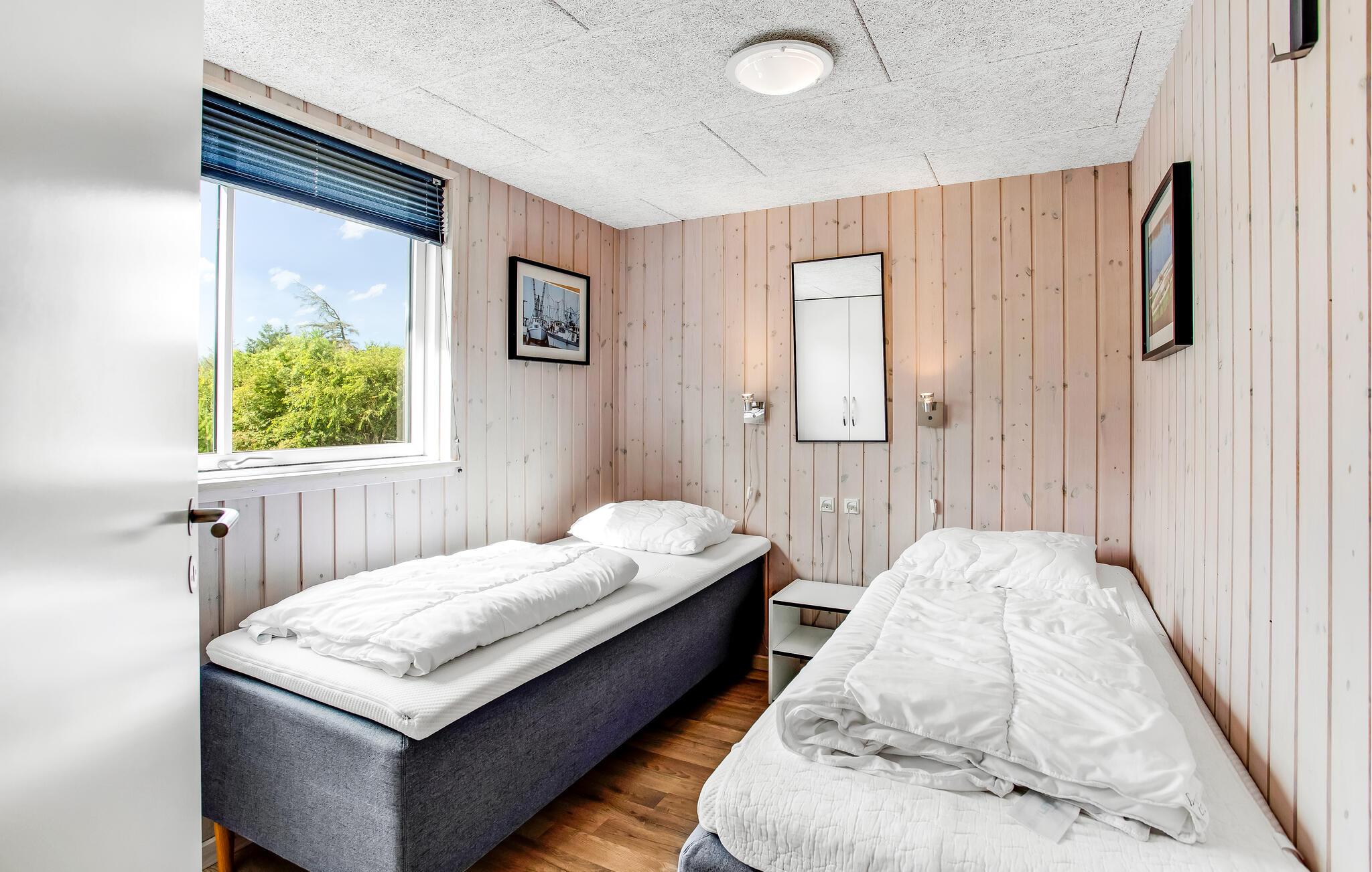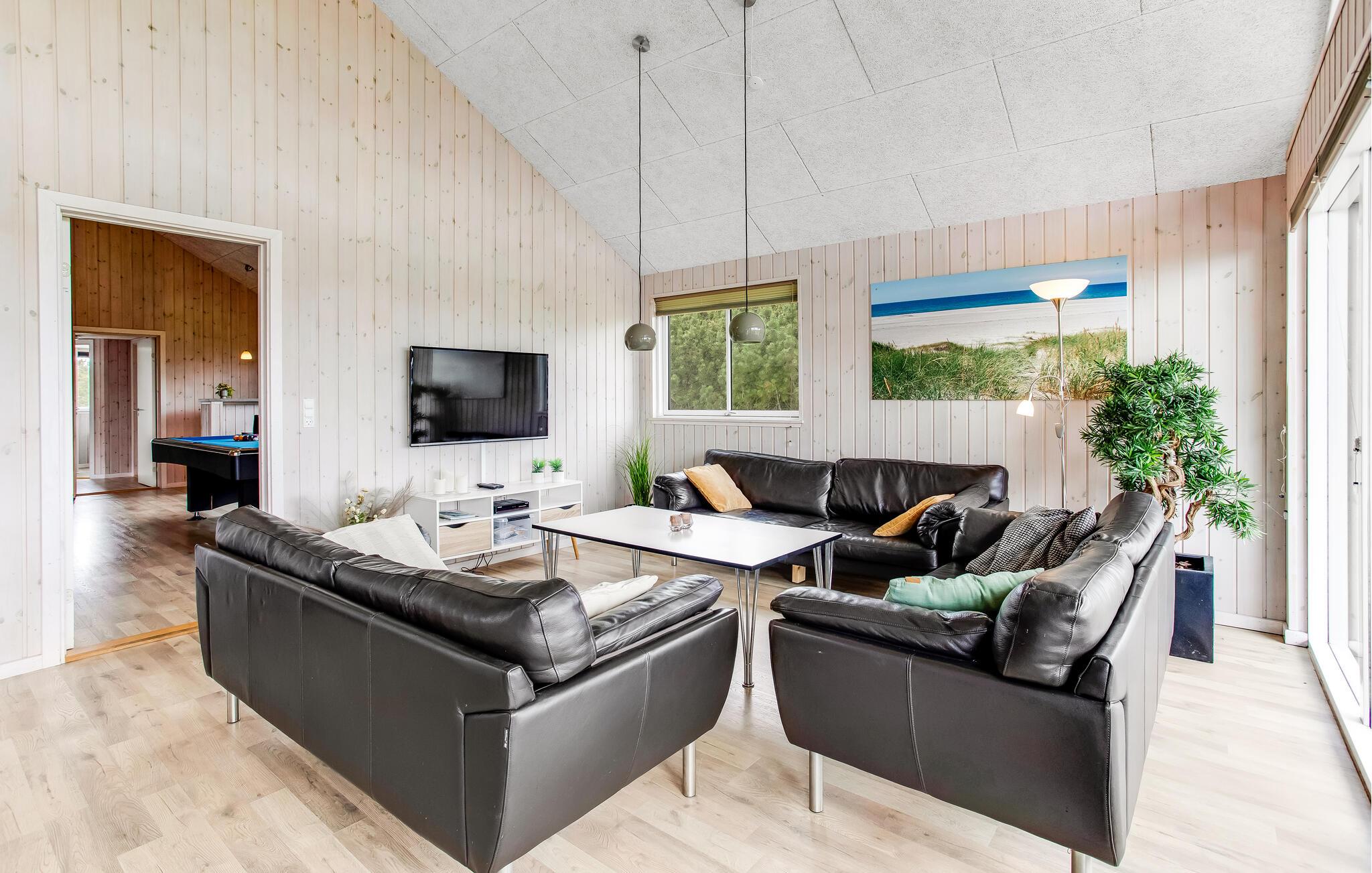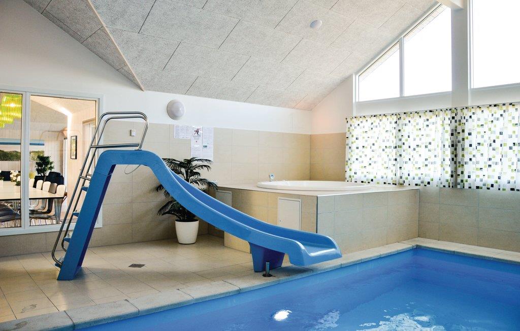 Aufgrund seiner guten Lage alleine ist dieses Ferienhaus schon einzigartig, es besitzt eine herrliche Panoramaaussicht und im Inneren erwartet Sie eine erstklassige Einrichtung. Es beherbergt 6 gute Schlafzimmer und einen Schlafboden für 4 Personen. Die Wohnküche ist groß, der Poolraum mit Whirlpool und Sauna sehr einladend. Es gibt auch 3 Badezimmer und Spielzimmer mit diverser Unterhaltung. Draußen genießen Sie auf der überdachten Terrasse die Sonne, Ihre Kinder können in der Sandkiste spielen oder schaukeln. Sie wohnen in Lodbjerghede, in einer schönen Ferienhaussiedlung, die aufgrund ihrer Ruhe und dem kurzen Abstand zu allerlei Einrichtungen sehr beliebt ist. Es gibt u. a. einen Angelsee, einen großen Golfklub mit einem 9-Loch-Platz für Anfänger und einem mit 18 Löchern für Fortgeschrittene sowie mehrere Spielplätze für Kinder. Nicht weit entfernt liegt auch Søndervig, ein Ferienort mit Geschäften, Cafés, Restaurants, Bowling und Fahrradverleih. Der Ort ist im Sommer sehr lebhaft. Machen Sie einen Ausflug an die Nordsee und lassen Sie sich vom unendlichen Horizont faszinieren. Ringkøbing ist ein alter Ort mit gepflasterten Straßen, einem Fischrestaurant am Hafen und viel mehr. Zum Windsurfen fahren Sie an den Fjord. Am Baggersvej finden sich Anfänger wie Geübte aus vielen verschiedenen Nationen zu diesem Sport ein. WC und Parkplatz sind auch vorhanden. Führ Fahrradtouren in der Region, es gibt sehr gepflegte Radwege, können Sie in Søndervig ein Fahrrad mieten.