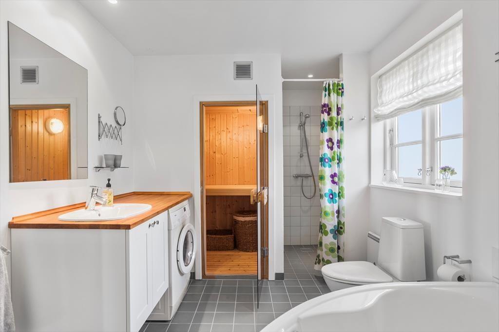 Badezimmer mit Dusche, Whirlpool, Badewanne und Sauna. Eine schöne Wohnküche mit Essbereich direkt neben der Küche, sowie Holzofen und Wärmepumpe, sowie ein gemütliches Wohnzimmer mit Fernseher, und 2 Ausgänge von Küche und Wohnzimmer zu einem fantastischen teilweise überdachte Terrasse, auf der Sie die wunderschöne Aussicht auf das Meer genießen können.