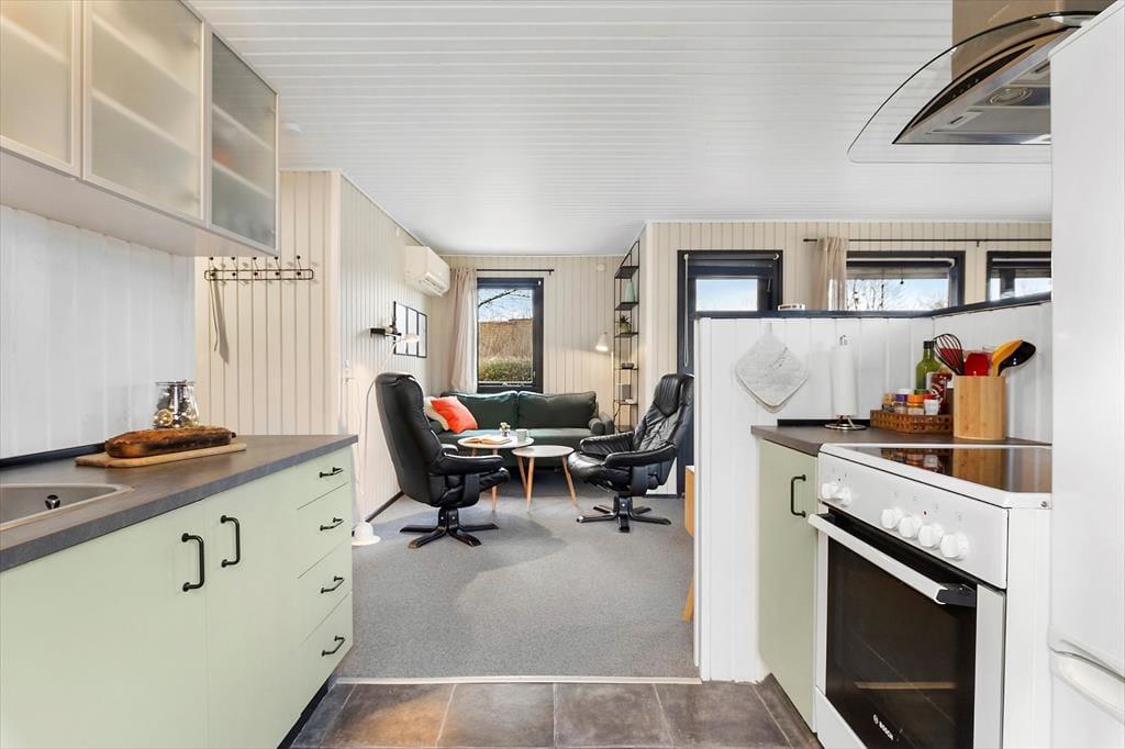Schon beim Betreten empfängt Sie eine warme und heimelige Atmosphäre, in der das Tageslicht die Räume durchflutet und für wohltuende Ruhe sorgt. Die Einrichtung ist schlicht und gemütlich, sodass Sie sich vom ersten Moment an wie zu Hause fühlen können. Das Wohnzimmer lädt zu entspannten Stunden auf dem Sofa ein, während der Kaminofen im Hintergrund leise knistert und an kühleren Tagen Wärme und Behaglichkeit verbreitet. Hier lässt es sich wunderbar mit einem guten Buch entspannen, gemeinsam spielen oder einfach den Gedanken freien Lauf lassen, während die Flammen tanzen. Küche und Wohnbereich gehen harmonisch ineinander über, sodass das Beisammensein weitergeht – ganz gleich, ob gekocht oder der Tisch für gemeinsame Mahlzeiten gedeckt wird. Die Stimmung ist ungezwungen und entspannt – genau so, wie man sich Urlaub wünscht – und die Rahmenbedingungen sind ideal für Familien ebenso wie für Paare, die eine ruhige Basis nahe dem Fjord suchen.