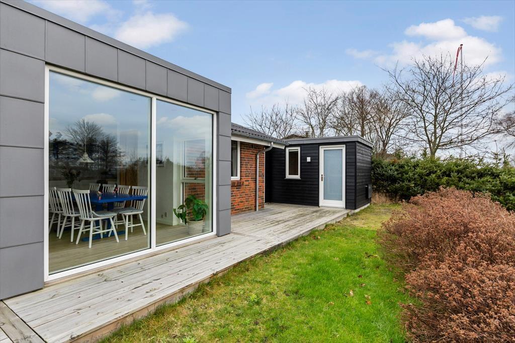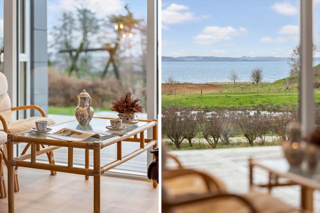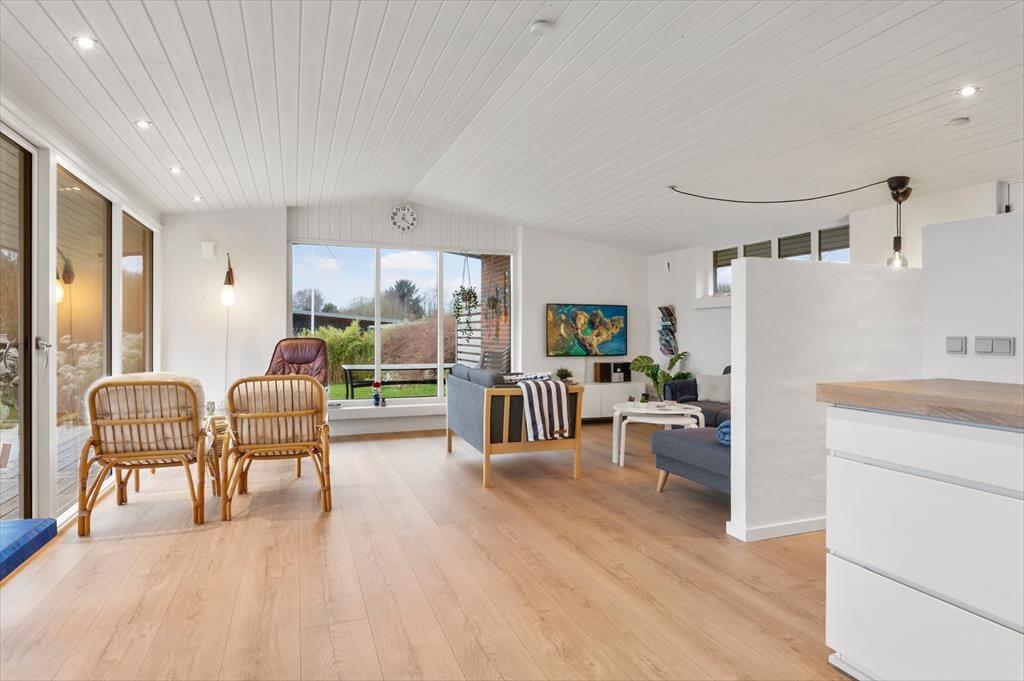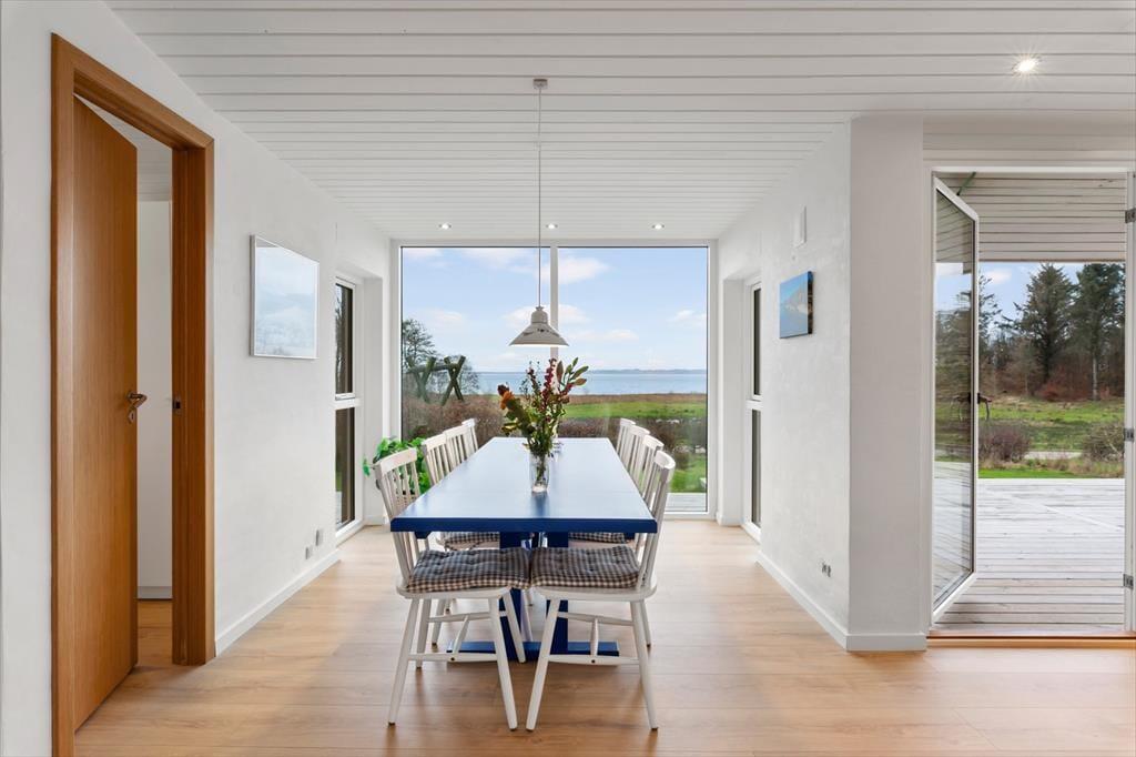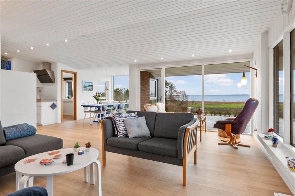Im Inneren empfängt dich eine helle, moderne und einladende Einrichtung, in der die Räume offen und leicht wirken und das Tageslicht ungehindert einfällt und die entspannte Urlaubsstimmung unterstreicht. Das Wohnzimmer ist der natürliche Treffpunkt des Hauses, und hier lässt es sich wunderbar mit einer Tasse Kaffee niederlassen, während der Blick über die wechselnden Farben des Limfjords schweift. Der Panoramablick sorgt für eine besondere Ruhe, die es leicht macht, den Alltag vollständig hinter sich zu lassen. Küche und Wohnbereich sind offen miteinander verbunden, sodass Gespräche ganz selbstverständlich weitergehen – egal, ob gemeinsam gekocht oder am Esstisch gespielt wird. Wenn der Tag sich dem Ende zuneigt, kannst du dich zurückziehen und die Stille genießen, die nur vom Wind und den leisen Geräuschen der umliegenden Natur unterbrochen wird.