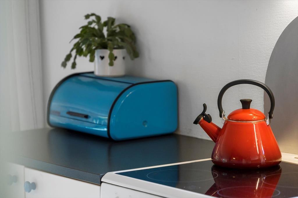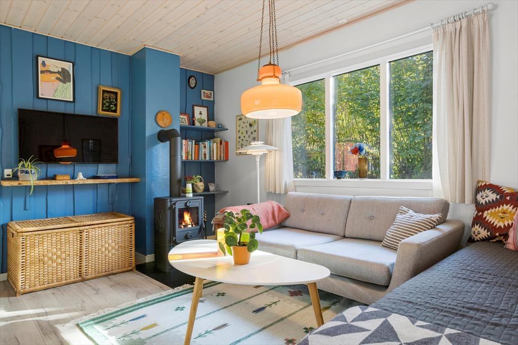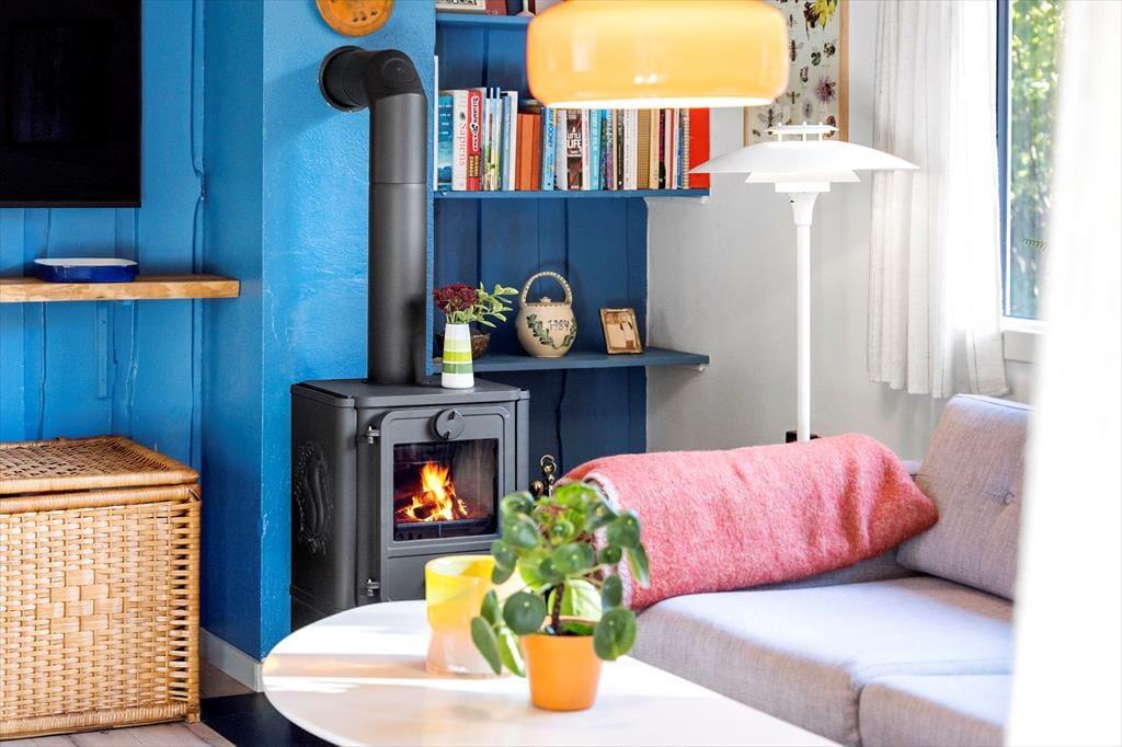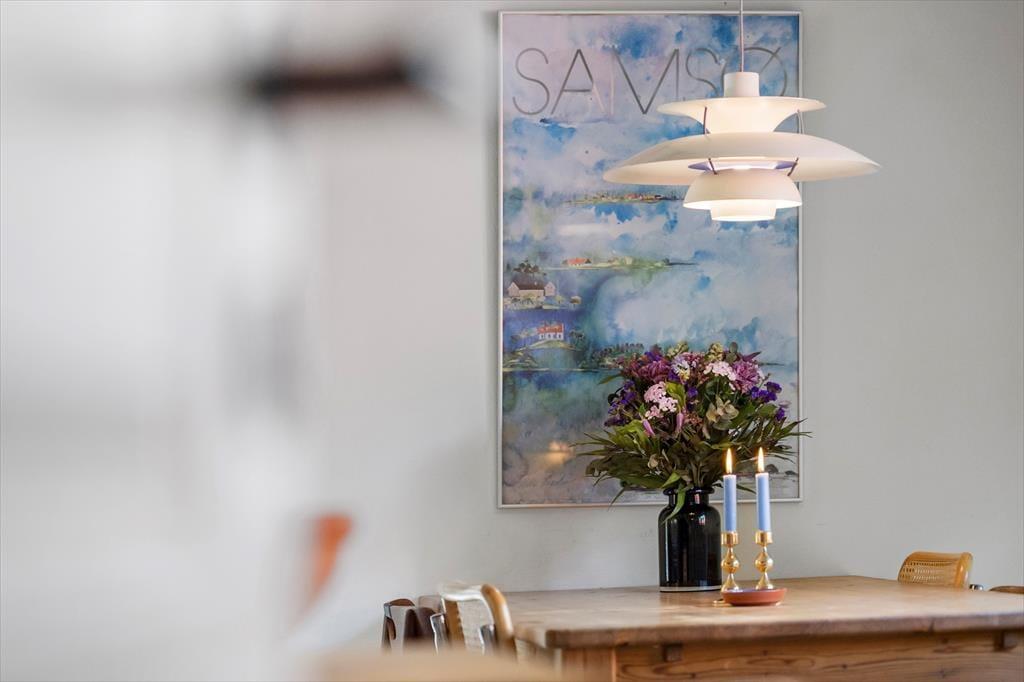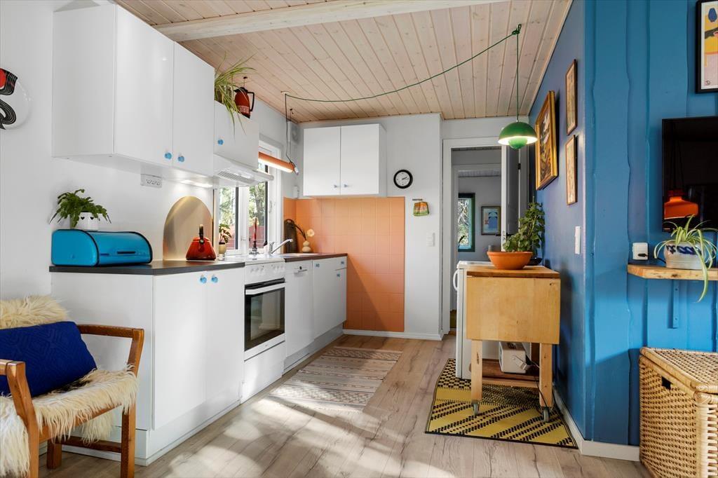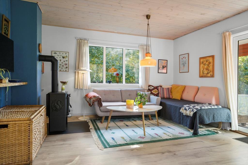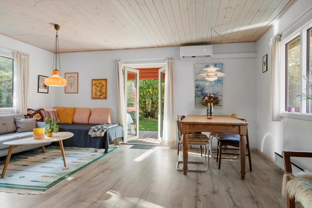 Die Küche und das Wohnzimmer sind miteinander verbunden und bilden den zentralen Raum des Hauses, wo Sie gemeinsam schöne Stunden verbringen können. Die Küche ist funktional und gepflegt, sodass Sie problemlos die Mahlzeiten der Ferien zubereiten und sich am Esstisch versammeln können. Wenn das Wetter es zulässt, können Sie natürlich auch Ihren Morgenkaffee oder das Abendessen mit frischen Samsø-Kartoffeln auf die teilweise überdachte Terrasse mitnehmen. Auf dem Sofa können Sie sich mit einem Buch, einem Spiel oder vielleicht vor dem Fernseher entspannen. Für zusätzliche Sommerhaus-Gemütlichkeit und Wärme können Sie den Kaminofen, der sich in der Ecke des Wohnzimmers befindet, anzünden. Vom Wohnzimmer aus gelangen Sie leicht durch die Terrassentür auf die überdachte Terrasse, sodass diese im Sommer als zusätzlicher Raum genutzt werden kann.
