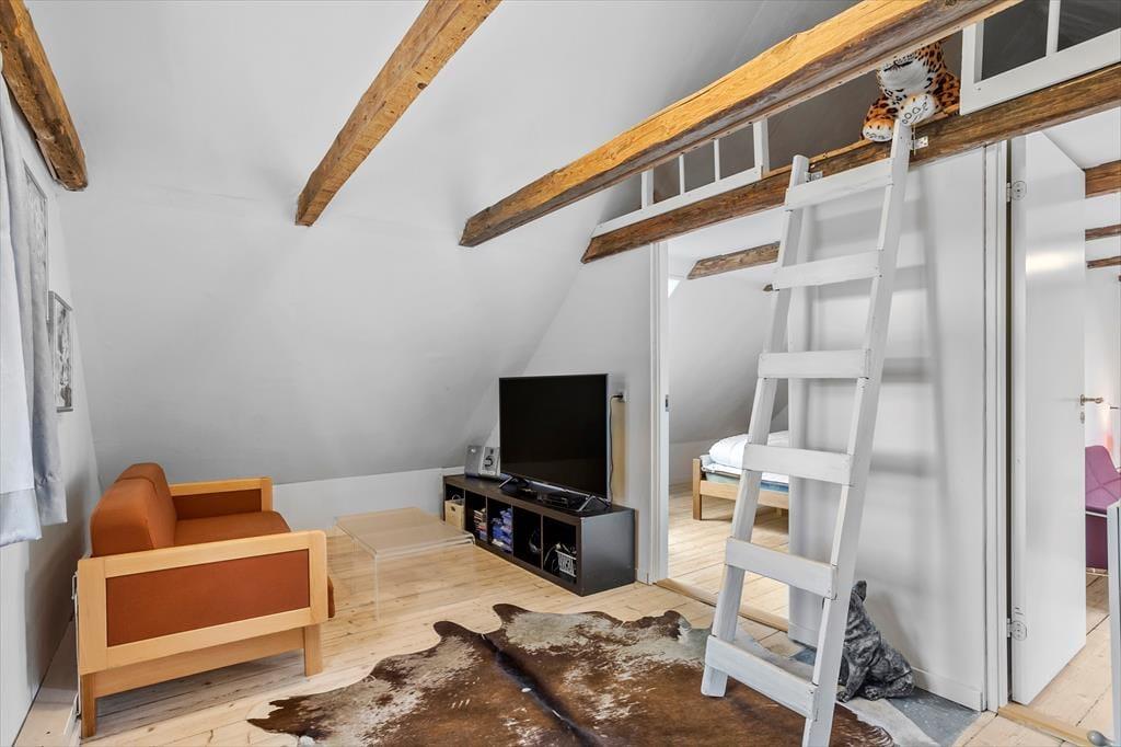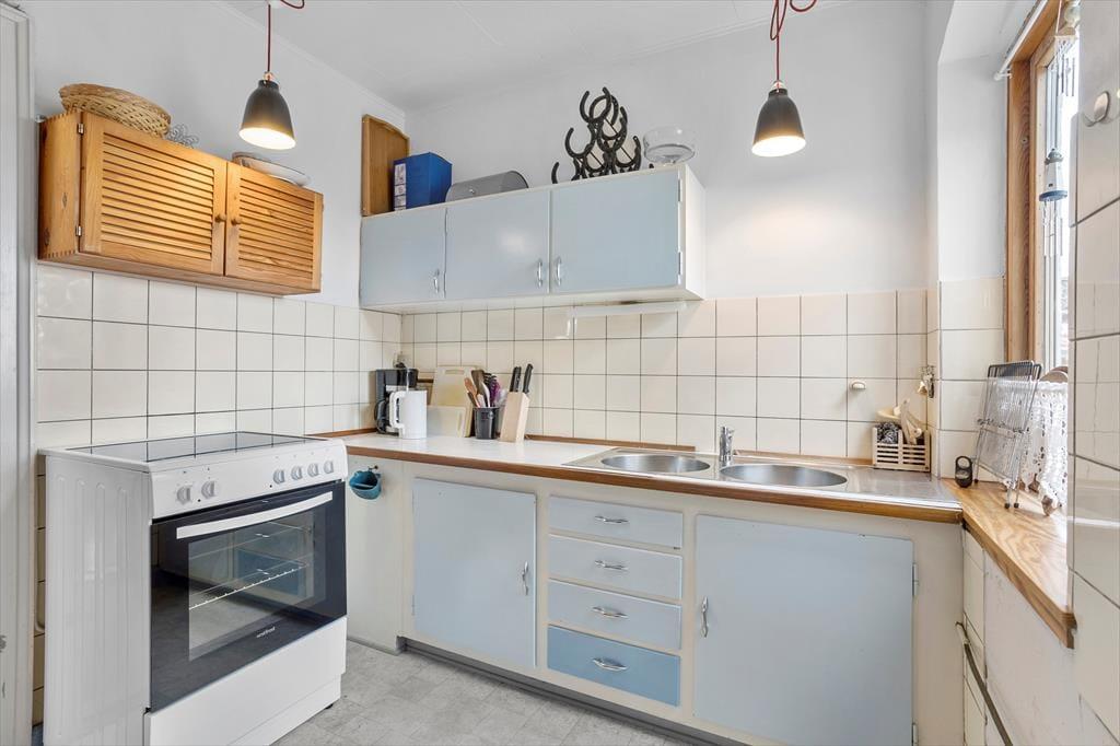 Wenn du das Haus betrittst, wirst du von einer wunderbaren Atmosphäre empfangen. Die weiß gestrichenen Sichtbalken im kombinierten Ess- und Wohnzimmer schaffen eine gemütliche und einladende Stimmung. Hier kannst du lange Mahlzeiten am Esstisch genießen oder dich im Wohnzimmer bei einem guten Film entspannen. Die charmante Küche ist im alten Stil gehalten, bietet jedoch alles, was du brauchst, um leckere Mahlzeiten zuzubereiten. Im Obergeschoss findest du auch ein kleines Wohnzimmer, in das du dich mit einem guten Buch oder einer Tasse Kaffee zurückziehen und eine ruhige Zeit genießen kannst.