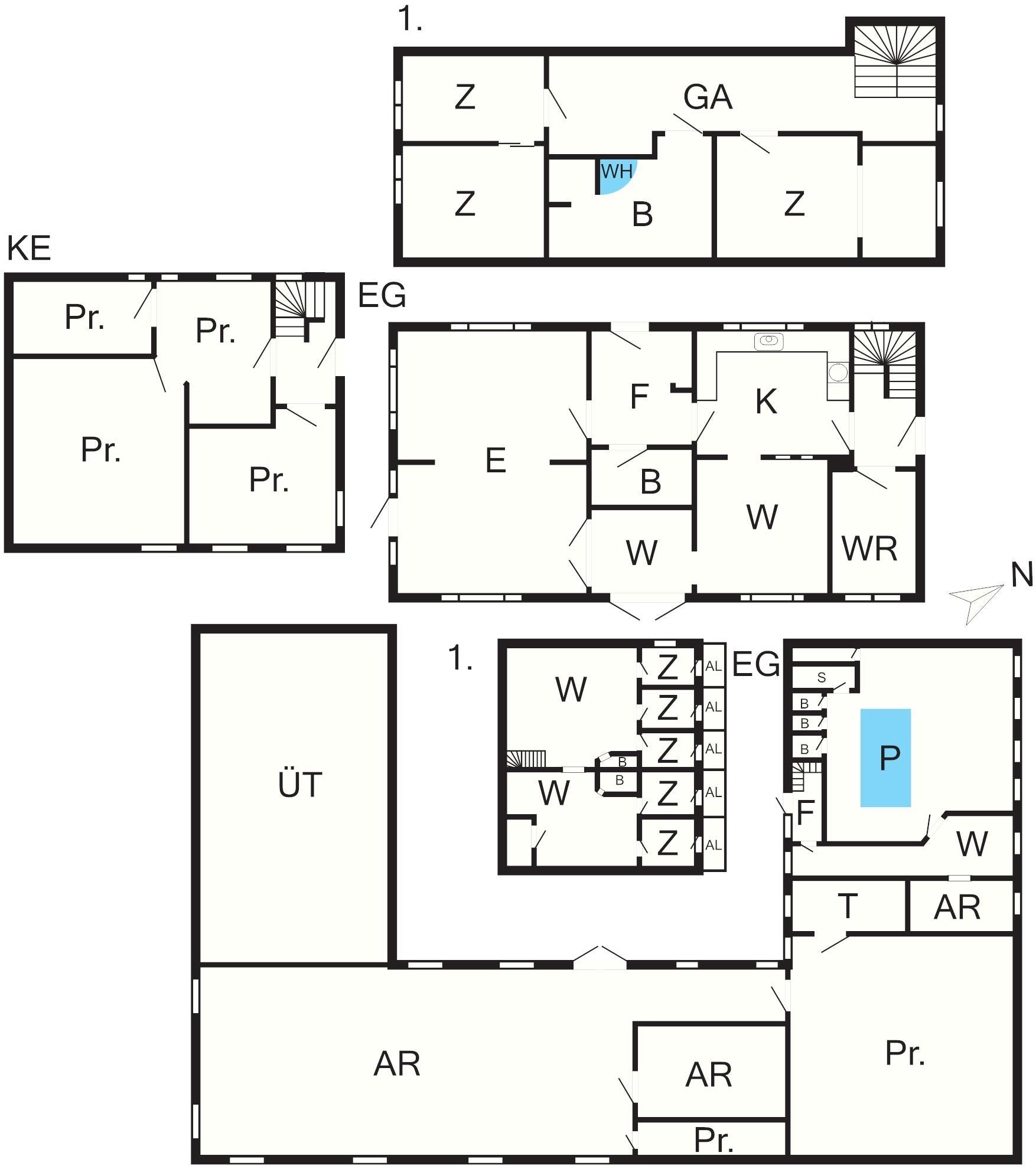 Im ersten Stock befinden sich zwei große Schlafzimmer mit je einem Doppelbett und zwei Einzelbetten, ein Flur und ein Badezimmer mit Doppelwhirlpool, Dusche, Duschkabine und Toilette. Im zweiten Gebäude befinden sich der Poolbereich, die Sauna, der Bad-/Duschbereich und das Aktivitätszentrum.