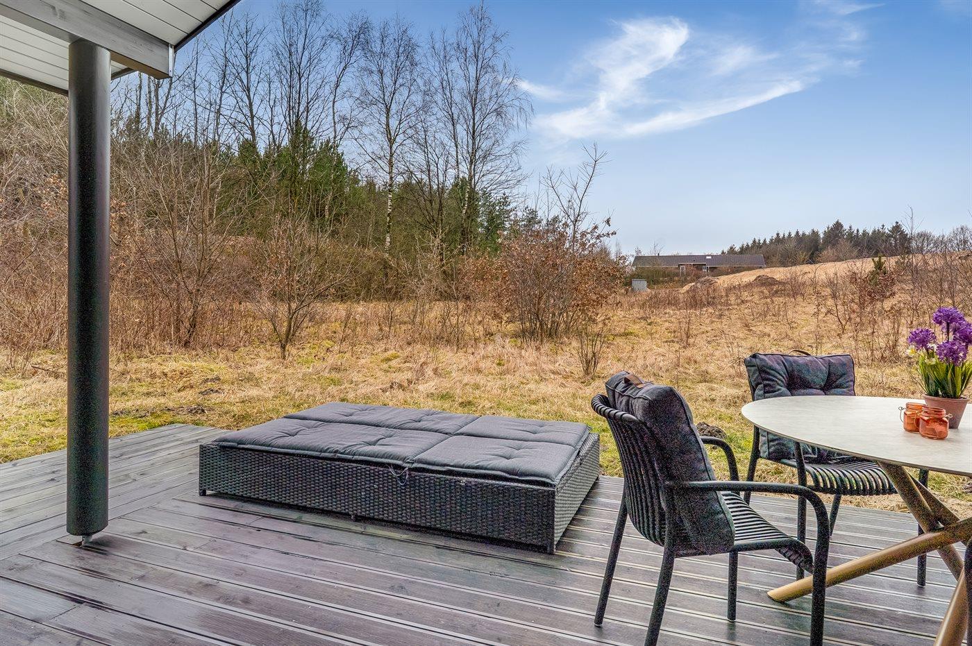 The holiday home is situated on a 1629 m² natural site. Situated 250 m from lake. Nearest shop is 5000 m away. A terrace belong to the holiday home. Furthermore the house has a covered terrace. Parking place by the holiday home.
