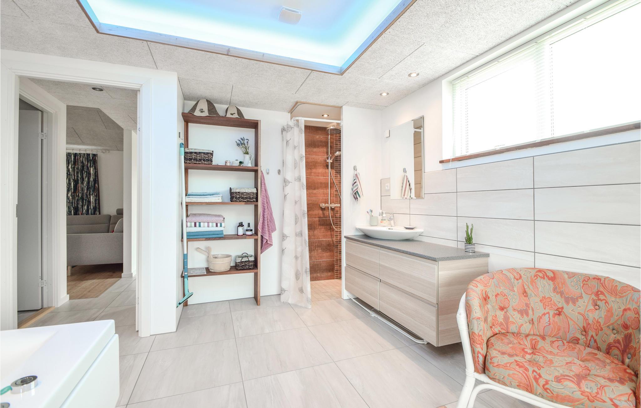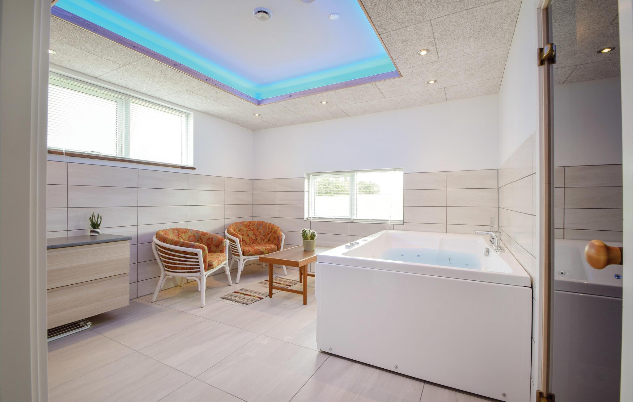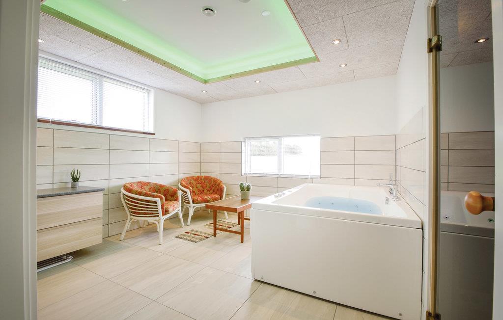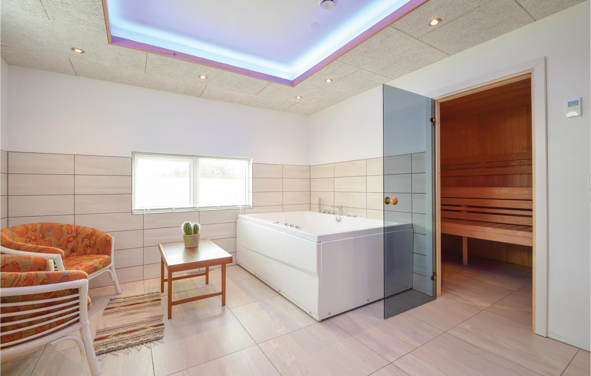 Das Wohnzimmer liegt in offener Verbindung zur modernen Küche. Es gibt insgesamt drei Badezimmer, von denen das eine eine echte Wellnessoase ist. Dort gibt es einen Jacuzzi, eine Sauna und die farbliche Beleuchtung hat eine beruhigende Wirkung.