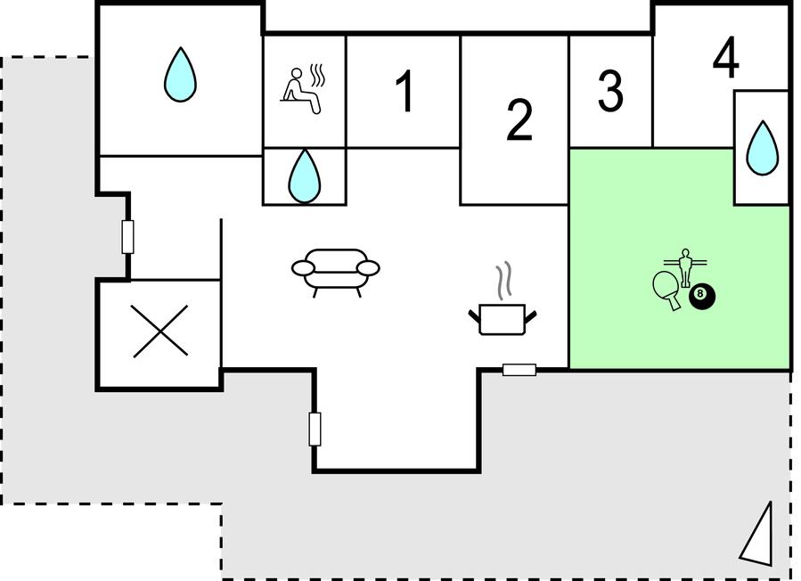 Der großzügig eingerichtete Wohnraum bietet sowohl Essplatz als auch Sitzecke. Es gibt schnelles WLAN und Apple TV, jedoch weder Sattelit- oder Kabelanschluss. Im großen Aktivitätsraum steht ein Air-Hockey-Spieltisch.