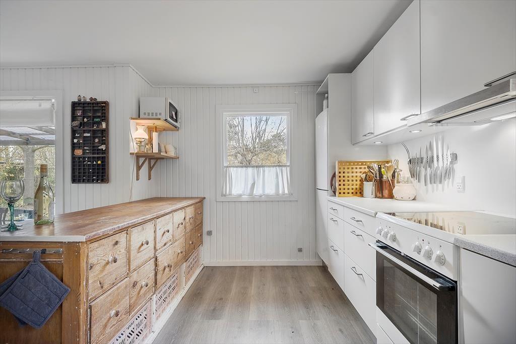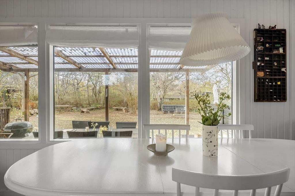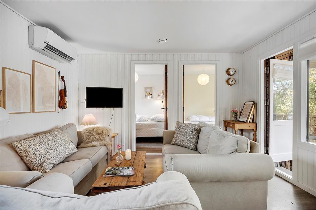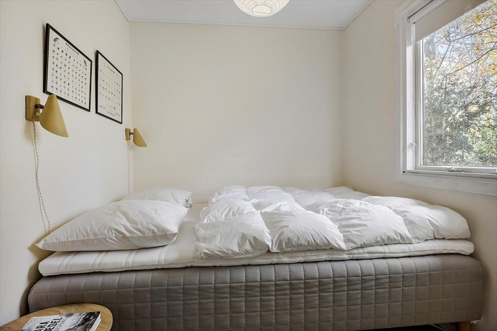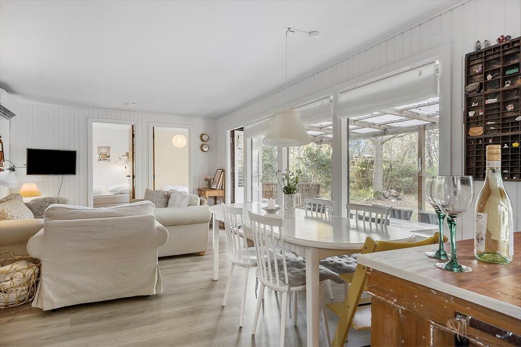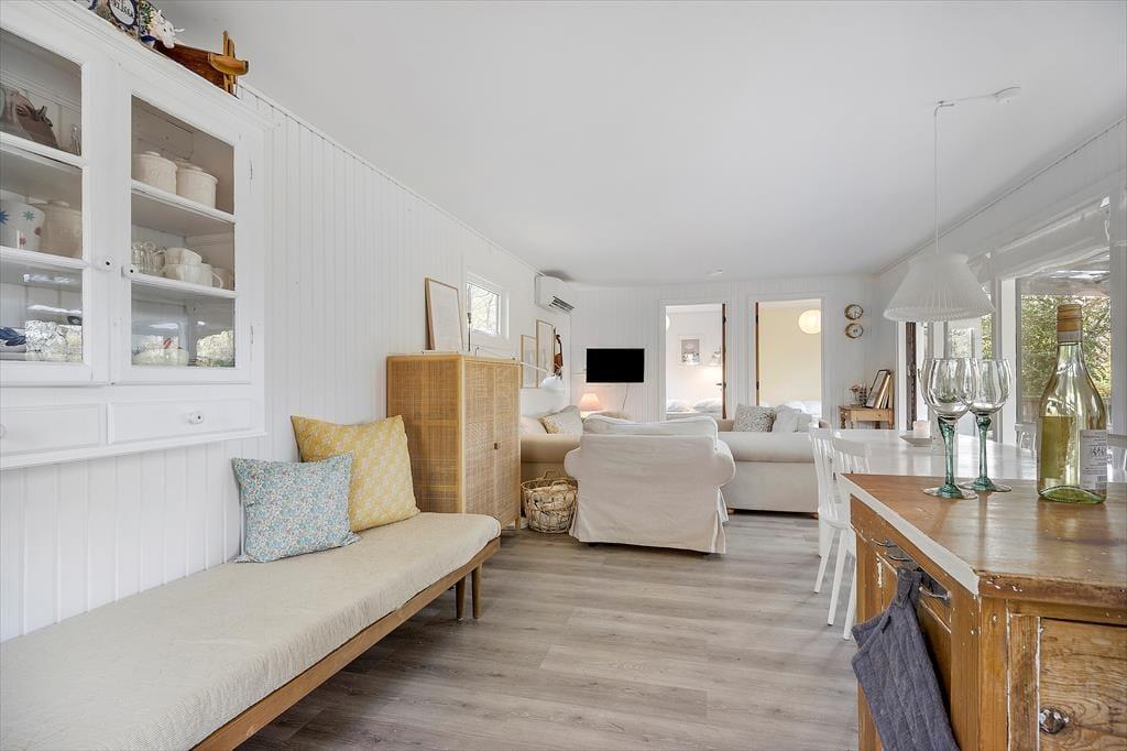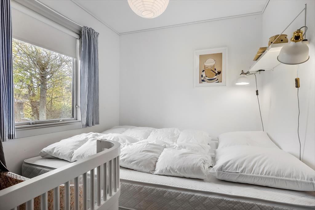 Willkommen in deinem Ferienhaus: Das Haus ist in einem hellen und komfortablen Sommerhausstil eingerichtet, der ihm seinen eigenen Charme verleiht. Nehmen Sie sich Zeit für familienfreundliche Aktivitäten im gemütlichen, hellen Wohnzimmer mit offener Küche, wo die Familie sich zu den Mahlzeiten versammeln oder abends ein Brettspiel spielen kann. Das Haus verfügt über ein kleines Badezimmer mit Dusche hinter der Toilettentür und zwei Schlafzimmer mit Doppelbetten. In einem der Zimmer befindet sich außerdem ein schönes Kinderbett. Das Haus eignet sich daher besonders gut für eine kleine Familie oder ein Paar.