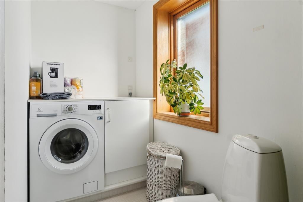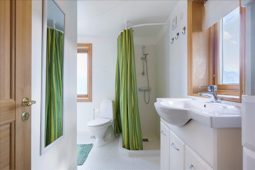 Das schöne, große Badezimmer beinhaltet eine Duschnische, ein WC, ein Waschbecken und eine Waschmaschine.