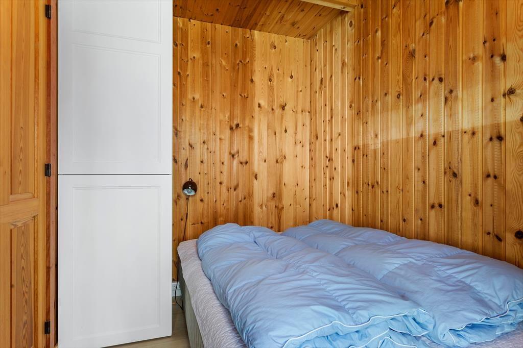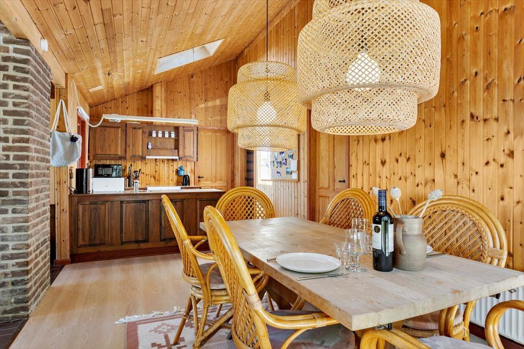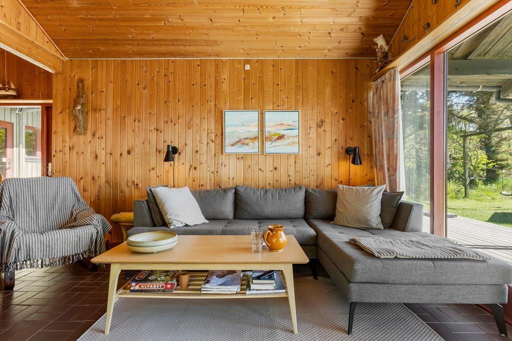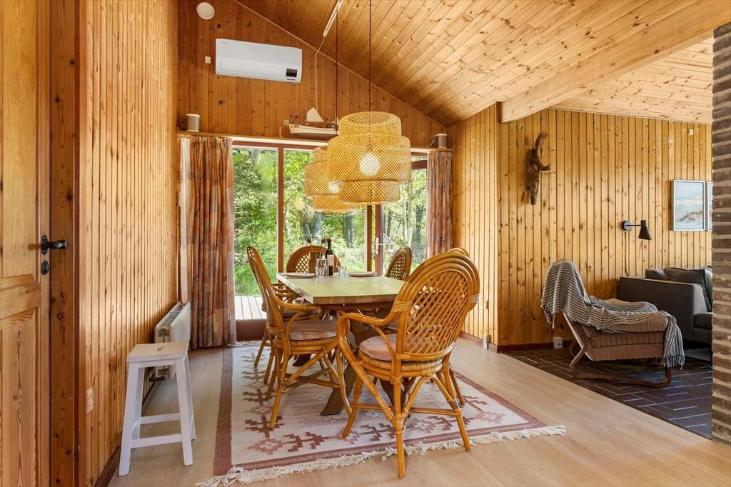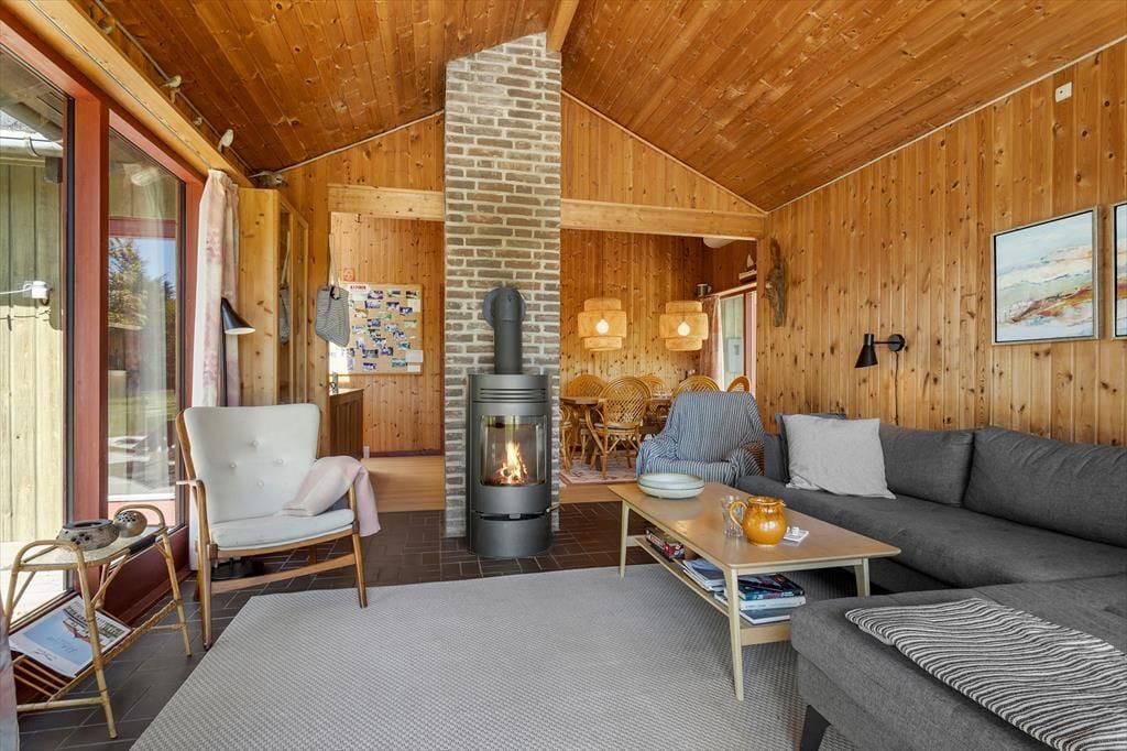 Das Sommerhaus dient als gemütliche Ferienwohnung für bis zu sechs Personen, und auch ein Hund ist willkommen, wenn dieser zur Familie gehört. Im Inneren gibt es rustikale Holzwände, eine offene Decke und komfortable Möbel, und der Kaminofen im Wohnzimmer sorgt für Wärme und eine angenehme Atmosphäre an Tagen, an denen Sie sich einfach auf dem Sofa mit einem guten Buch, einem Yatzzy-Spiel oder einem Film auf dem Flachbildfernseher entspannen möchten. Die Küche ist auf praktische und gemütliche Weise in das Wohnzimmer integriert, und die Schlafzimmer sind gut im Haus verteilt. Übrigens hat jedes Zimmer eine Glastür zur Terrasse, sodass es einfach ist, nach draußen zu gelangen.