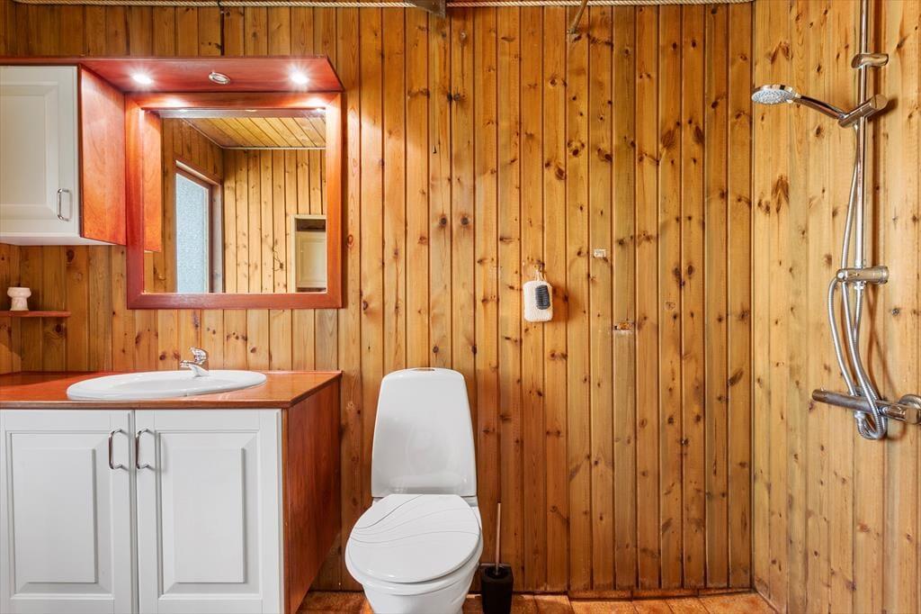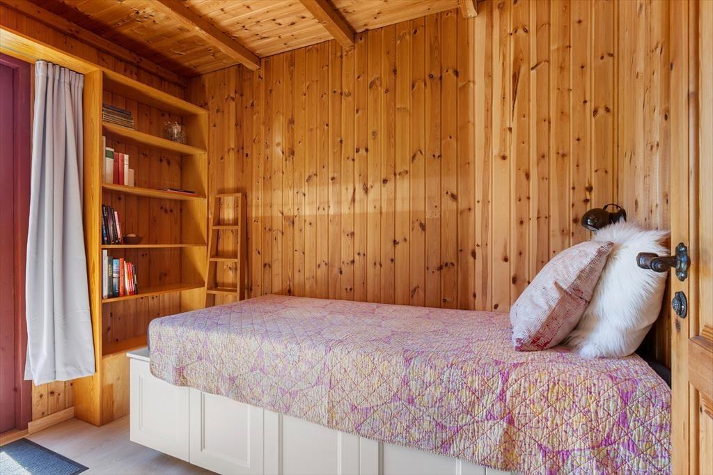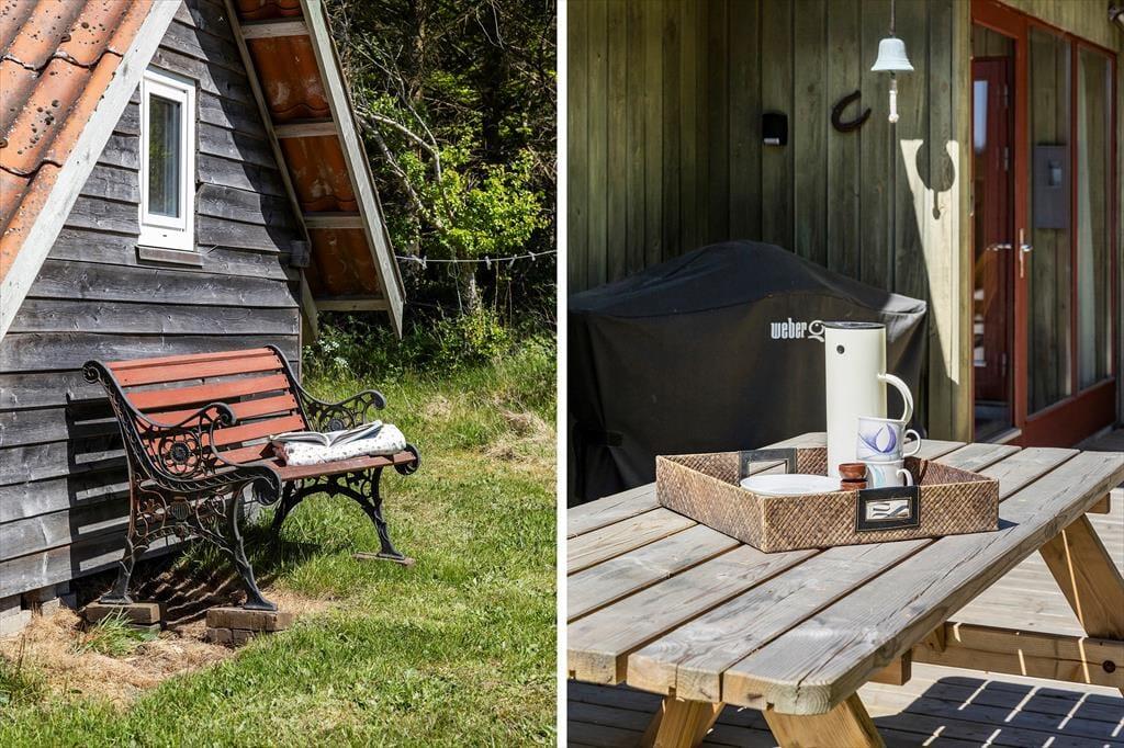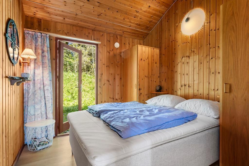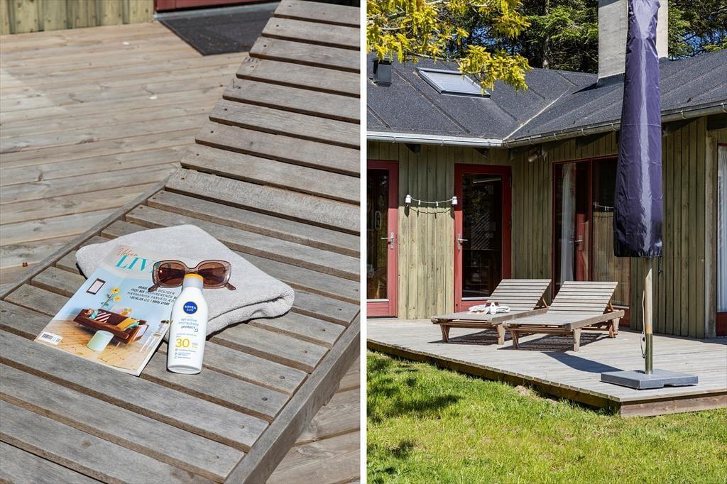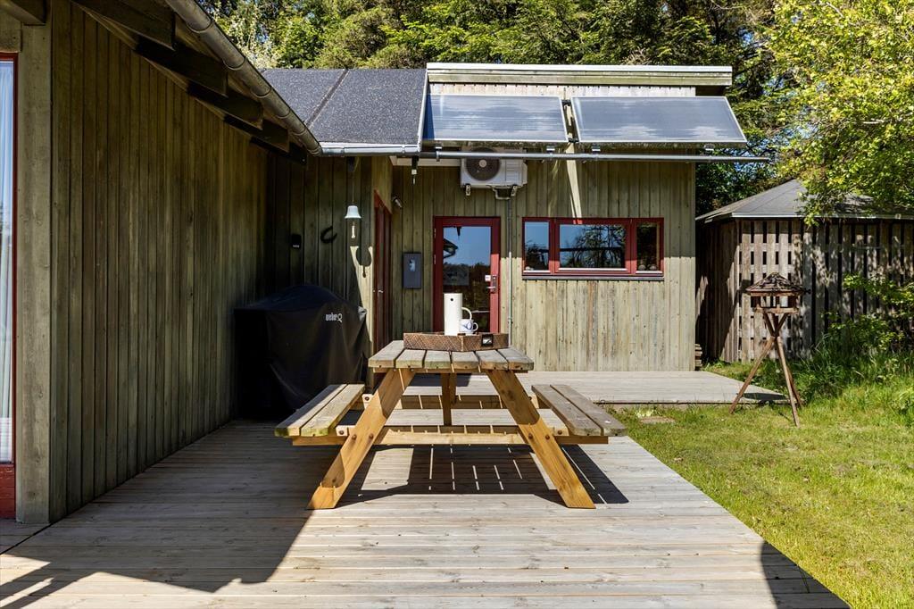 Das Sommerhaus dient als gemütliche Ferienwohnung für bis zu sechs Personen, und auch ein Hund ist willkommen, wenn dieser zur Familie gehört. Im Inneren gibt es rustikale Holzwände, eine offene Decke und komfortable Möbel, und der Kaminofen im Wohnzimmer sorgt für Wärme und eine angenehme Atmosphäre an Tagen, an denen Sie sich einfach auf dem Sofa mit einem guten Buch, einem Yatzzy-Spiel oder einem Film auf dem Flachbildfernseher entspannen möchten. Die Küche ist auf praktische und gemütliche Weise in das Wohnzimmer integriert, und die Schlafzimmer sind gut im Haus verteilt. Übrigens hat jedes Zimmer eine Glastür zur Terrasse, sodass es einfach ist, nach draußen zu gelangen.