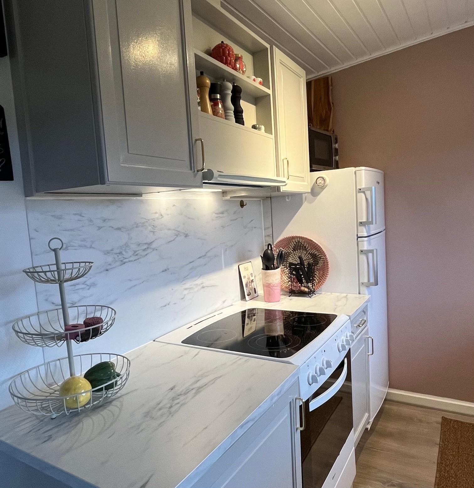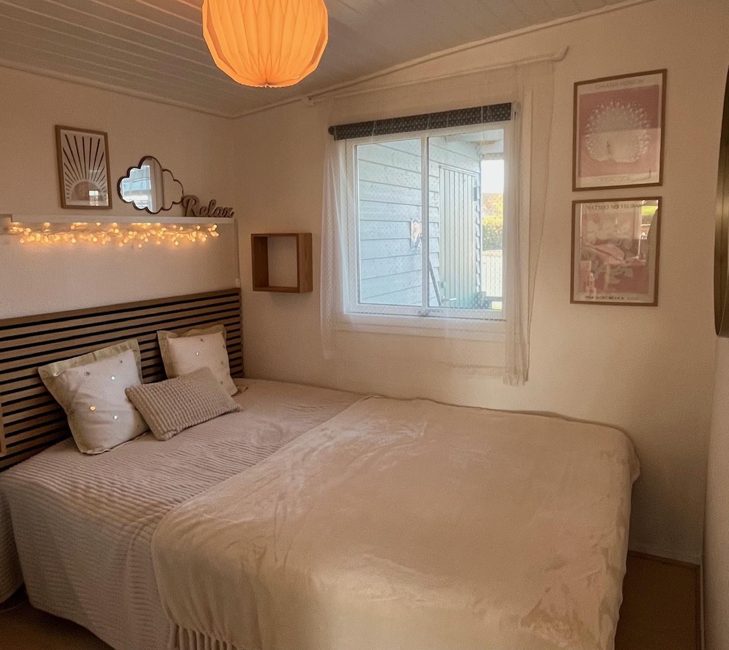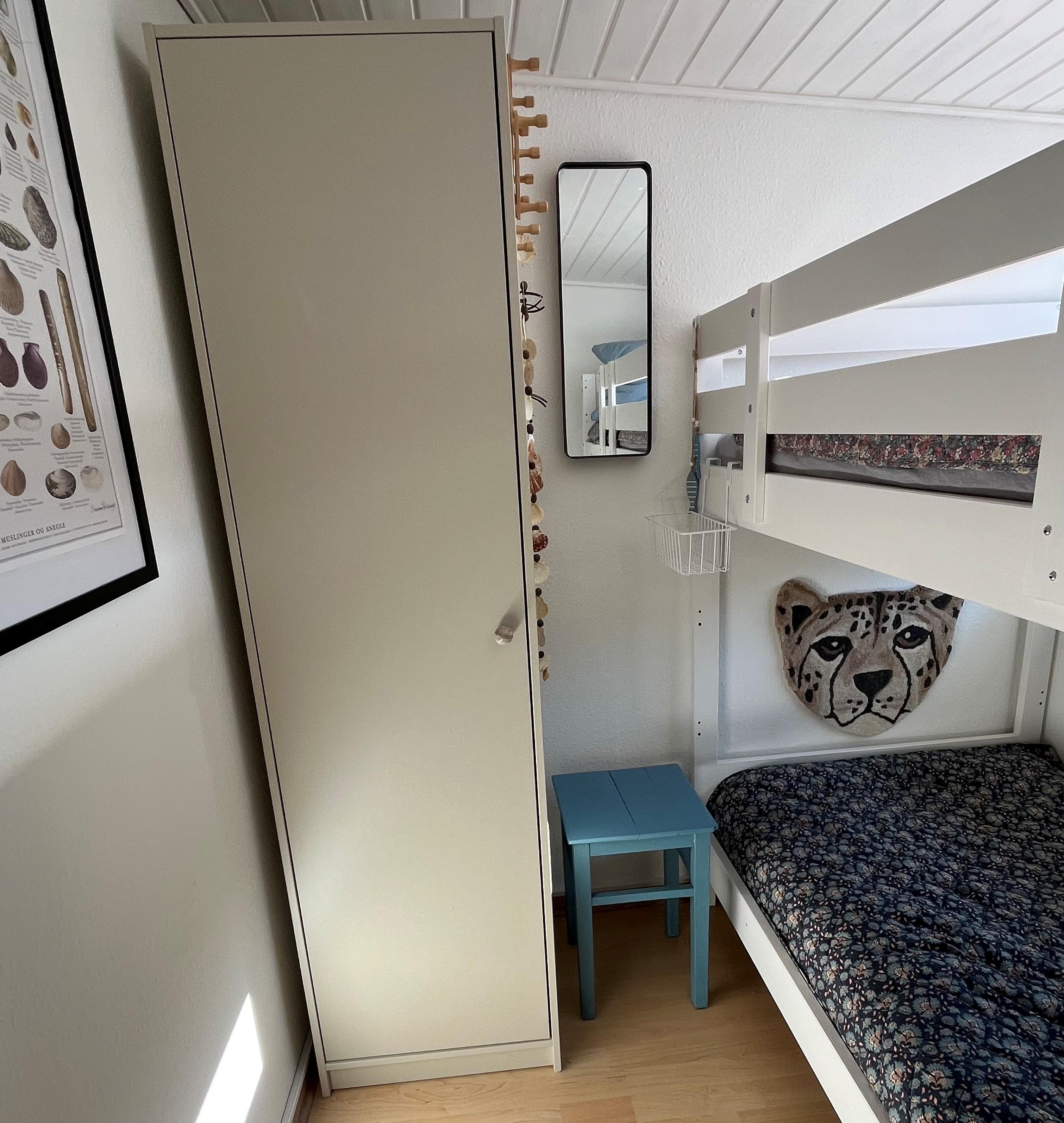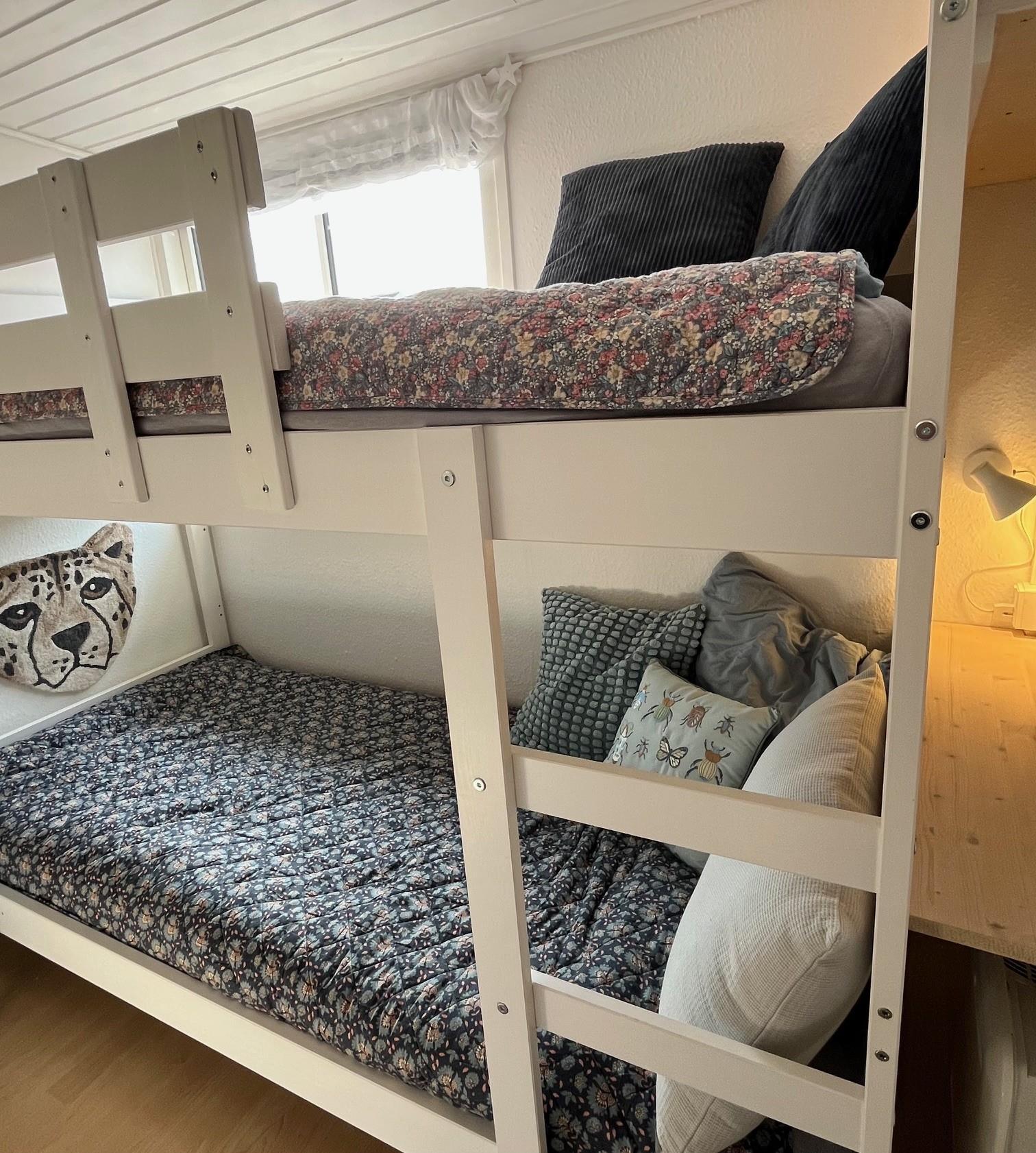 The bedroom is furnished with a 140 cm wide bed. In the extra room, there is a new bunk bed with two sleeping spaces (90x200 cm). Both rooms have a wardrobe for clothes.