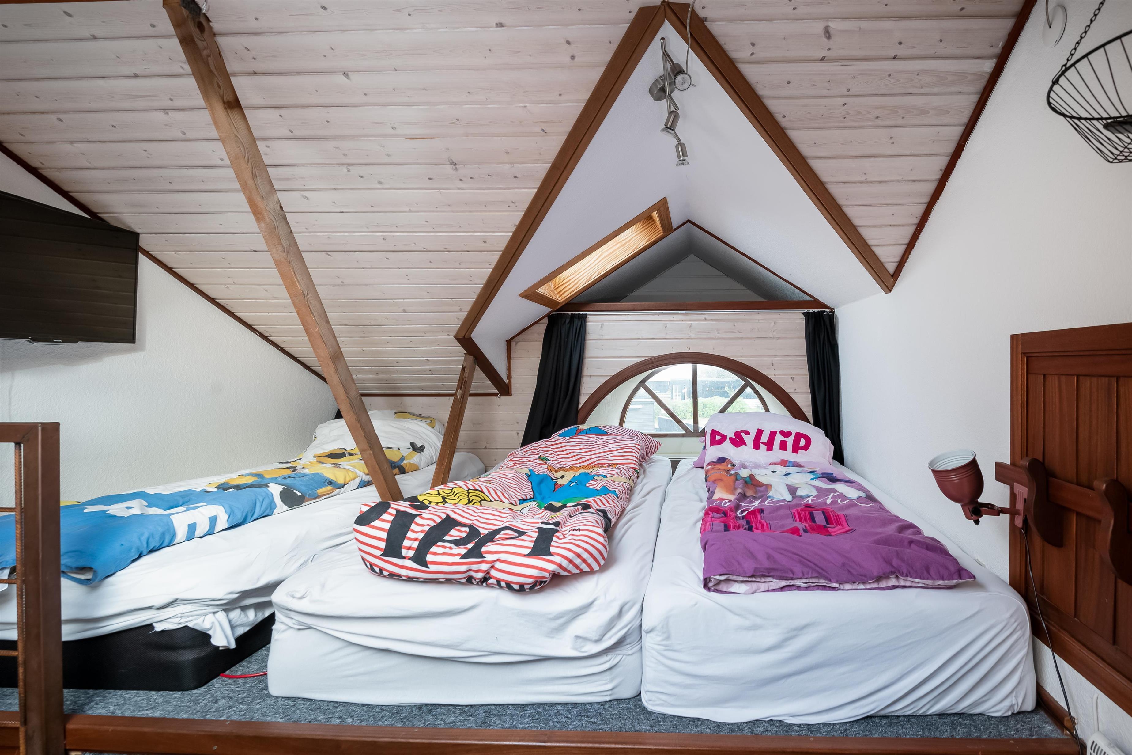 This cozy and intimate house features a living room, kitchen, bathroom, and a bedroom with a double bed on the ground floor. From the living room, a steep staircase leads to the second sleeping area/loft with three sleeping spaces, consisting of three box mattresses placed directly on the floor.