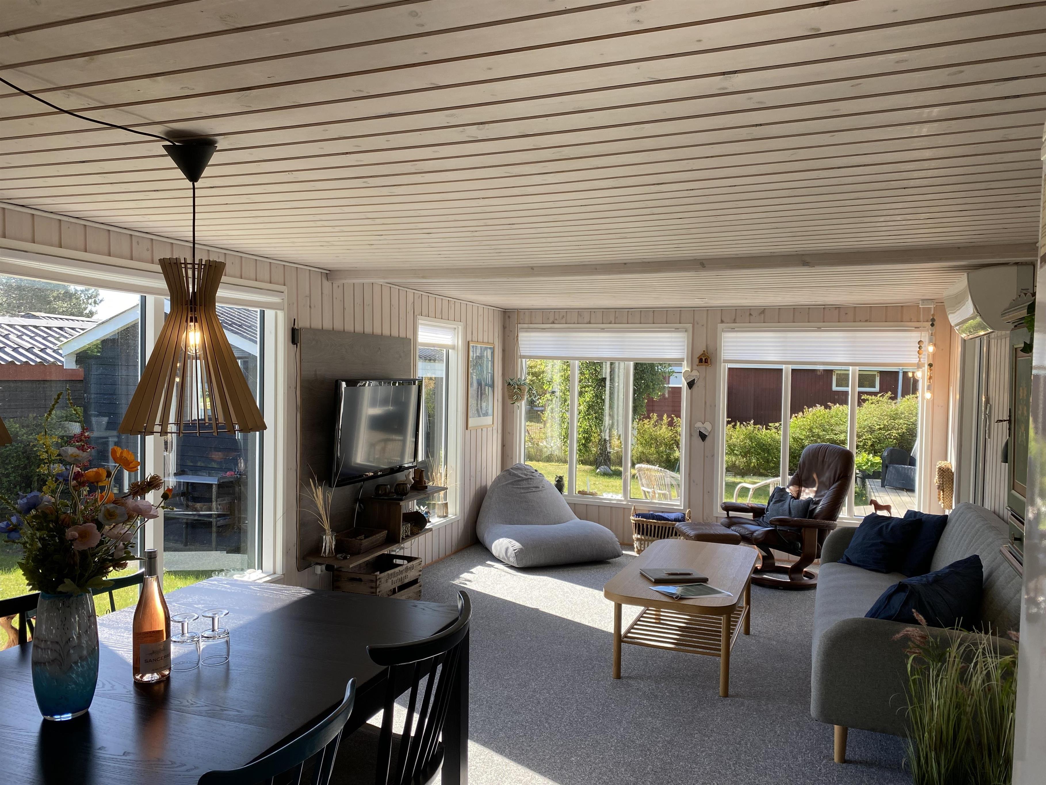 The house includes a small but highly functional kitchen equipped with a refrigerator, freezer, oven, stove, and dishwasher. The dining table is located in extension of the kitchen, while the living room is at the other end of the space. Here, you’ll find a sofa set, an armchair with a footstool, and a TV. A lovely rug on the floor and large windows create a bright and cozy atmosphere.