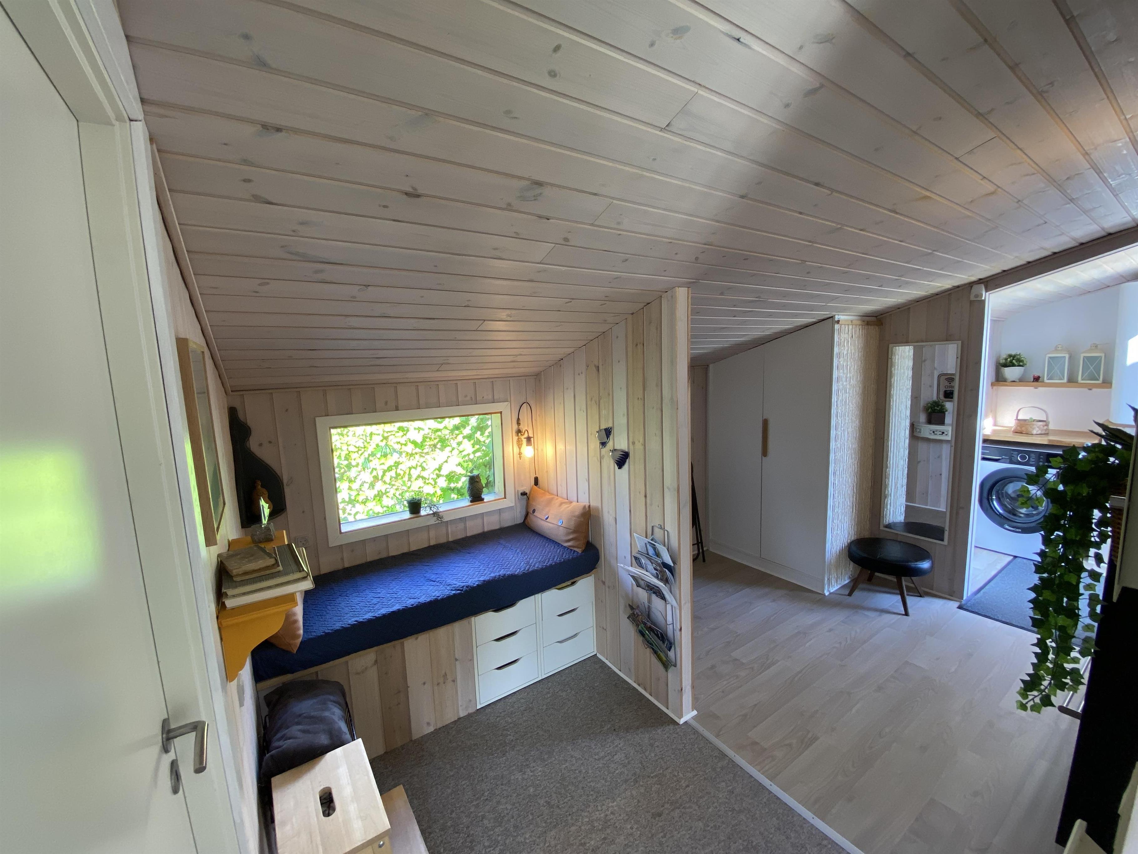 The entrance area is spacious with plenty of room for clothing storage. There is a washing machine available for use. At the other end, there is a small, cozy nook with a window, bench, cushion, and pillows – the perfect spot for children to play or for reading a book in peace.