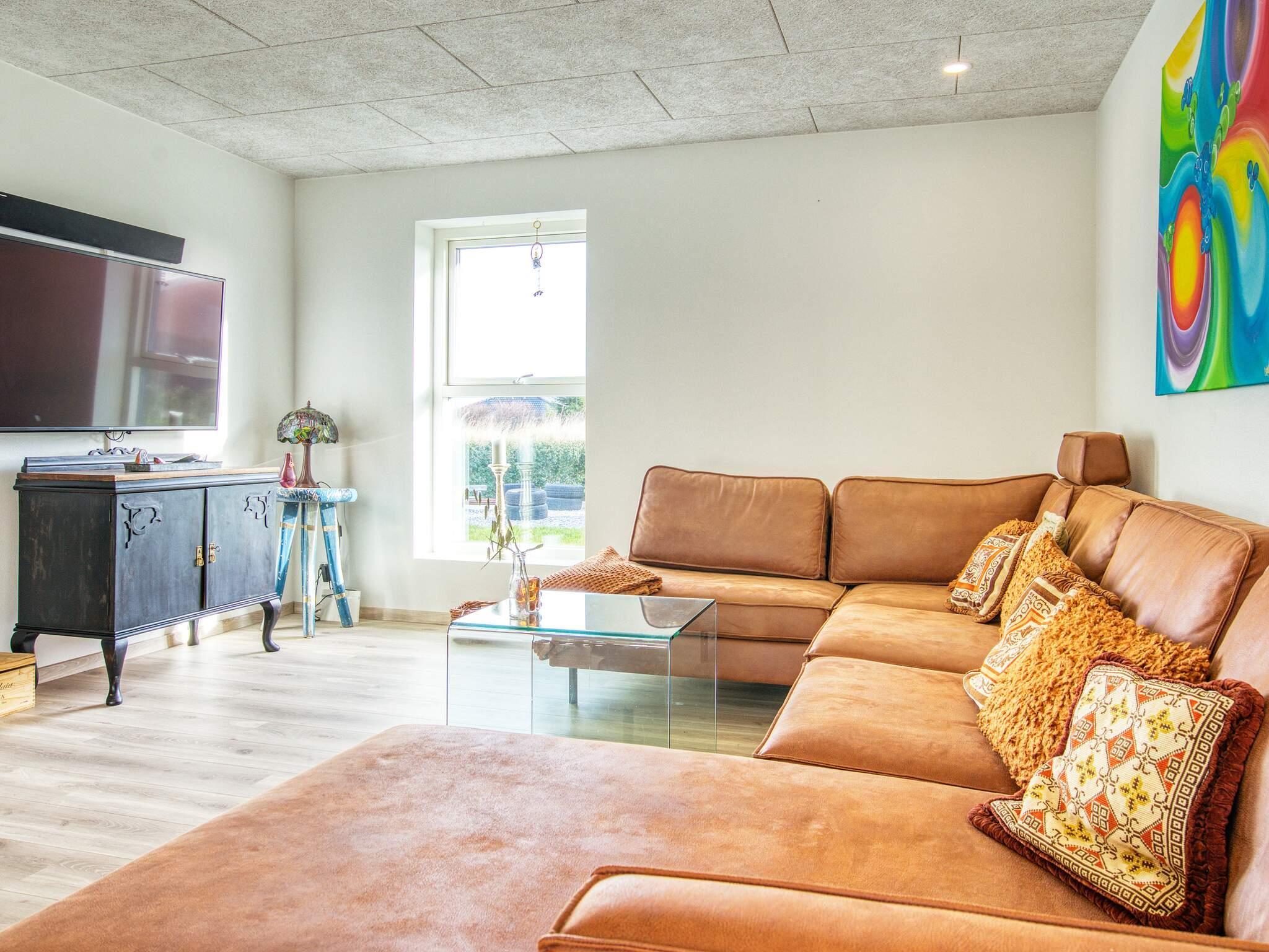 Der andere Teil des Wohnzimmers hat schönes Licht durch große Fenster. Am anderen Ende des Wohnzimmers befindet sich eine gemütliche Sitzecke mit Platz zum Entspannen. Es gibt viel Platz zum Kochen in der gut ausgestatteten Küche und die Möglichkeit, danach zusammen am langen Esstisch zu Abend zu essen. Hochstuhl vorhanden. Der Raum bietet Platz für das Familienleben und direkt davor befindet sich eine große, geräumige Holzterrasse, die teils überdacht ist.