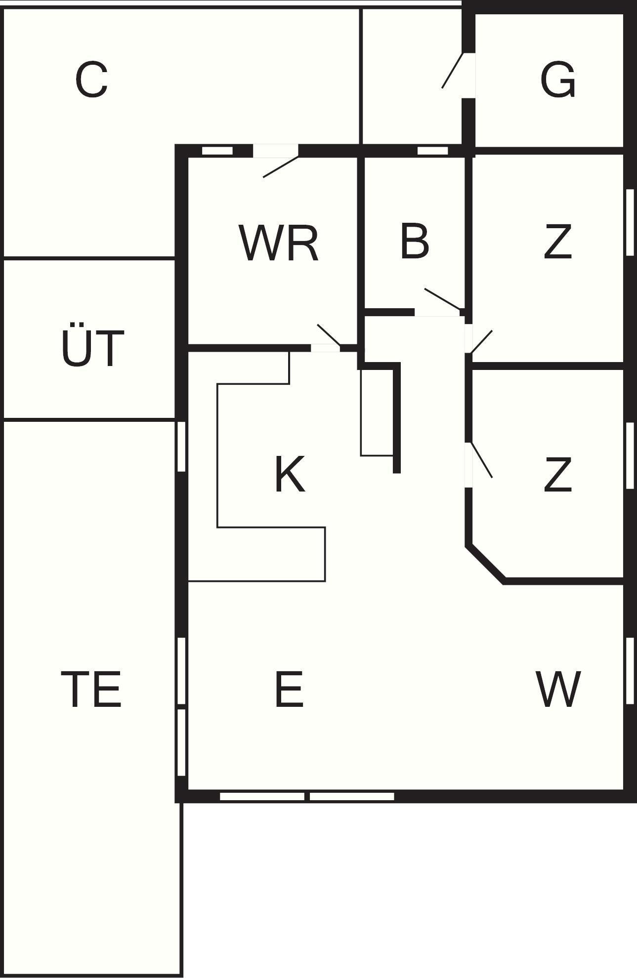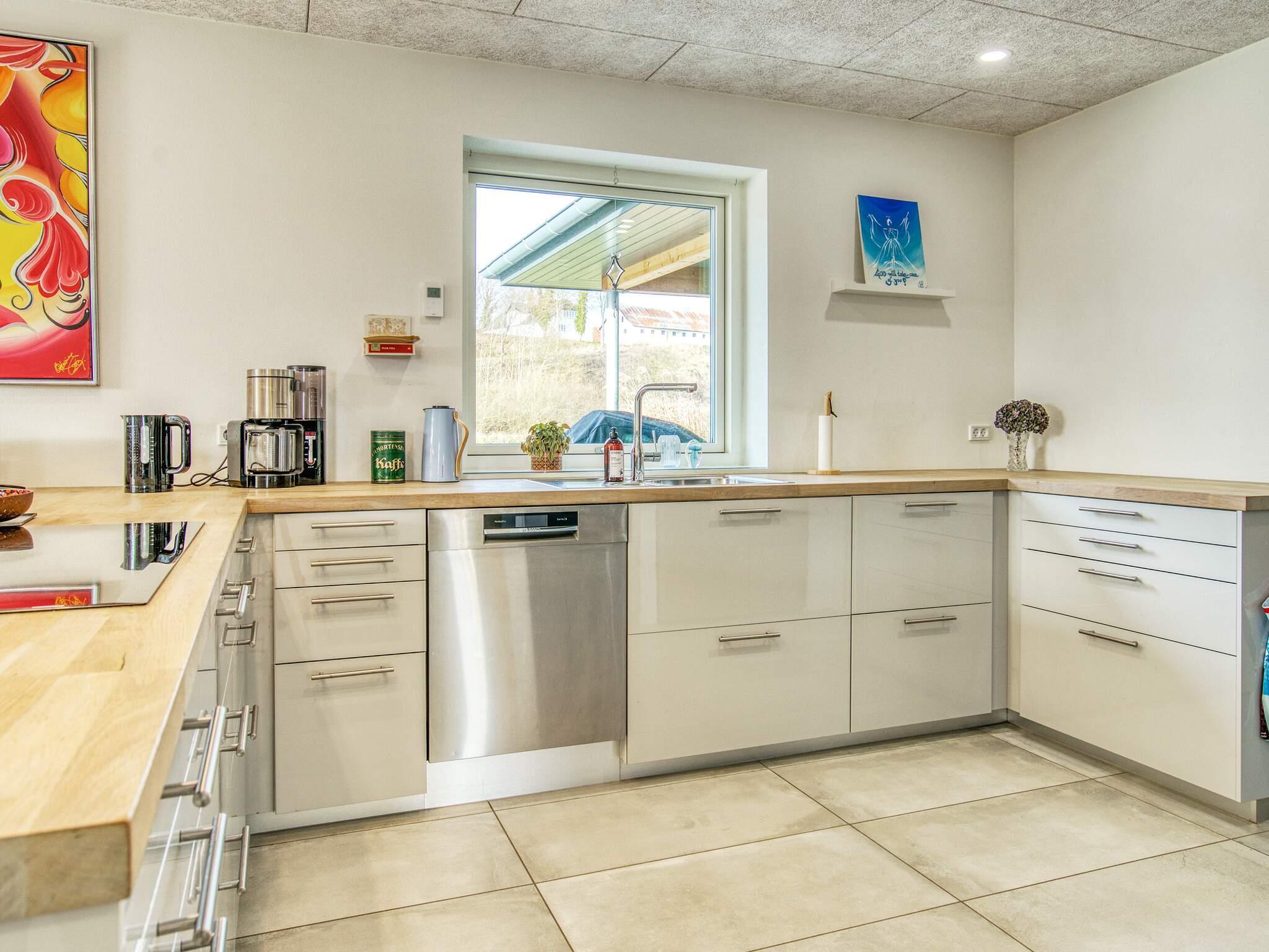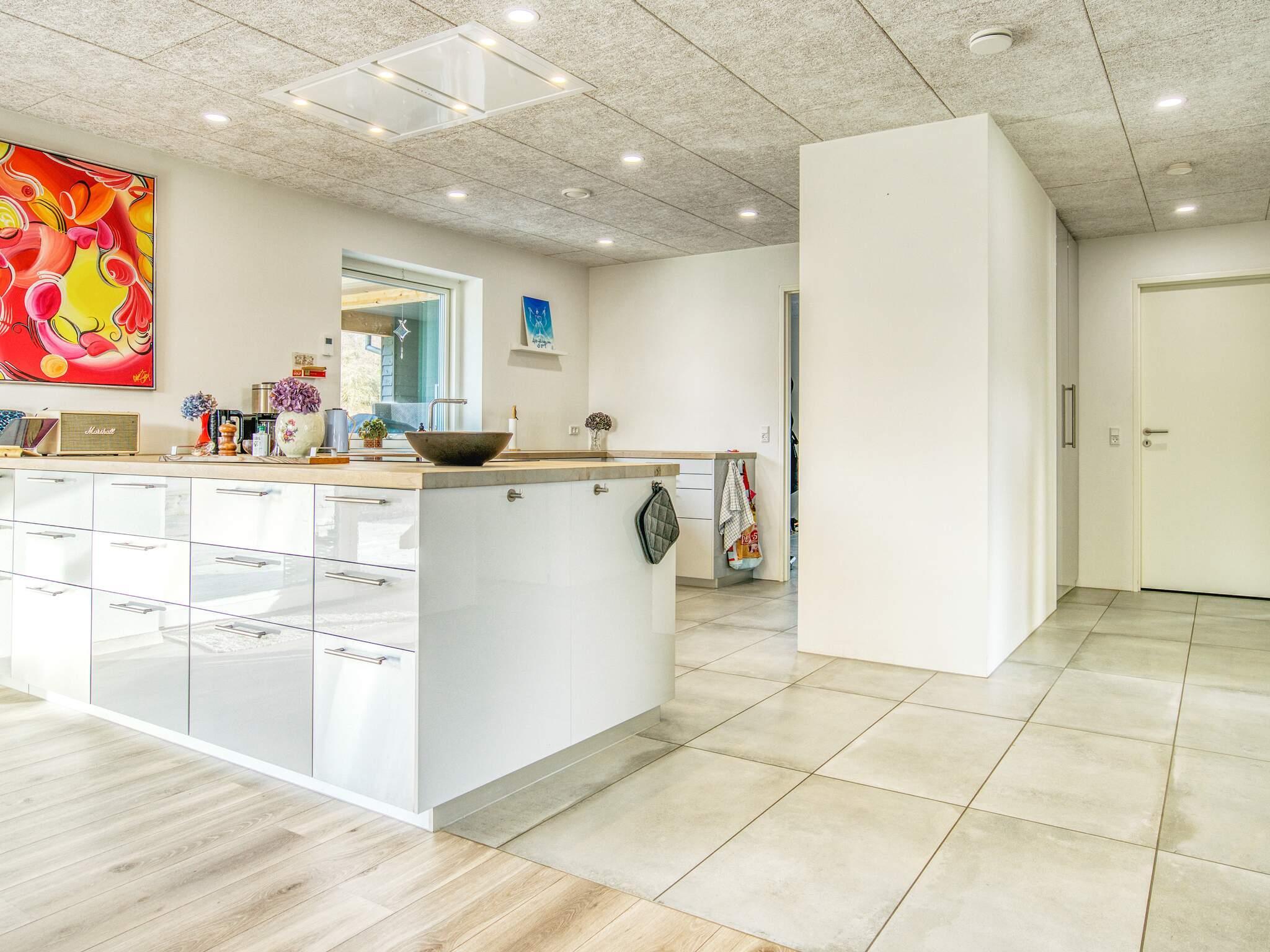 Der Mittelpunkt des Ferienhauses bildet die große Wohnküche, wo Küche und Wohnzimmer im großen, hellen Raum offen vereint sind. Der Essbereich liegt perfekt vor einem großen Fenster mit Schiebetür zur Terrasse und Blick auf den Wald. Dies bringt die Natur direkt in den Raum und die Tierwelt im Garten ist reich.