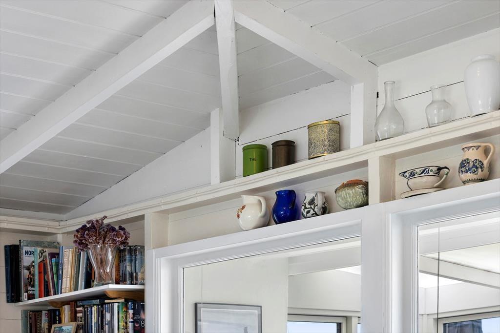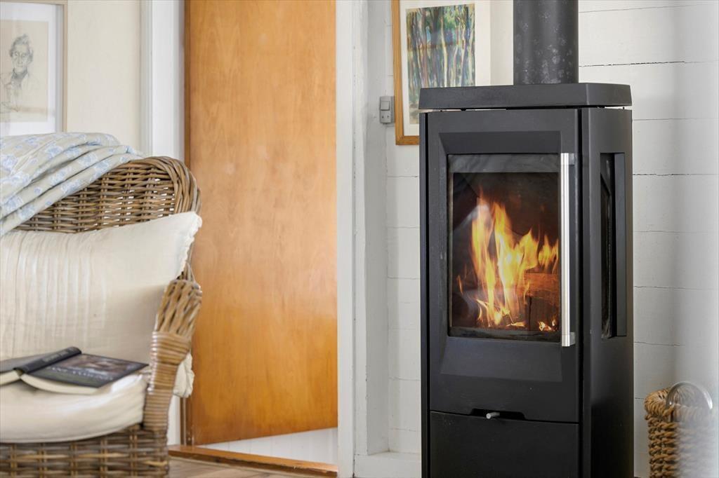 Von der Küche aus geht es ein paar Stufen hinauf ins Wohnzimmer, welches das Herzstück und der Treffpunkt des Hauses ist. Der Wintergarten hat Panoramafenster, die den Blick auf das Meer freigeben, was es nahezu unmöglich macht, sich von diesem überwältigenden Anblick loszureißen. Im Wintergarten steht der Esstisch mit Sitzgelegenheiten für alle, sodass du deine Mahlzeiten bei jedem Wetter mit fantastischer Aussicht als Hintergrund genießen kannst. Neben dem Esstisch gibt es eine kleine Sofaecke und einen Sessel. Hier könnt ihr euch mit einem guten Buch entspannen oder eine Tasse Kaffee am Nachmittag genießen. Außerdem könnt ihr hier viele Stunden zusammen verbringen und den Sonnenuntergang sowie den wunderschönen Meerblick genießen. Das Wohnzimmer ist gemütlich und einladend mit hellen Holzwänden und -decken. Es gibt ein bequemes Sofa und einen Sessel, von denen aus ihr fernsehen könnt, es sei denn, ihr seid eher in der Stimmung für ein unterhaltsames Gesellschaftsspiel oder ein anregendes Gespräch. Das Wohnzimmer verfügt auch über einen Kaminofen, sodass ihr es drinnen gemütlich habt, auch wenn es draußen kalt ist. Vom Wohnzimmer aus führt eine Treppe hinunter zu den beiden Schlafzimmern. In dem einen, das einen Blick auf das Meer bietet, steht ein Doppelbett. Im anderen Zimmer mit zwei Einzelbetten gibt das Fenster den Blick auf die grüne Umgebung frei.