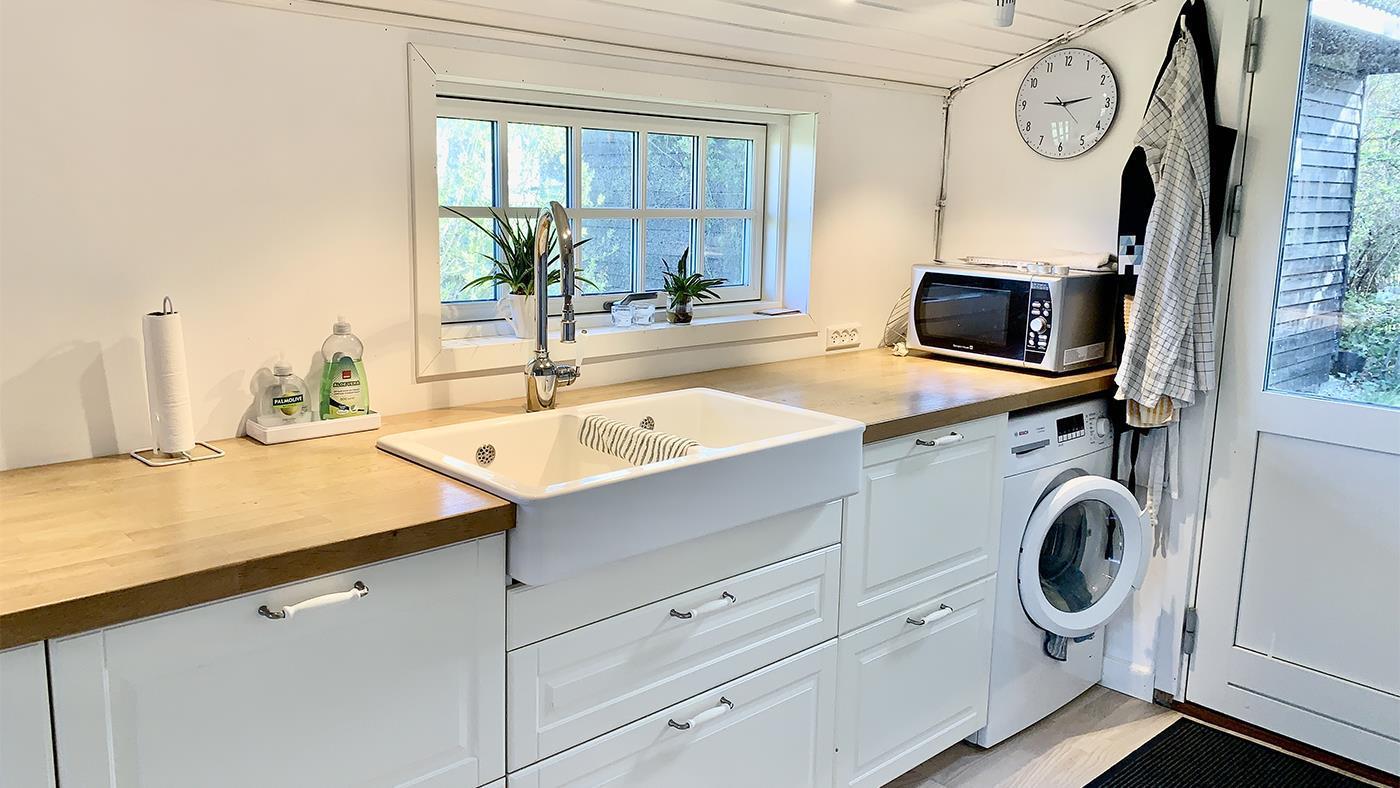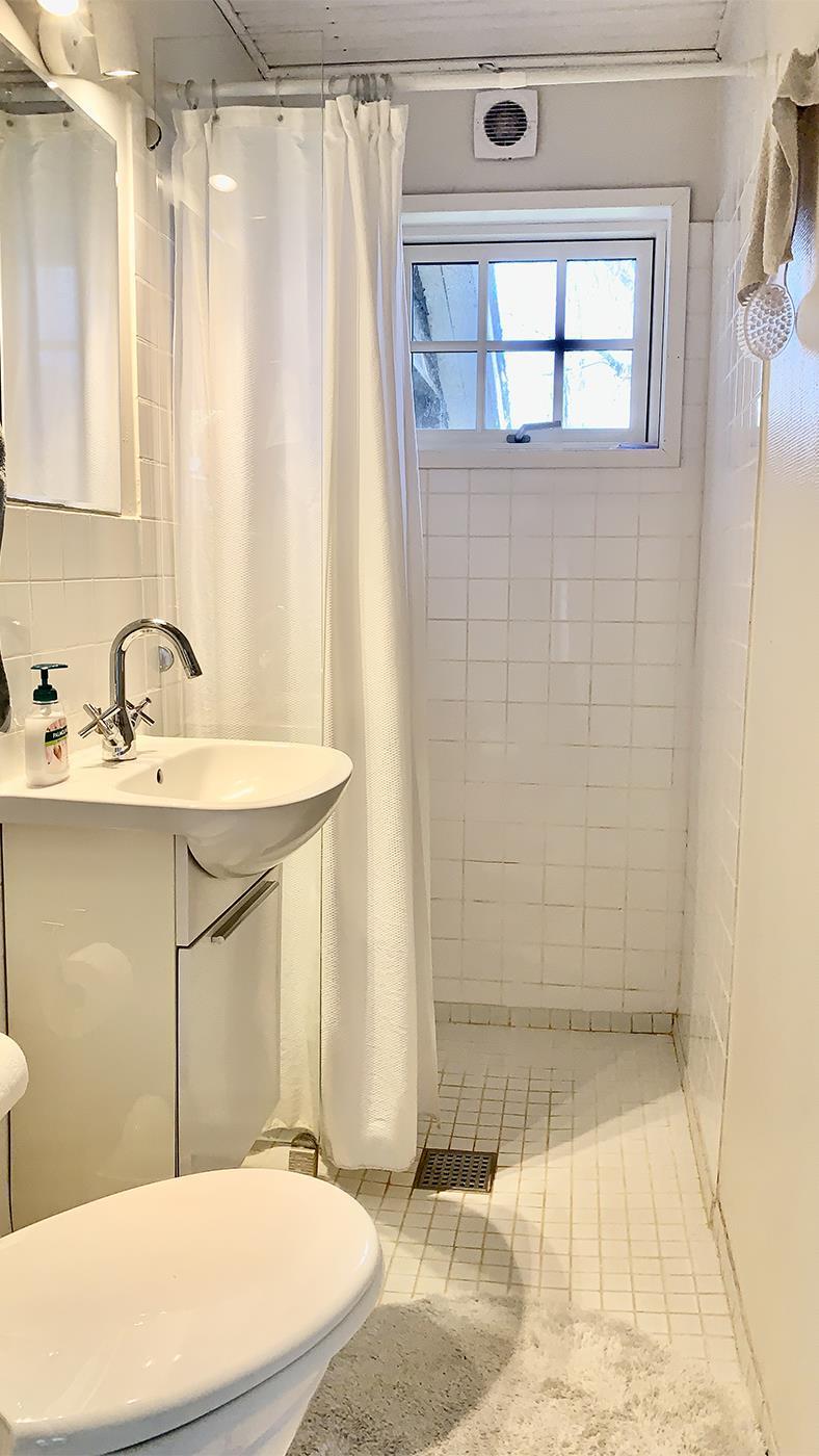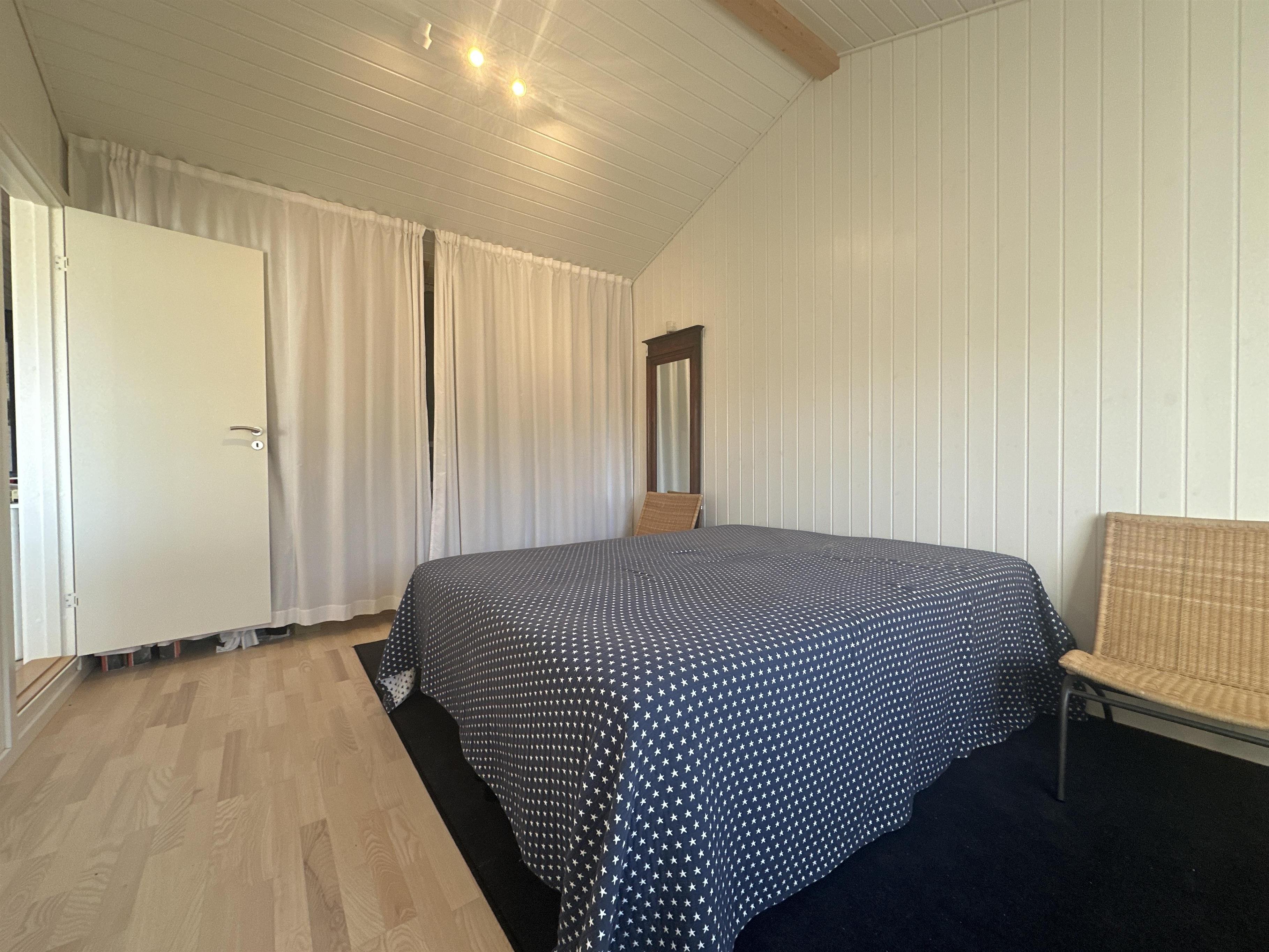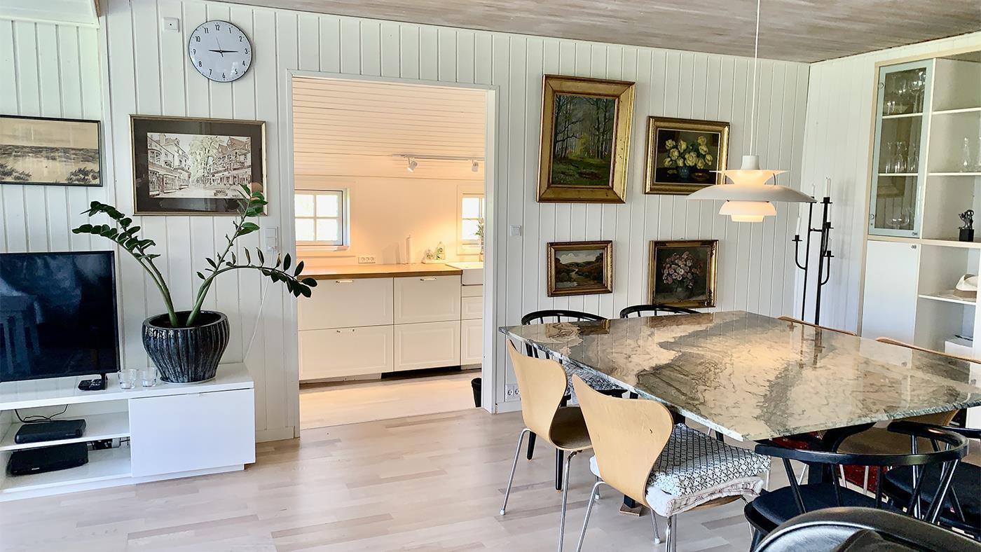 The kitchen opens onto the spacious living room with a large dining area and a cosy sofa where you can relax and enjoy the natural light streaming in through the large windows. It's easy to gather with family or friends here and create memorable moments. The holiday home has three bright and inviting bedrooms with comfortable beds that ensure you a good night's sleep – ready for another day of exciting experiences. The bathroom is modern and functional with a shower cubicle, perfect for freshening up after a day out in nature.