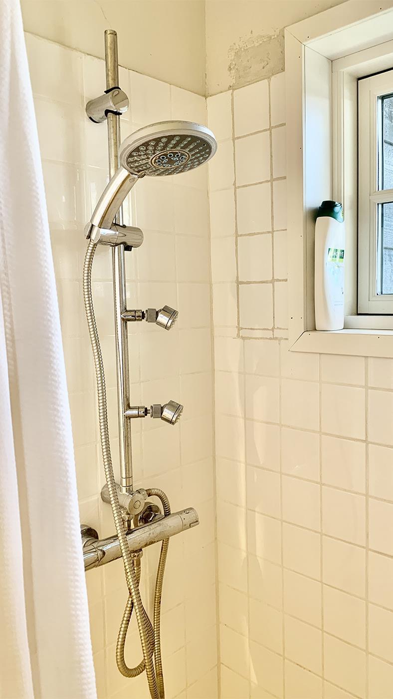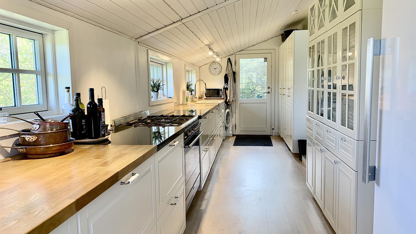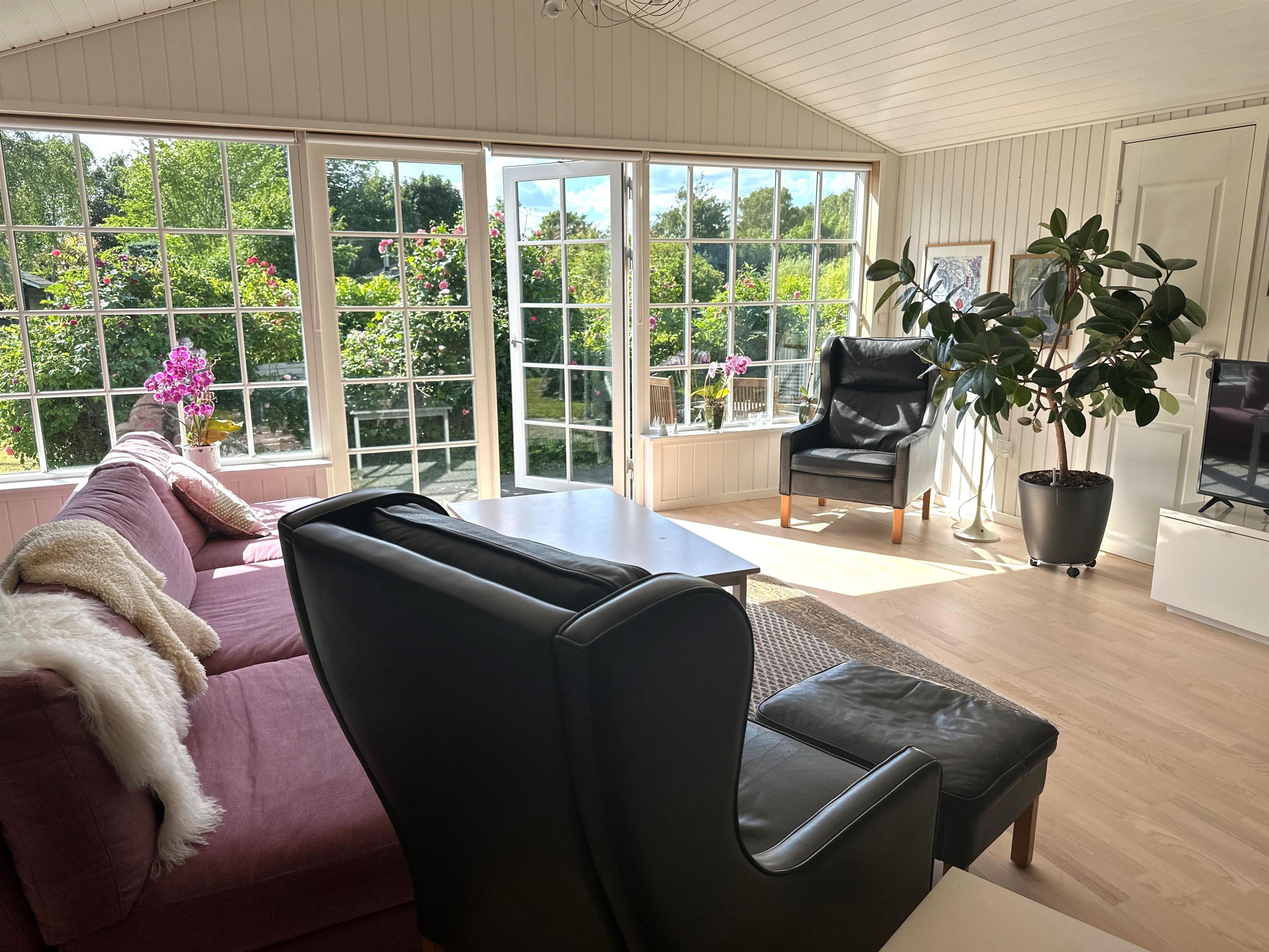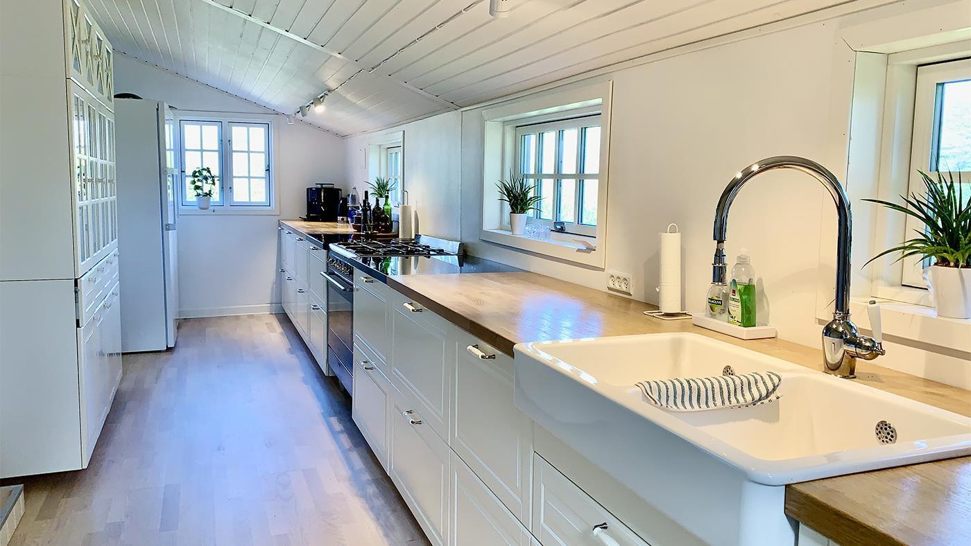 The kitchen opens onto the spacious living room with a large dining area and a cosy sofa where you can relax and enjoy the natural light streaming in through the large windows. It's easy to gather with family or friends here and create memorable moments. The holiday home has three bright and inviting bedrooms with comfortable beds that ensure you a good night's sleep – ready for another day of exciting experiences. The bathroom is modern and functional with a shower cubicle, perfect for freshening up after a day out in nature.