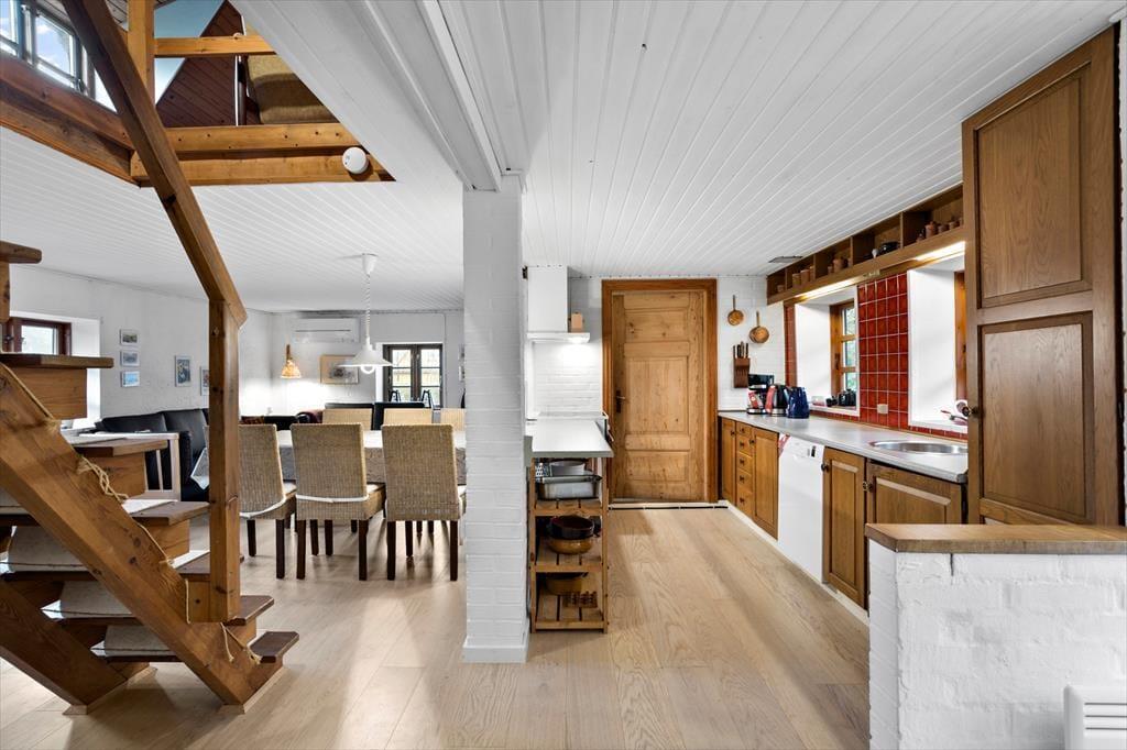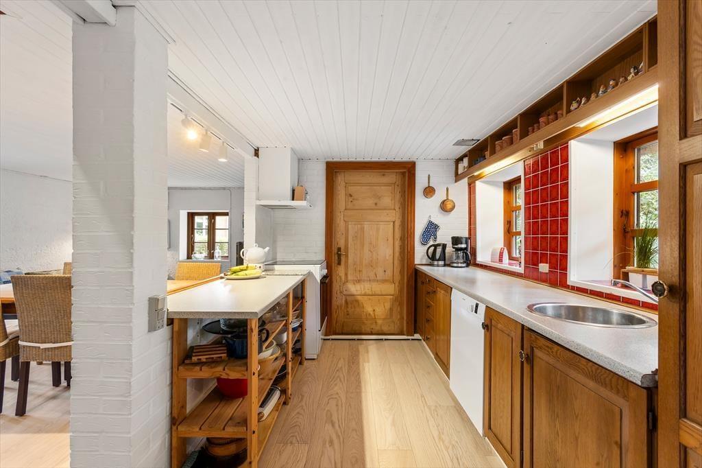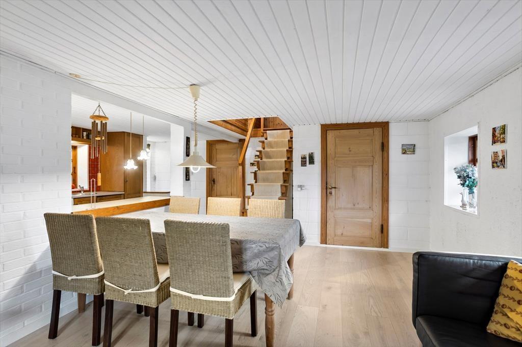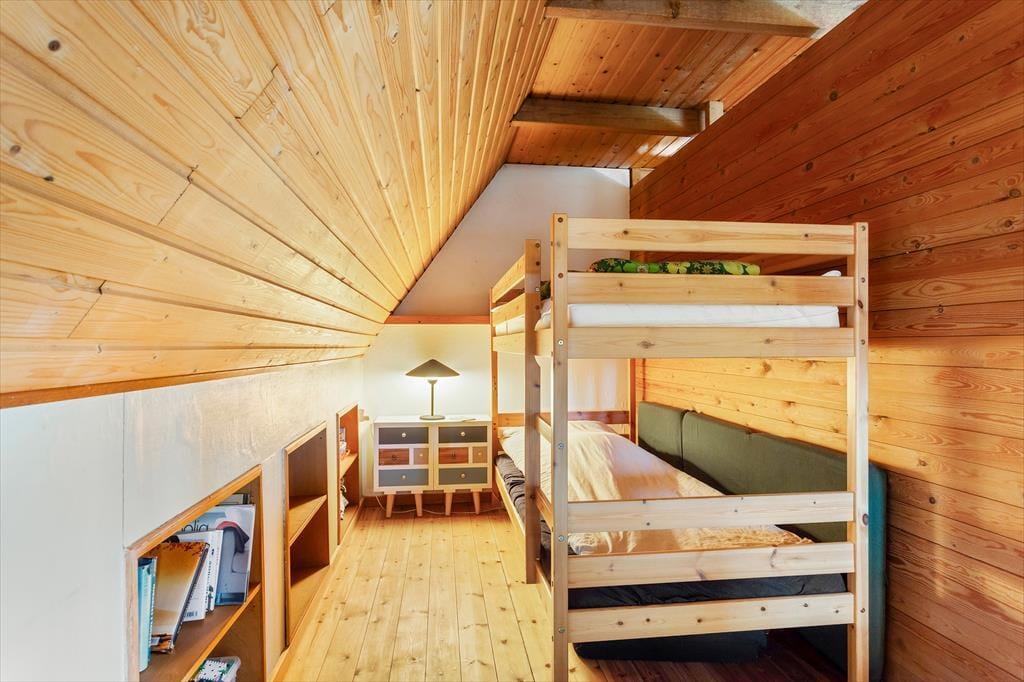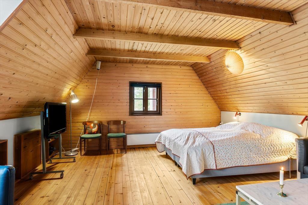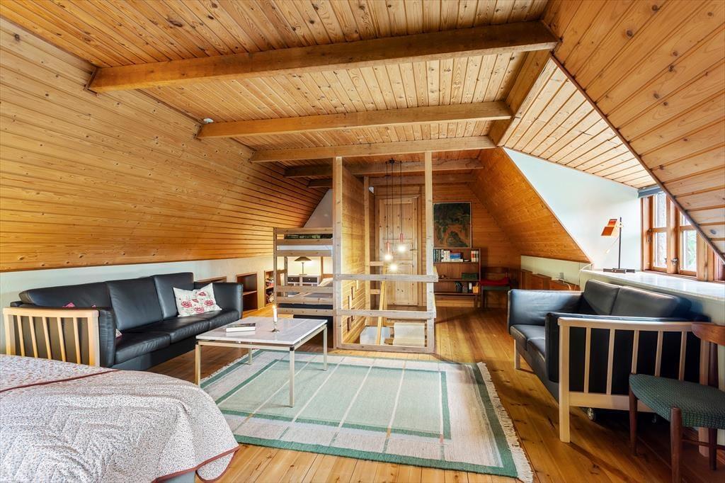 As you enter this cozy summer house, you are greeted by a warm and inviting atmosphere. The house features a partially open kitchen connected to the living area, allowing you to prepare meals while staying part of the family gathering. The living room is equipped with a wood-burning stove for cozy evenings and a heat pump to ensure a comfortable temperature year-round. The rustic charm continues with the steep staircase leading up to the timber-clad first floor with vaulted ceilings and exposed beams – a perfect retreat to relax and unwind.