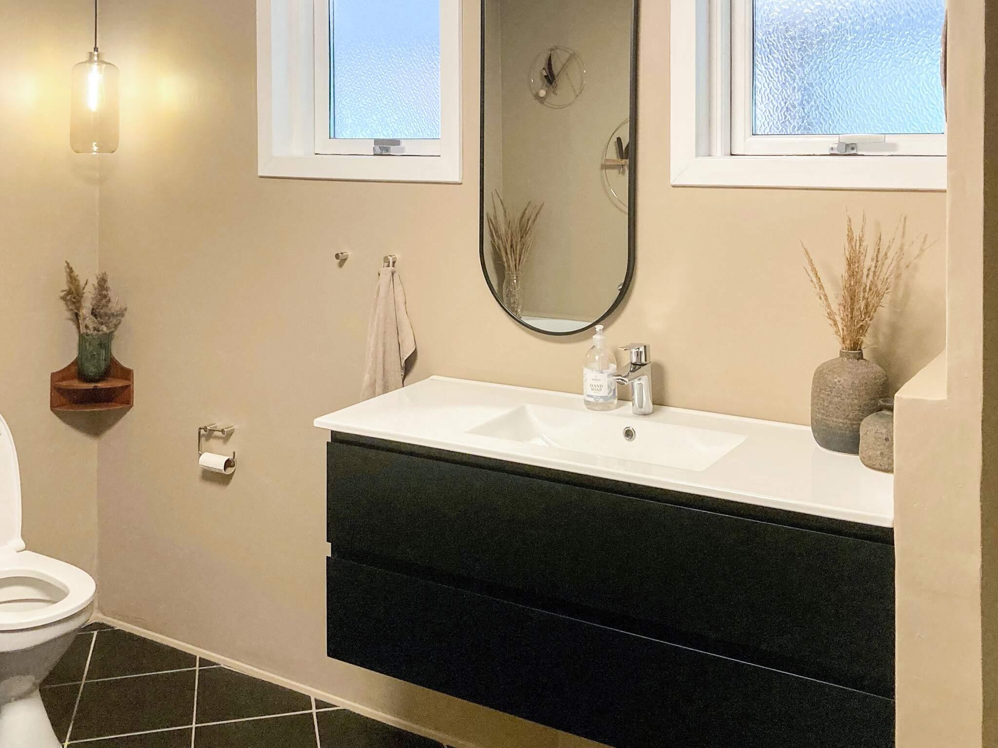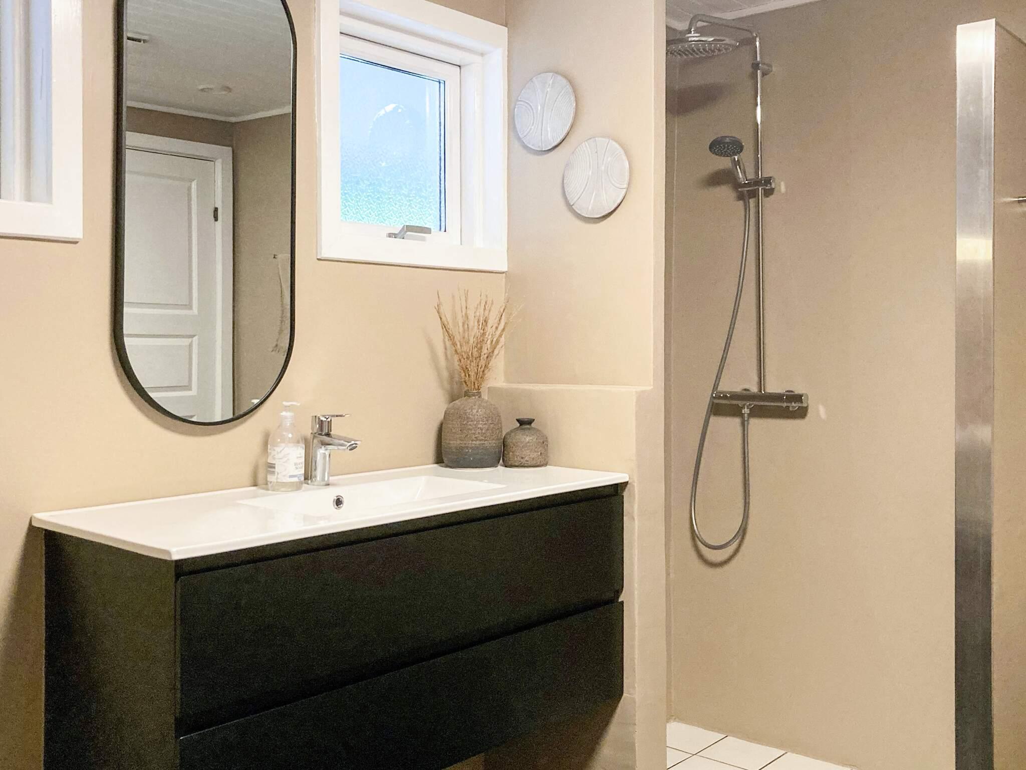 Die Küche ist zum Hauptwohnzimmer hin offen, sodass jeder sich integriert fühlt. Kleineres Wohnzimmer mit Holzofen zum Zurückziehen. Das Ferienhaus hat fünf Schlafzimmer mit Doppelbetten, eines davon zudem mit Etagenbett. Das Haus hat zwei Badezimmer; eines mit WC und Dusche (ohne Whirlpool) und das andere mit WC.