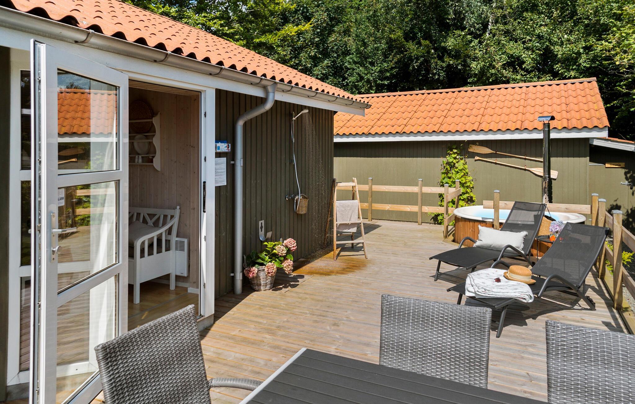Die teilweise überdachte Terrasse lädt dazu ein, angenehme Stunden im Freien zu verbringen. Nehmen Sie in bequemen Liegen ein Sonnenbad und genießen Sie leckere Mahlzeiten vom Grill.