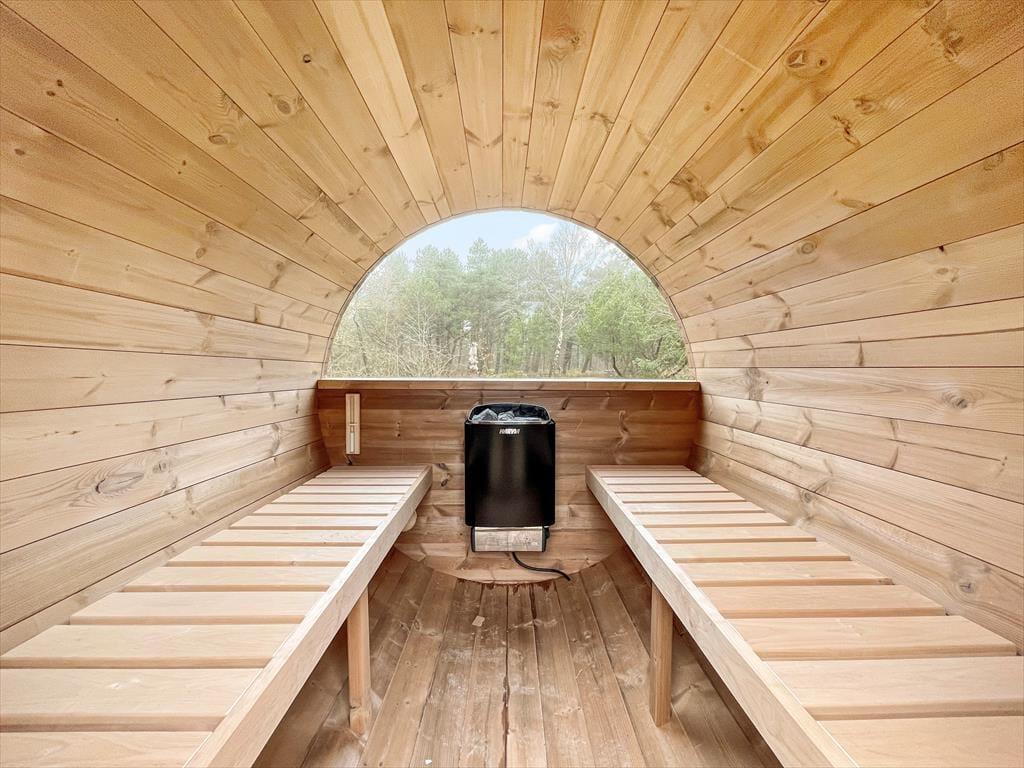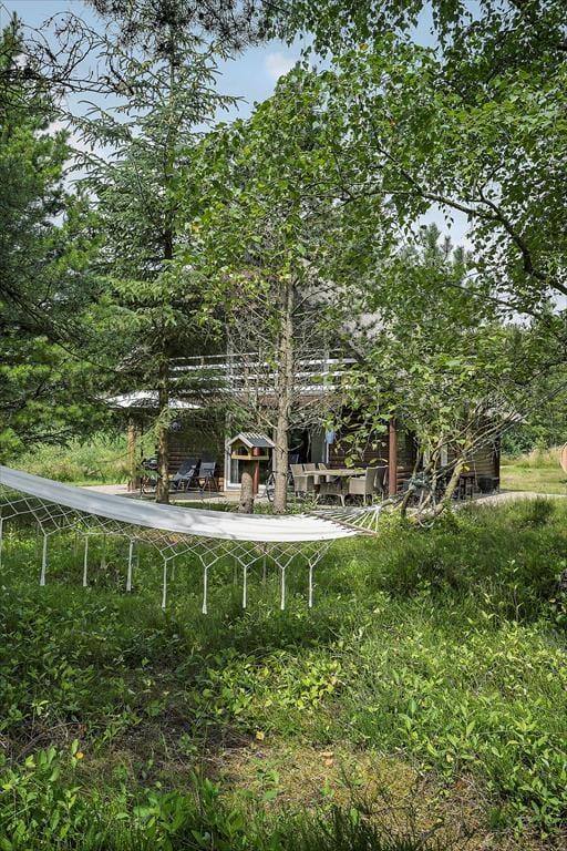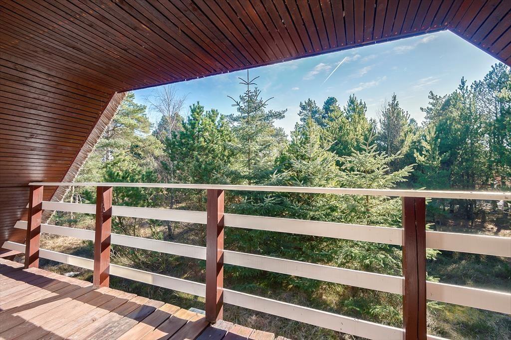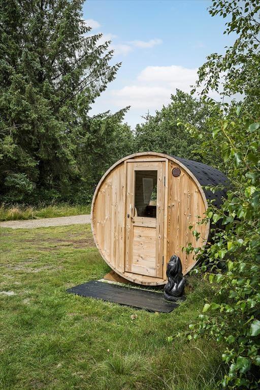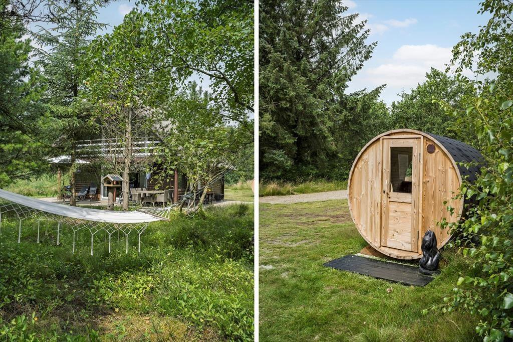 Der überdachte Balkon im ersten Stock ist ein gemütlicher Sitzplatz, und wenn du morgens aufwachst, kannst du hier sitzen und vom Vogelgezwitscher und dem schönen Blick über das Naturgelände geweckt werden. Bei schönem Wetter kannst du das Frühstück auch auf die Terrasse verlegen, die sich östlich, südlich und westlich des Hauses erstreckt – und du kannst sogar die Außendusche und die schöne Tonnensauna nutzen. Tagsüber können die Kinder im Sandkasten spielen oder schaukeln und zwischen den Bäumen auf dem Grundstück Verstecken spielen. Abends besteht die Möglichkeit, den Grill anzuzünden und euch um den Gartentisch zu versammeln.