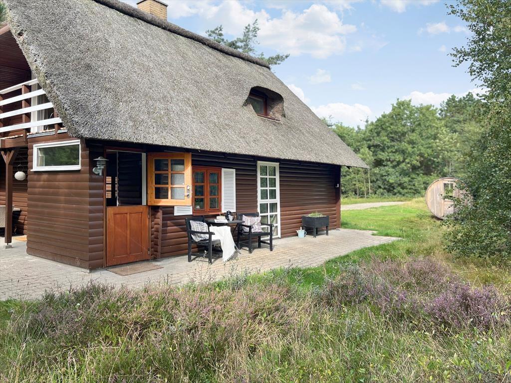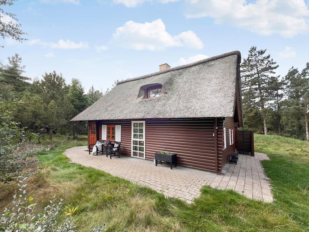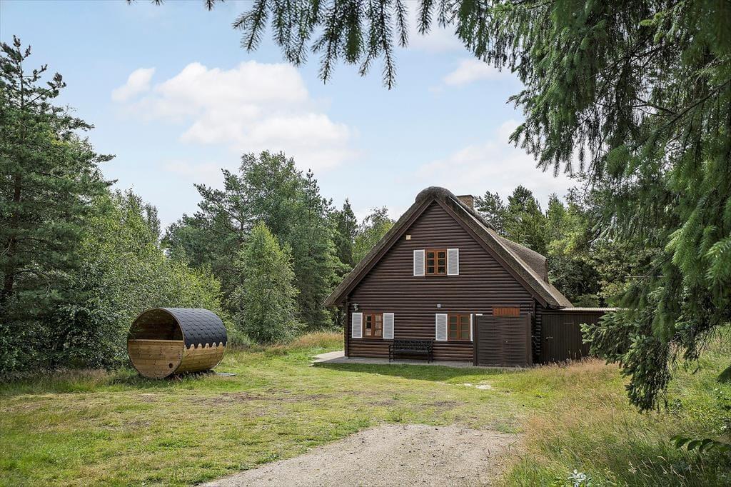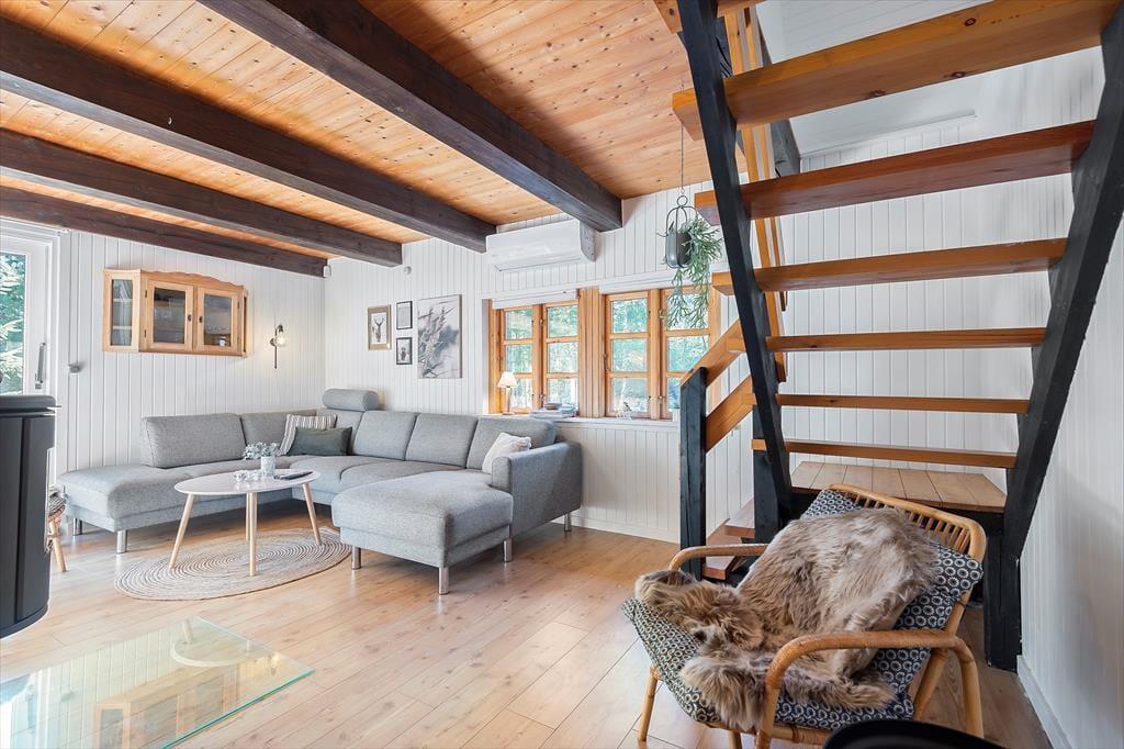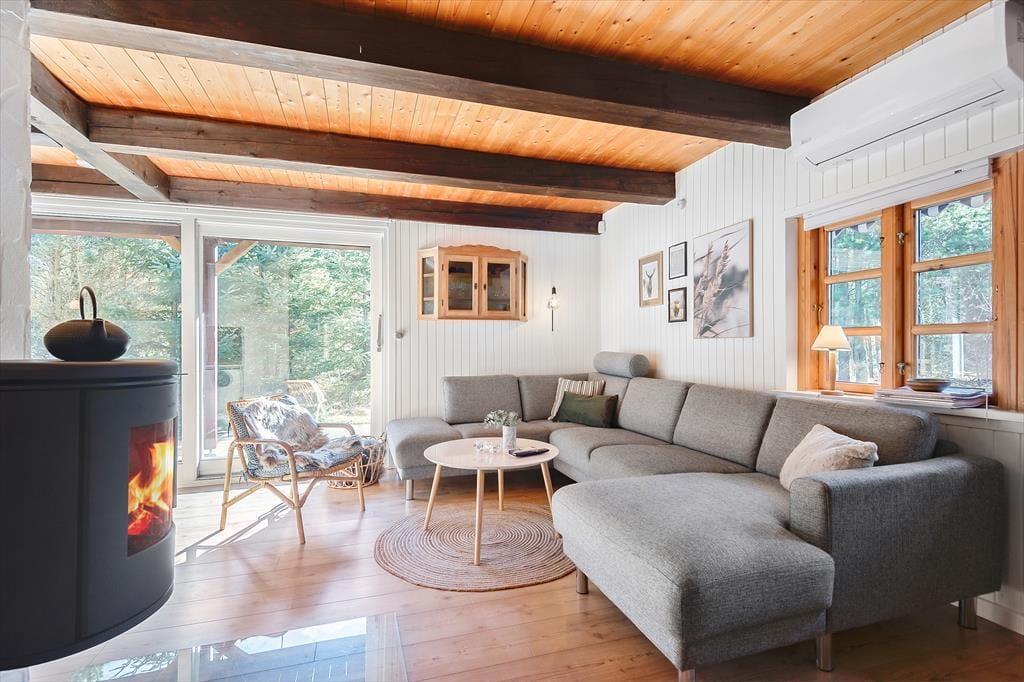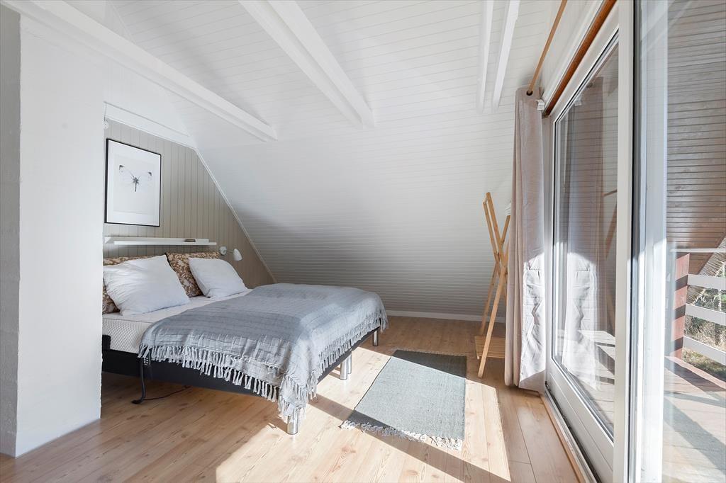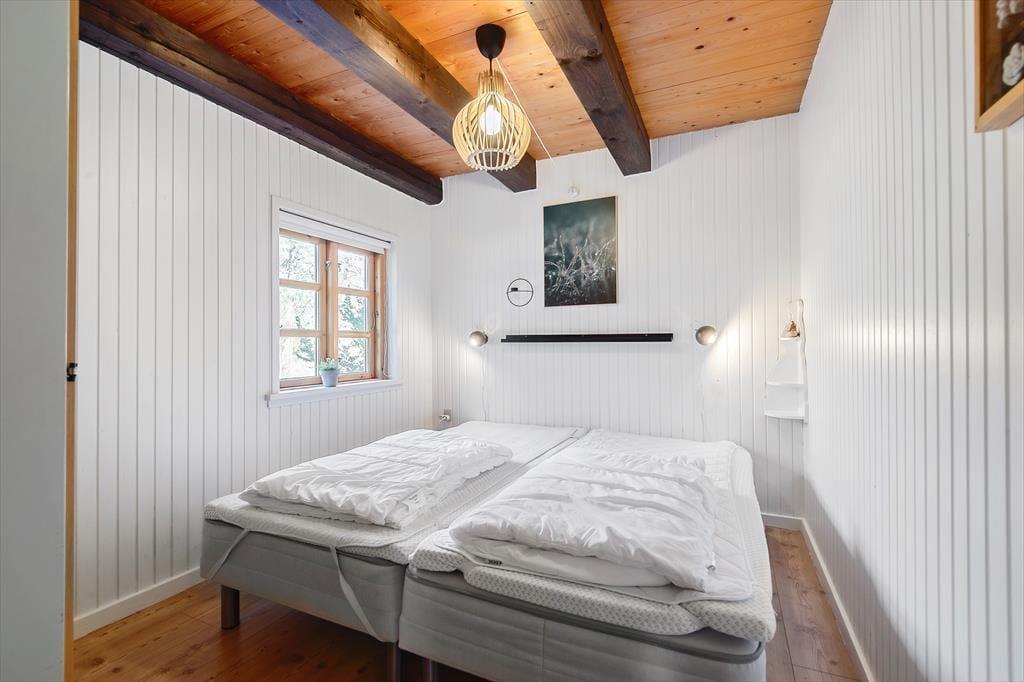 Mit seinem hohen Reetdach und der dunkelbraunen Holzfassade fügt sich das Sommerhaus perfekt in die malerische Umgebung ein. Dass das Haus 2022 einer gründlichen Renovierung unterzogen wurde, sieht man innen sehr deutlich, denn dort findest du moderne Möbel und helle Farbtöne. Dabei hat sich das Haus seinen Geist und seine angenehme Atmosphäre bewahrt, sodass es wirklich ein Ort ist, der zum Genießen und Entspannen einlädt. Eine gut ausgestattete Küche mit Essbereich ist offen mit dem Wohnzimmer verbunden, das einen Holzofen, eine Wärmepumpe, eine schöne Sofaecke und einen Flachbildfernseher mit Chromecast bietet. Ein schönes Duschbad und ein Schlafzimmer mit Doppelbett befinden sich auch hier im Erdgeschoss, und wenn du die Treppe hinauf in den ersten Stock nimmst, findest du zwei weitere Schlafzimmer, die ebenfalls über ein Doppelbett verfügen. Das größte Schlafzimmer hat einen eingebauten Nachttisch auf einer Seite und der große Fensterbereich bietet dir direkten Zugang zu einem Südbalkon.