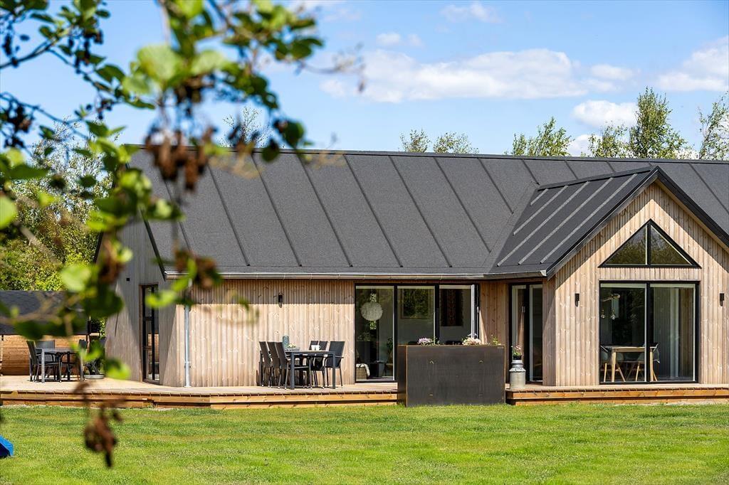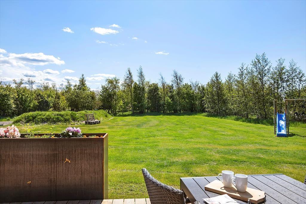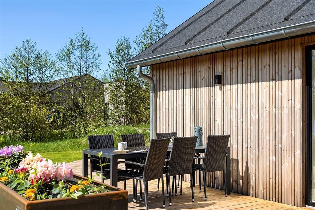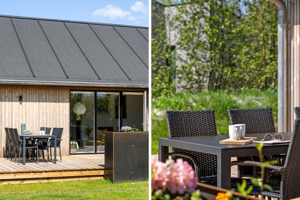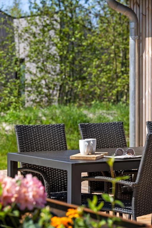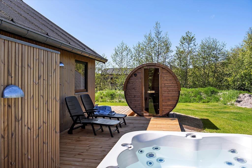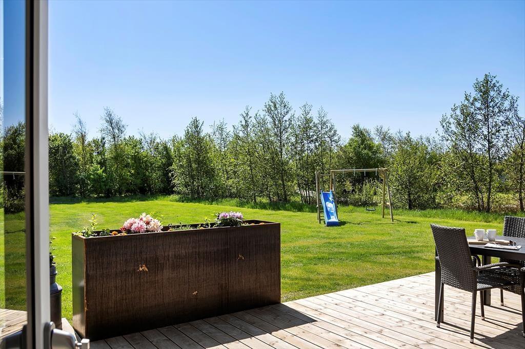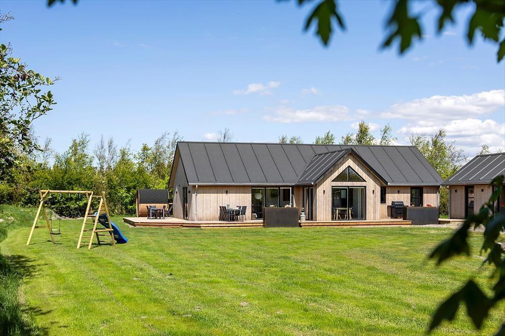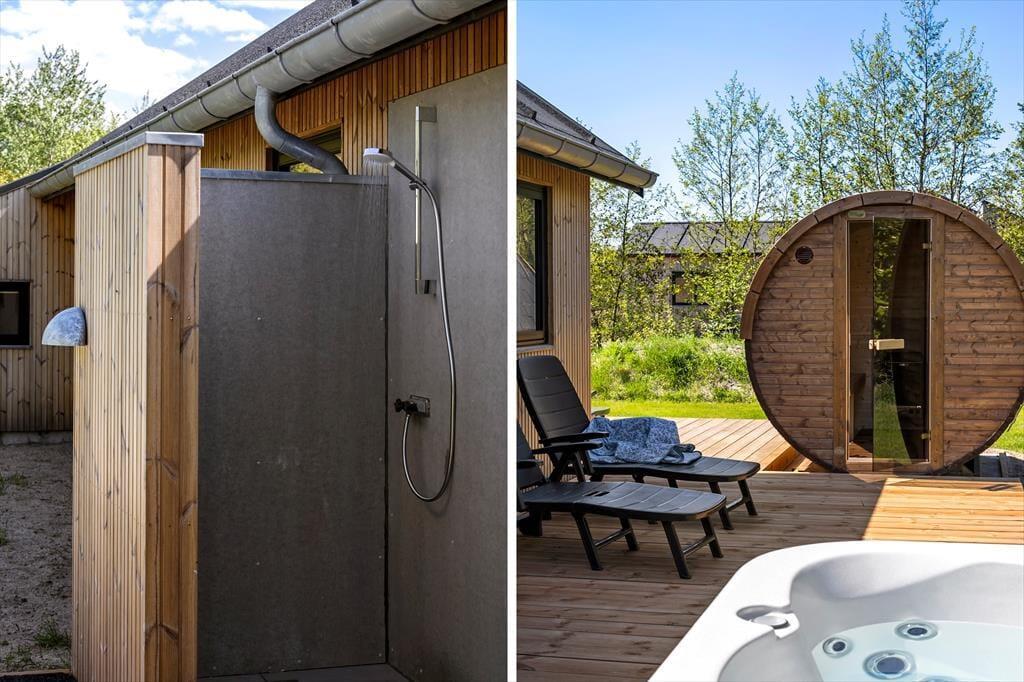 Die herrliche Terrasse des Ferienhauses schmiegt sich elegant um das Gebäude und bietet viele gemütliche Ecken – mal sonnig, mal windgeschützt. Hier kannst du den Tag mit einem Kaffee unter freiem Himmel beginnen, abends beim Sonnenuntergang eine Mahlzeit genießen oder dich nach einem Ausflug in dem warmen Außenwhirlpool entspannen. Die runde Saunatonne und die Außendusche vervollständigen das Wellnesserlebnis – und schöner kann man den Tag kaum ausklingen lassen, als im warmen Wasser unter dem Sternenhimmel. Die große Rasenfläche lädt zu Spiel und Spaß ein, und für Kinder gibt es sowohl eine Schaukel als auch eine Rutsche – perfekte Bedingungen für erlebnisreiche Stunden im Freien.