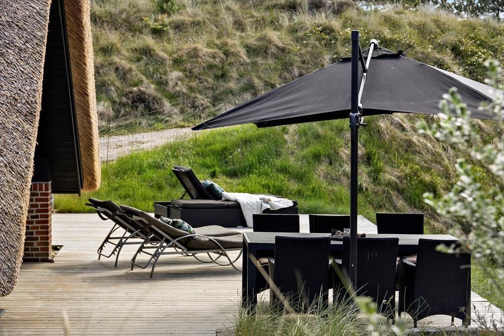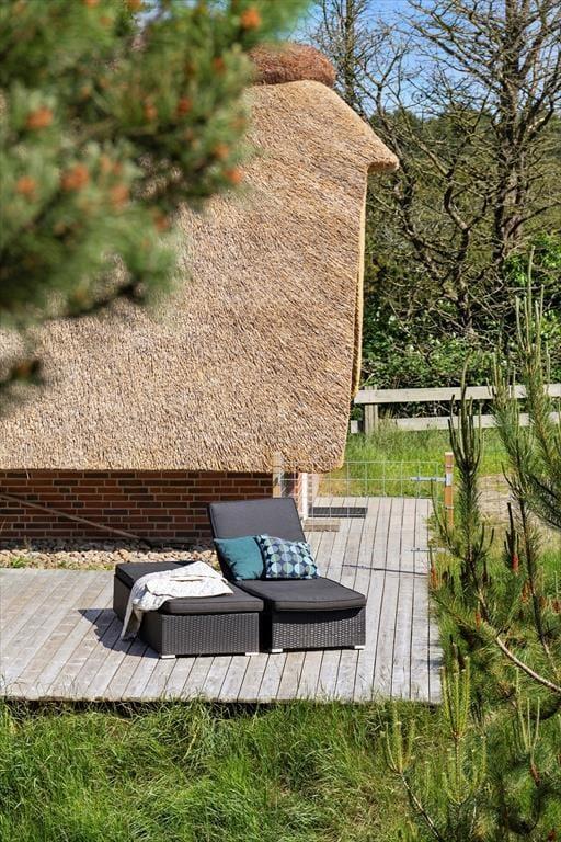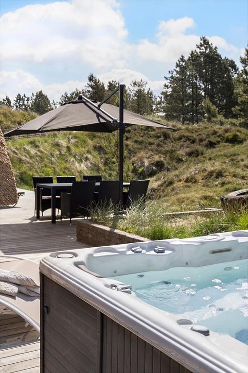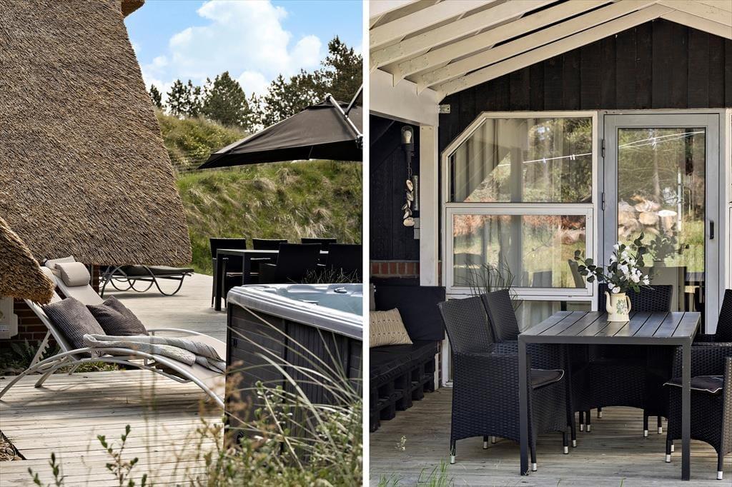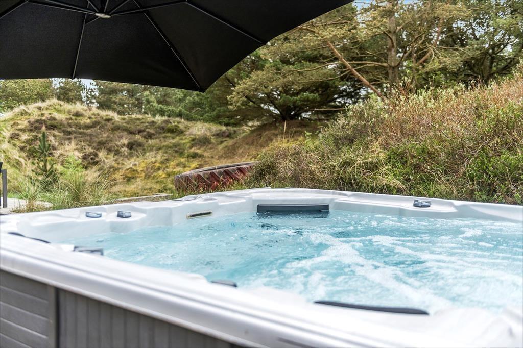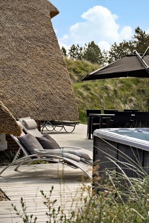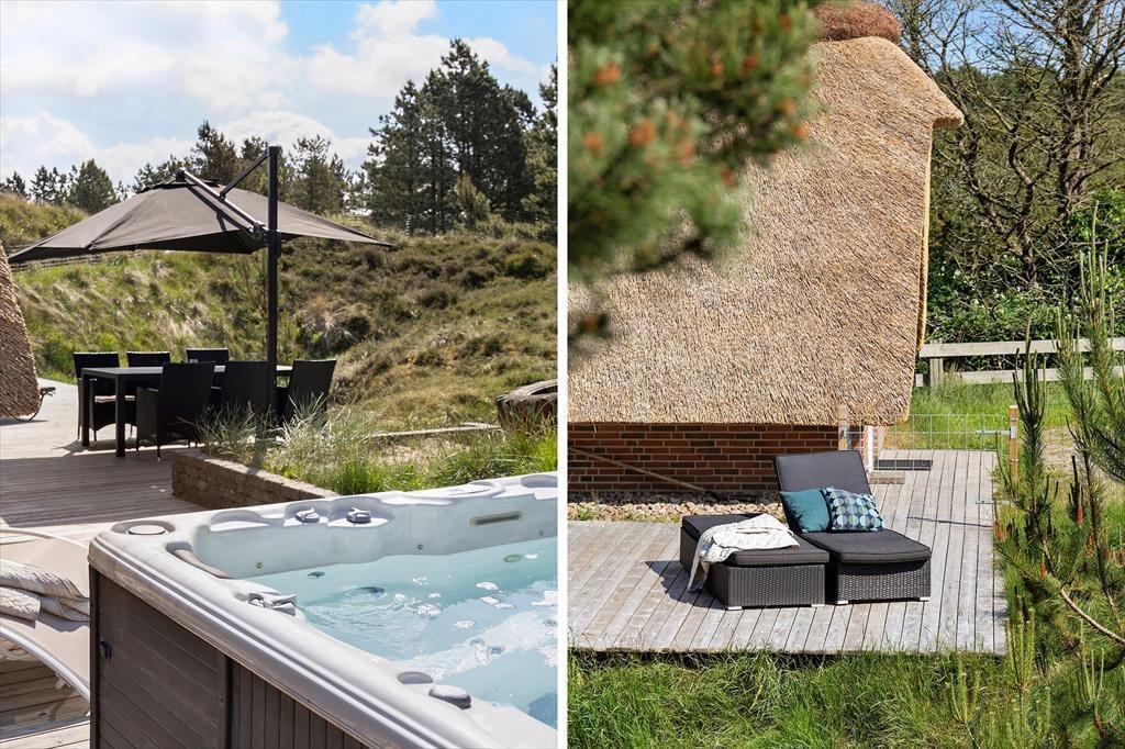 Die große Holzterrasse des Ferienhauses ist mit allem ausgestattet, was das Leben im Freien besonders angenehm macht – darunter hochwertige Gartenmöbel, gute Liegestühle und ein Grill, wenn das Abendessen im Freien zubereitet werden soll. Sowohl der Sonnenschirm als auch der überdachte Terrassenbereich spenden bei Bedarf Schatten und egal, wo Sie sich niederlassen, können Sie die schöne und ruhige Umgebung des Naturgrundstücks genießen. Auch vom Außenwhirlpool haben Sie einen Blick auf violettes Heidekraut und knorrige Kiefern, und selbst in den Jahreszeiten, in denen Schnee auf dem Strohdach und den mit Strandroggen bedeckten Dünen liegt, kann es sich hier im warmen Wasser absolut magisch anfühlen.