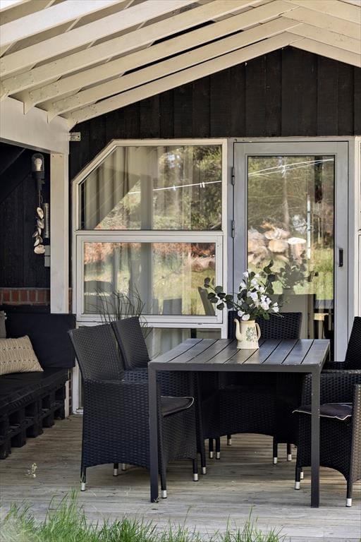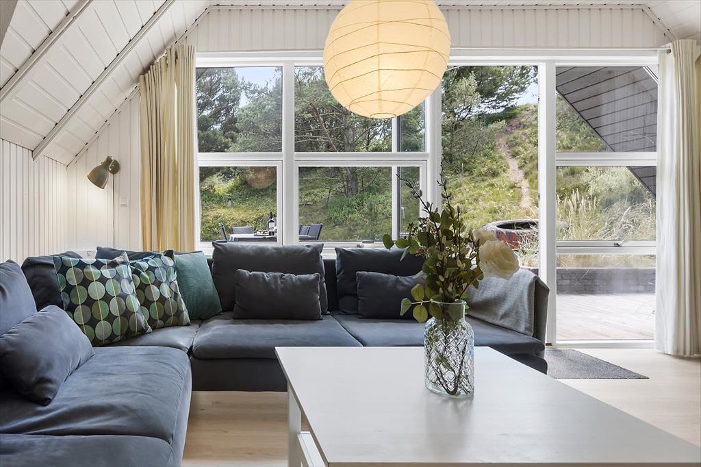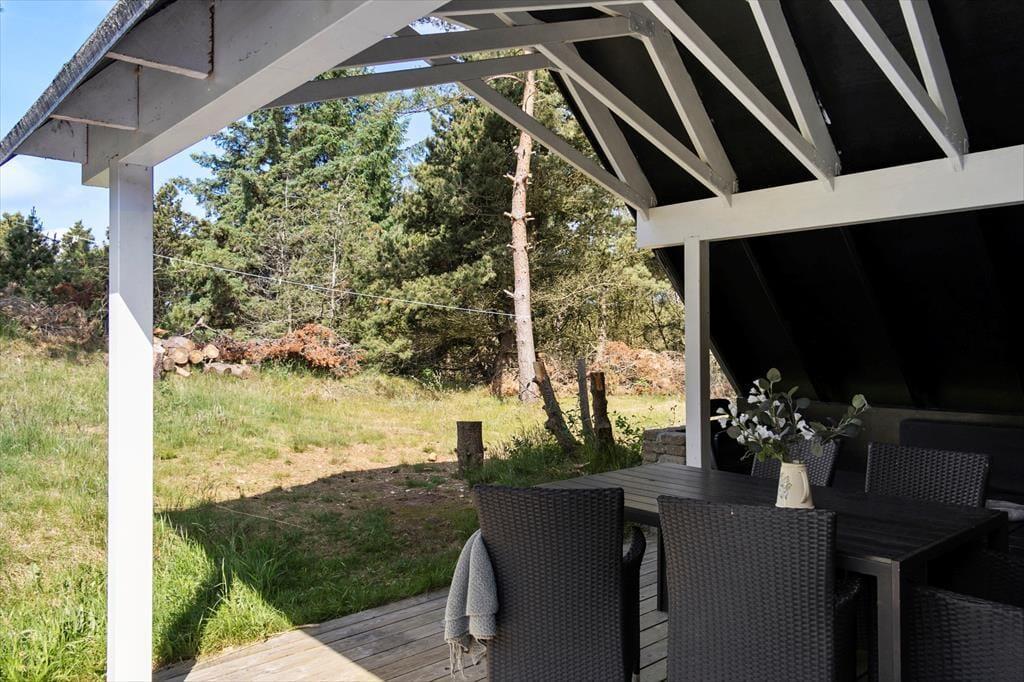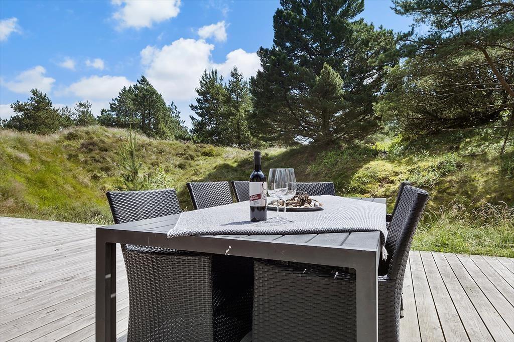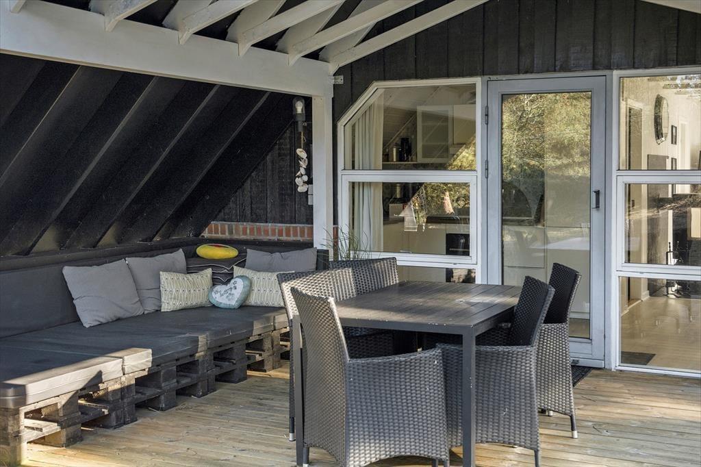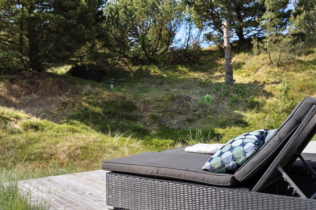 Die große Holzterrasse des Ferienhauses ist mit allem ausgestattet, was das Leben im Freien besonders angenehm macht – darunter hochwertige Gartenmöbel, gute Liegestühle und ein Grill, wenn das Abendessen im Freien zubereitet werden soll. Sowohl der Sonnenschirm als auch der überdachte Terrassenbereich spenden bei Bedarf Schatten und egal, wo Sie sich niederlassen, können Sie die schöne und ruhige Umgebung des Naturgrundstücks genießen. Auch vom Außenwhirlpool haben Sie einen Blick auf violettes Heidekraut und knorrige Kiefern, und selbst in den Jahreszeiten, in denen Schnee auf dem Strohdach und den mit Strandroggen bedeckten Dünen liegt, kann es sich hier im warmen Wasser absolut magisch anfühlen.