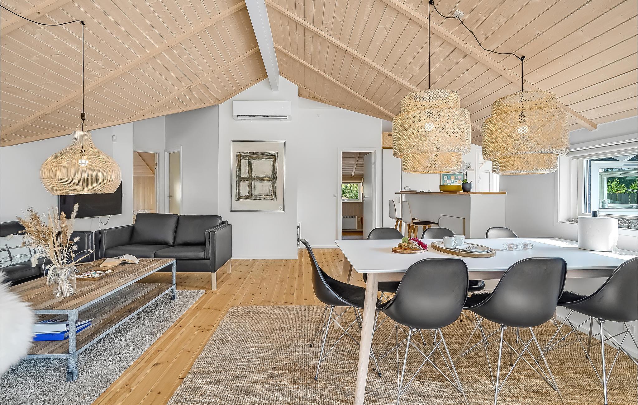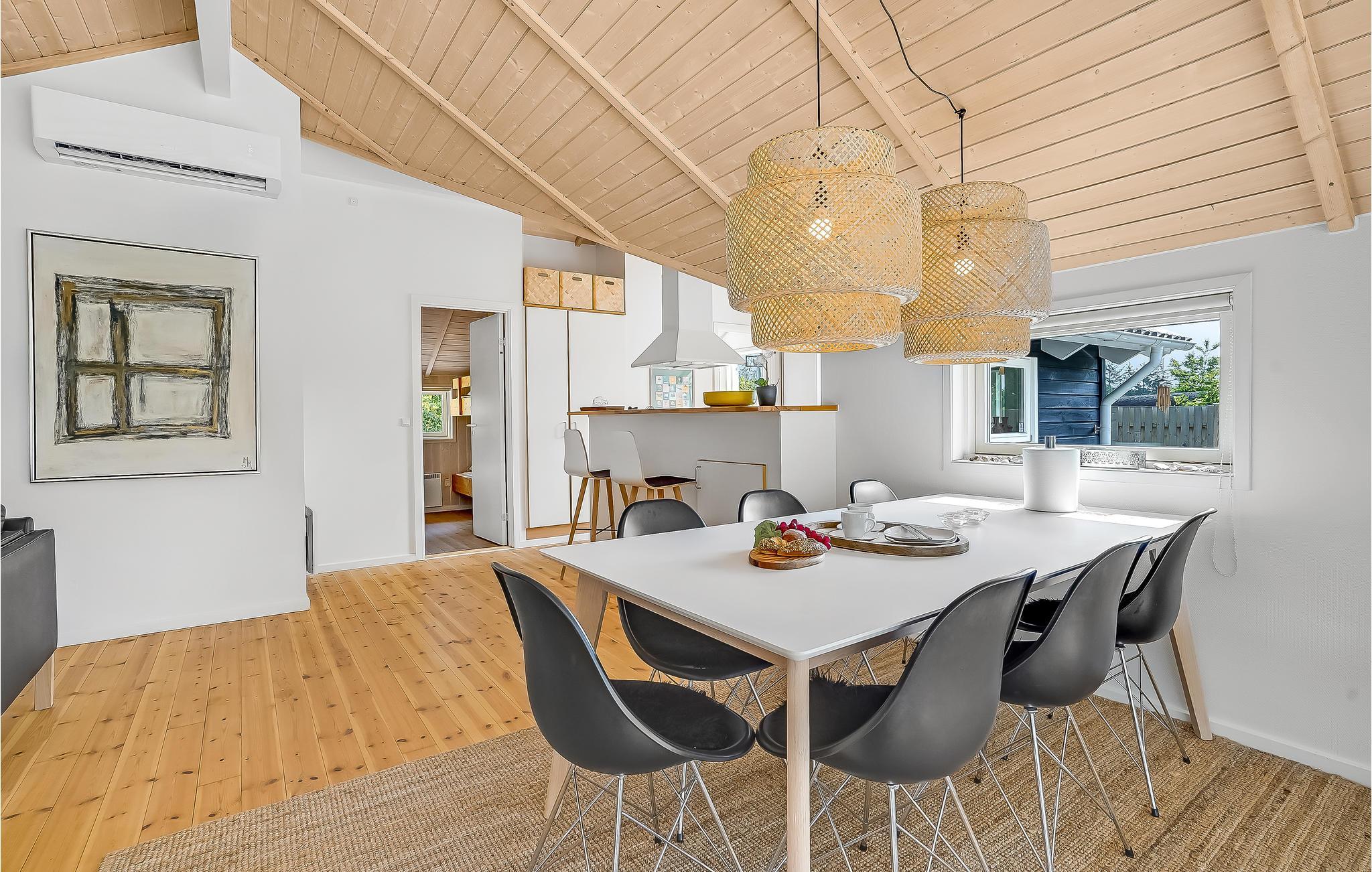 Ein schönes und gut ausgestattetes Ferienhaus, das sich an einem Waldgebiet befindet, das Schutz bietet, wenn der Wind kräftiger weht. Der zentrale Küchen- und Essbereich wird automatisch zu Ihrem Treffpunkt, wenn Sie sich auf die Abenteuer von morgen vorbereiten, Spiele spielen, köstliche Mahlzeiten zubereiten und nicht zuletzt vor dem gemütlichen Kaminofen sitzen. Das Haus enthält schöne Schlafzimmer und zwei Badezimmer, eines davon mit Whirlpool, Dampfkabine und Sauna. Die schöne Terrasse erstreckt sich an drei Seiten des Hauses, und vom Wohnzimmer aus betreten Sie den überdachten Teil, wo Sie bis weit in den Abend hinein sitzen können. Der Sønderstrand ist an manchen Stellen bis zu vier Kilometer breit und ein großer Spielplatz für Jung und Alt, auf dem auch sowohl Kite-Buggys erlaubt sind.
