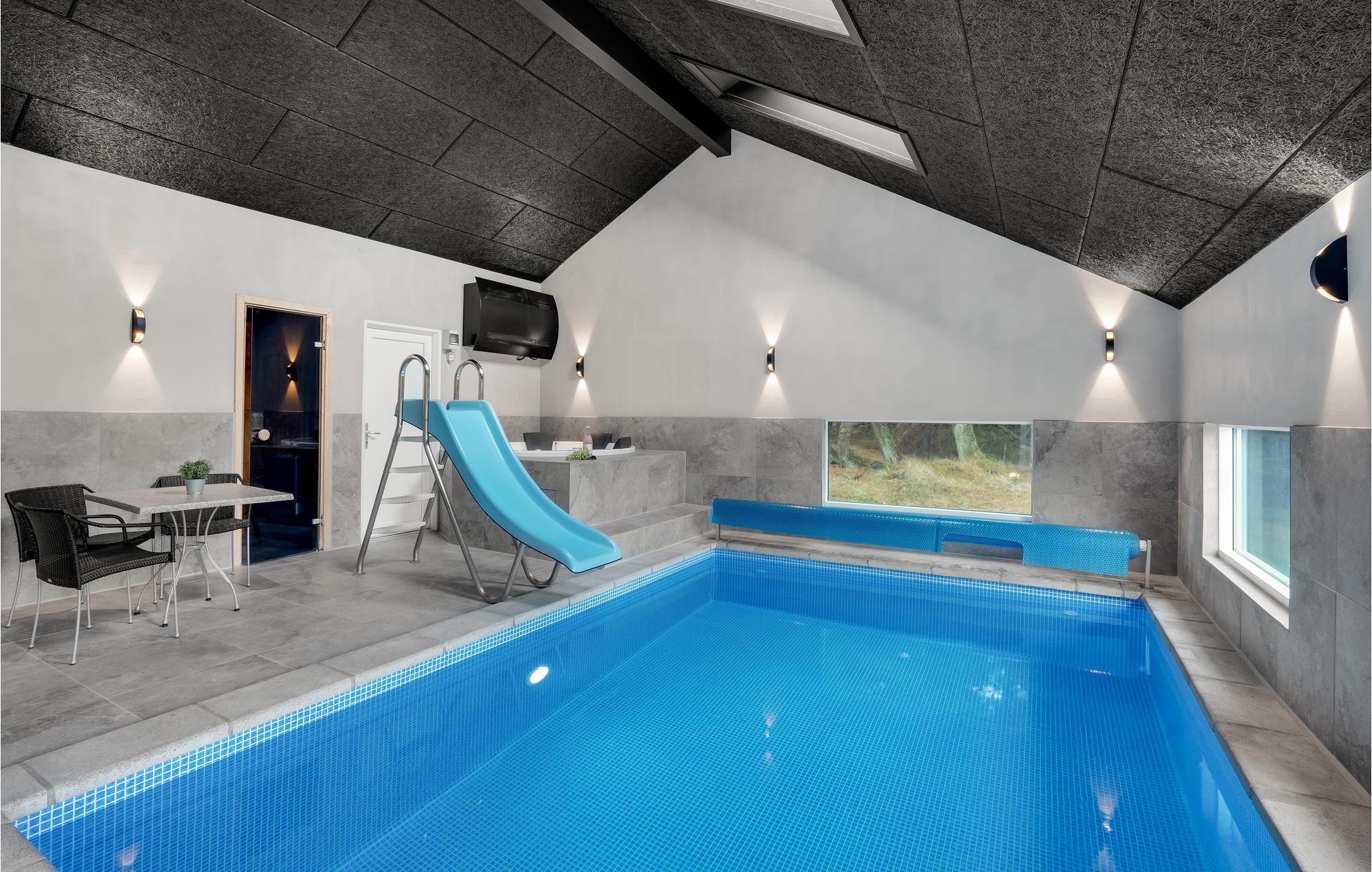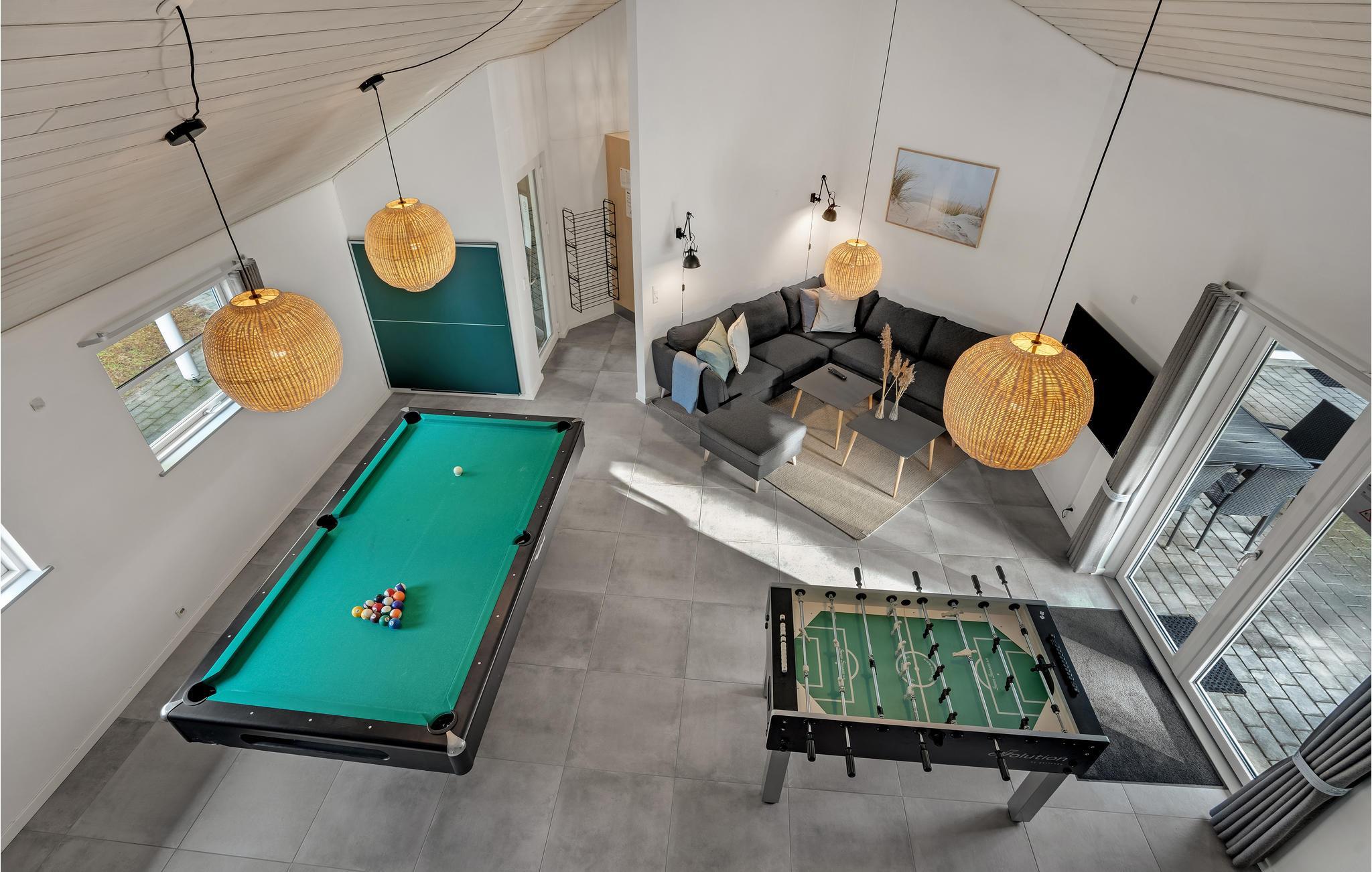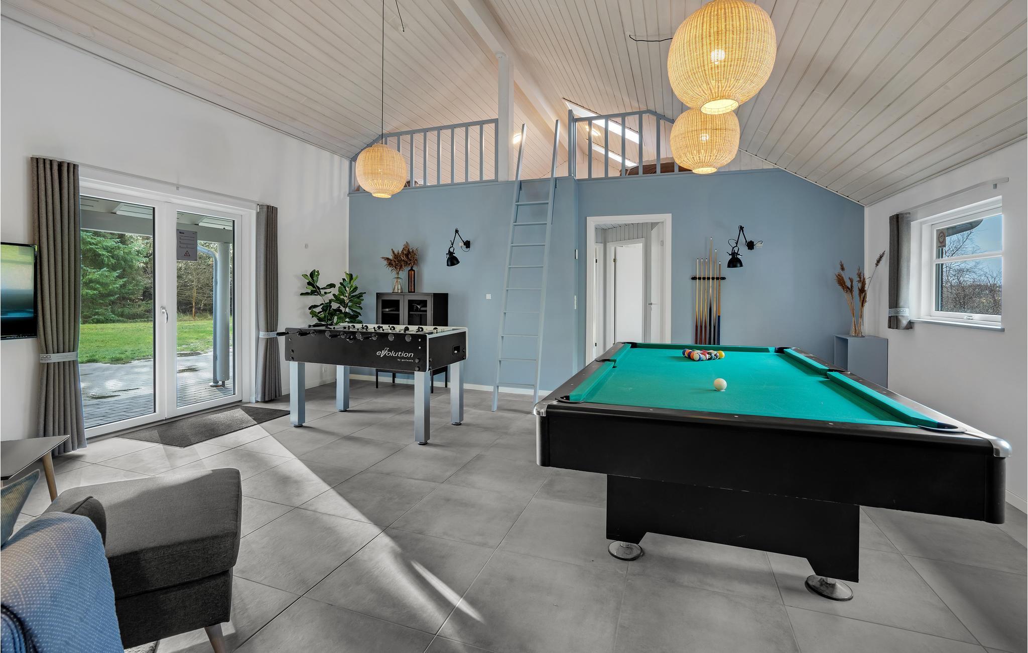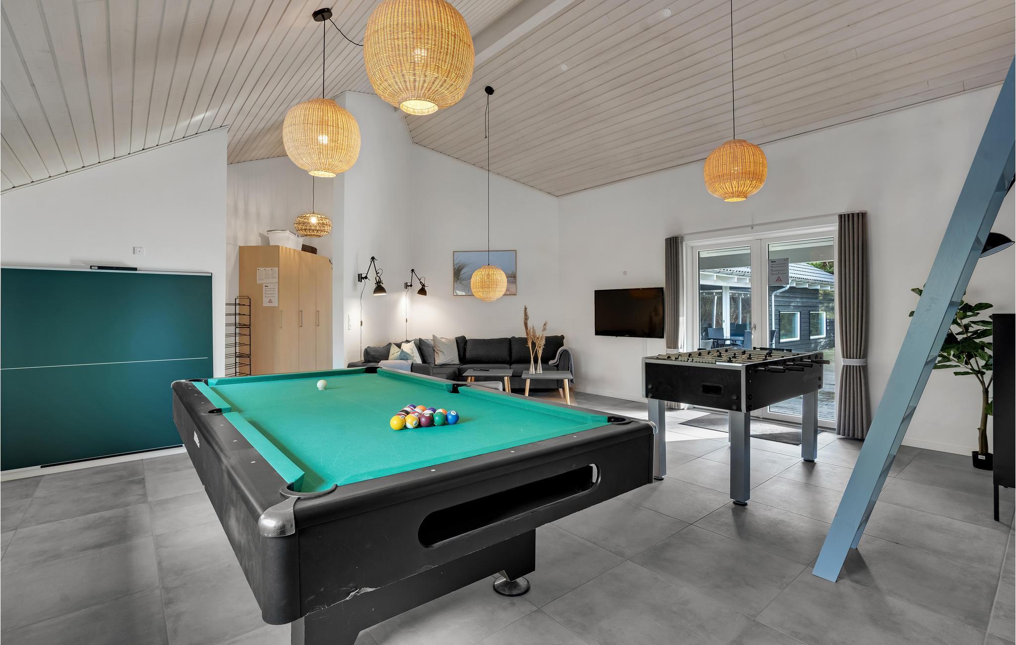 Dieses Schmuckstück von einem Haus auf 265 m² mit zwei großen Schlafböden mit insgesamt 30 m² enthält einfach alles, was Sie begehren. Hier können Sie sich entfalten, aktiv sein und entspannen. Auf einem Rundgang stoßen Sie sofort auf die schöne Badeabteilung mit dem Swimmingpool und der Wasserrutsche, den Whirlpool, die Sauna und das separate Badezimmer mit Dusche. Zentral platziert finden Sie die Wohnküche. In der Küche werden Ihnen zwei Herde mit keramischen Kochplatten, zwei eingebaute Warmluftbacköfen, zwei Kühl-/Gefrierschränke und ein Geschirrspüler zur Verfügung gestellt. Im Aktivitätsraum haben Sie wirklich viele Möglichkeiten, Ihre Muskeln zu bewegen: Tischtennis, Pool und Tischfußball erwarten Sie hier. Dieses Haus verfügt selbstverständlich über eine Playstation 2 und einen gratis Internetanschluss mit 50/50 Mbit. Das Haus ist sehr großzügig angelegt und bietet 22 Personen in drei separaten Schlafbereichen mit einem Badezimmer pro Abteilung reichlich Platz. Dazu gibt es hier noch 2 geräumige und hohe Hemse. Auf dem großen, ungestörten Grundstück mit Randbewuchs wurde mit Spielgeräten an die jüngeren Gäste gedacht, während Sie auf der Terrasse gemütliche Stunden verbringen können.