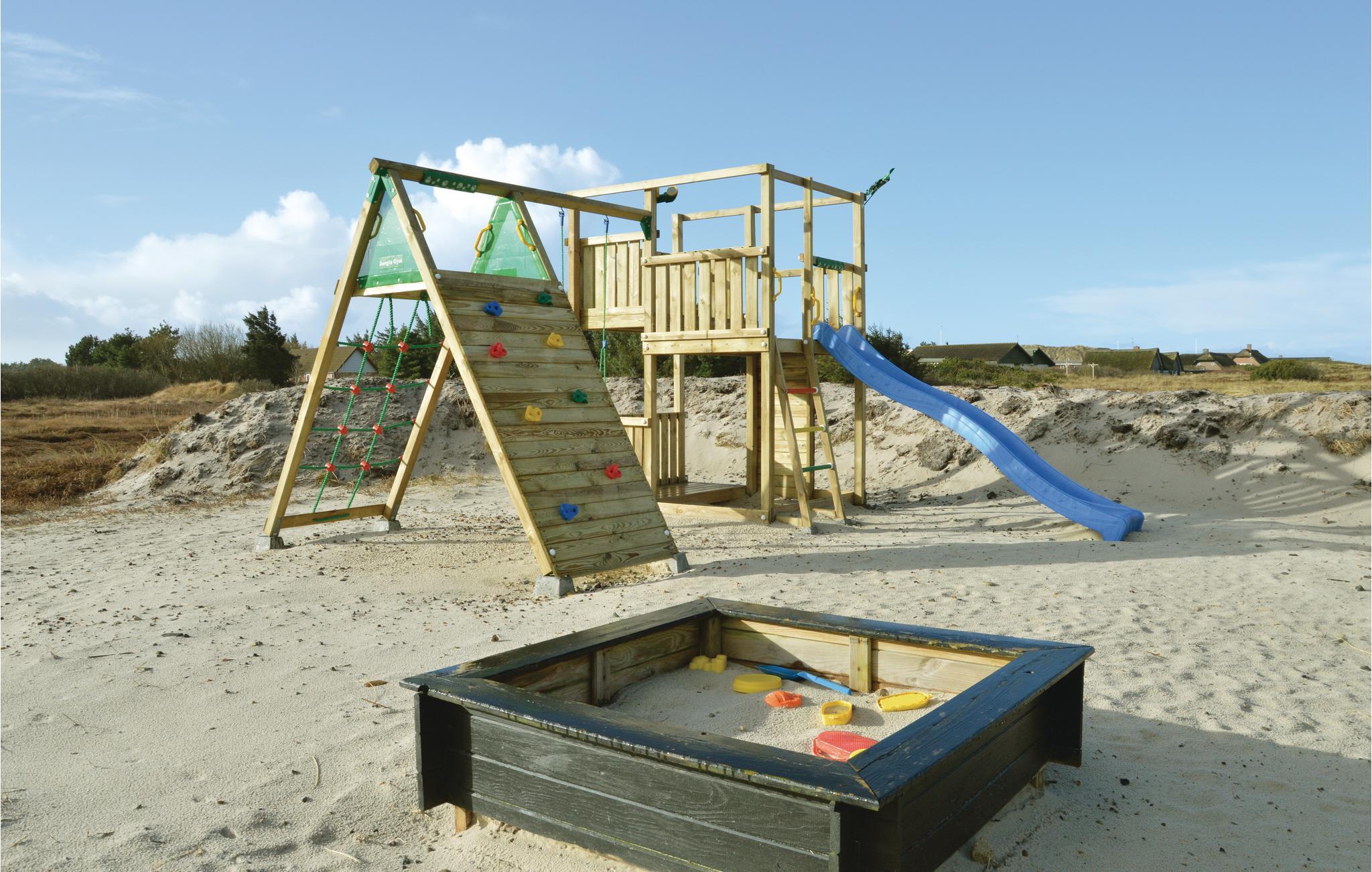 Vor dem Haus haben Sie eine Terrasse unter Dach, sie wendet sich nach Westen und bietet Aussicht auf die Dünen und schöne Sonnenuntergänge. Im Garten sind auch Spielturm mit Rutsche, Kletterwand, Schaukeln und Sandkasten vorhanden. Im 9 m² großen Schuppen können Sie Räder aufbewahren. Eine Steckdose für ein Elektroauto (Tesla und andere Elektroautos) ist auch vorhanden, ein nicht allgemein vorhandenes Detail.