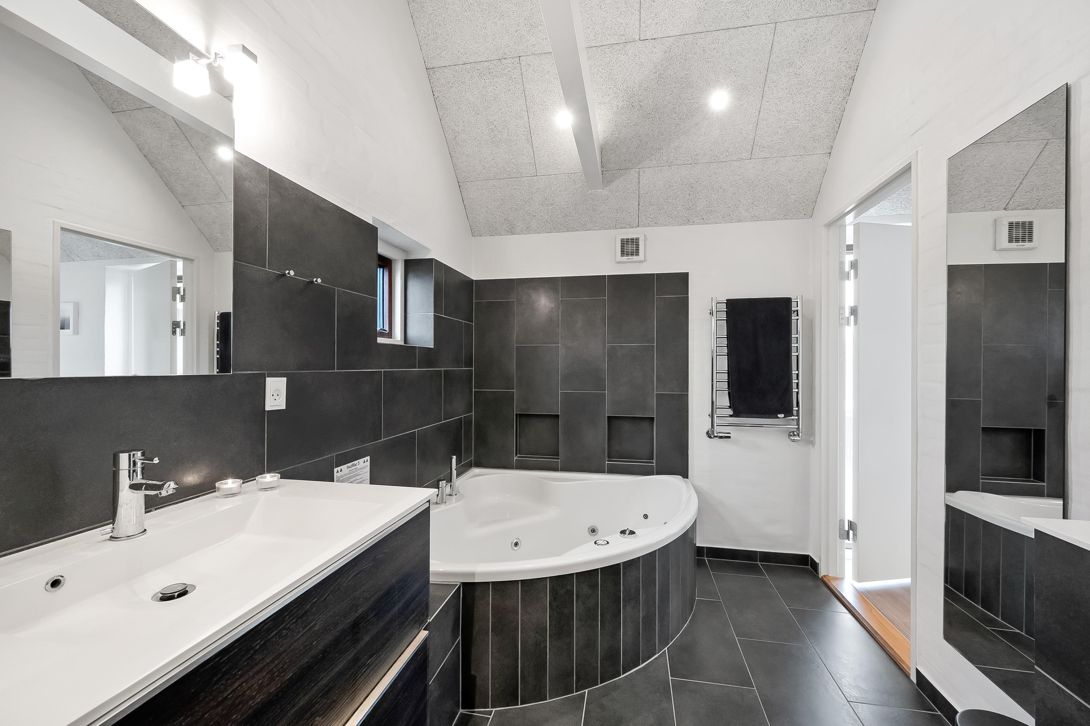 The modern kitchen is fully equipped with an oven, four ceramic hobs, a refrigerator, a 40-liter freezer, a dishwasher, and a microwave. The holiday home has three large bedrooms: two with double beds and one with two single beds. The two bathrooms are equipped with a toilet and shower, and the larger one features a whirlpool and access to a sauna where you can pamper yourself and relax.