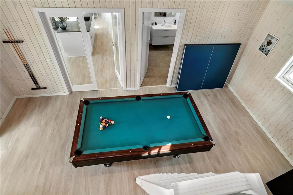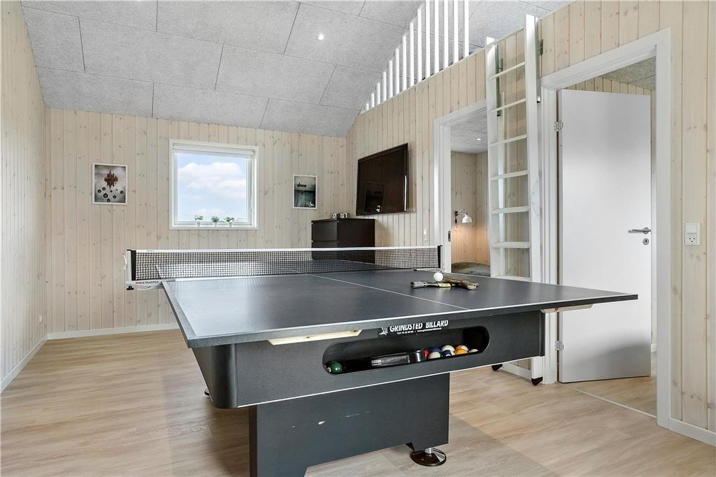 Das Haus besticht mit einem Aktivitätsraum mit Billardtisch, welcher auch zur Tischtennisplatte umfunktioniert werden kann. Hinzu gesellen sich unzählige Spiele, ein Playstation inkl. Spiele und ein Fernseher. In diesem Raum werden Groß und Klein sicherlich zahllose schöne Stunden miteinander verbringen. Im Schuppen befindet sich eine Dartscheibe.