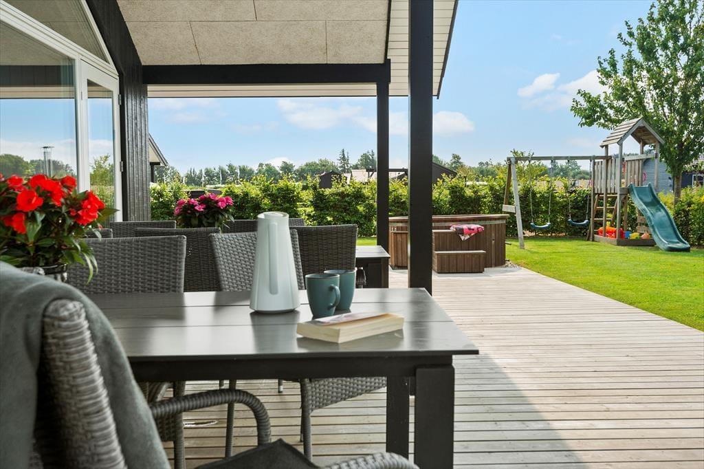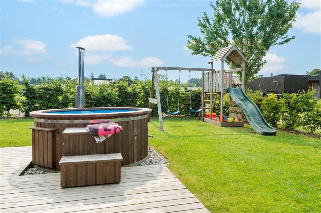 Eine 160 m² große Holzterrase umgibt das Haus. Unter freiem Himmel sorgt zudem ein ganzjährig nutzbarer Schwedischer Badetonne für Begeisterung. Dieser bietet Platz für 6 Personen und lädt zu traumhaften entspannten Momenten ein.