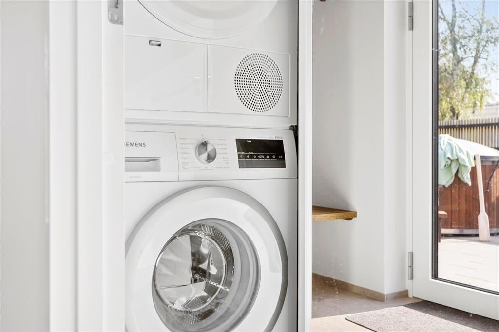 Im Hauswirtschaftsraum stehen eine Waschmaschine und ein Wäschetrockner bereit.