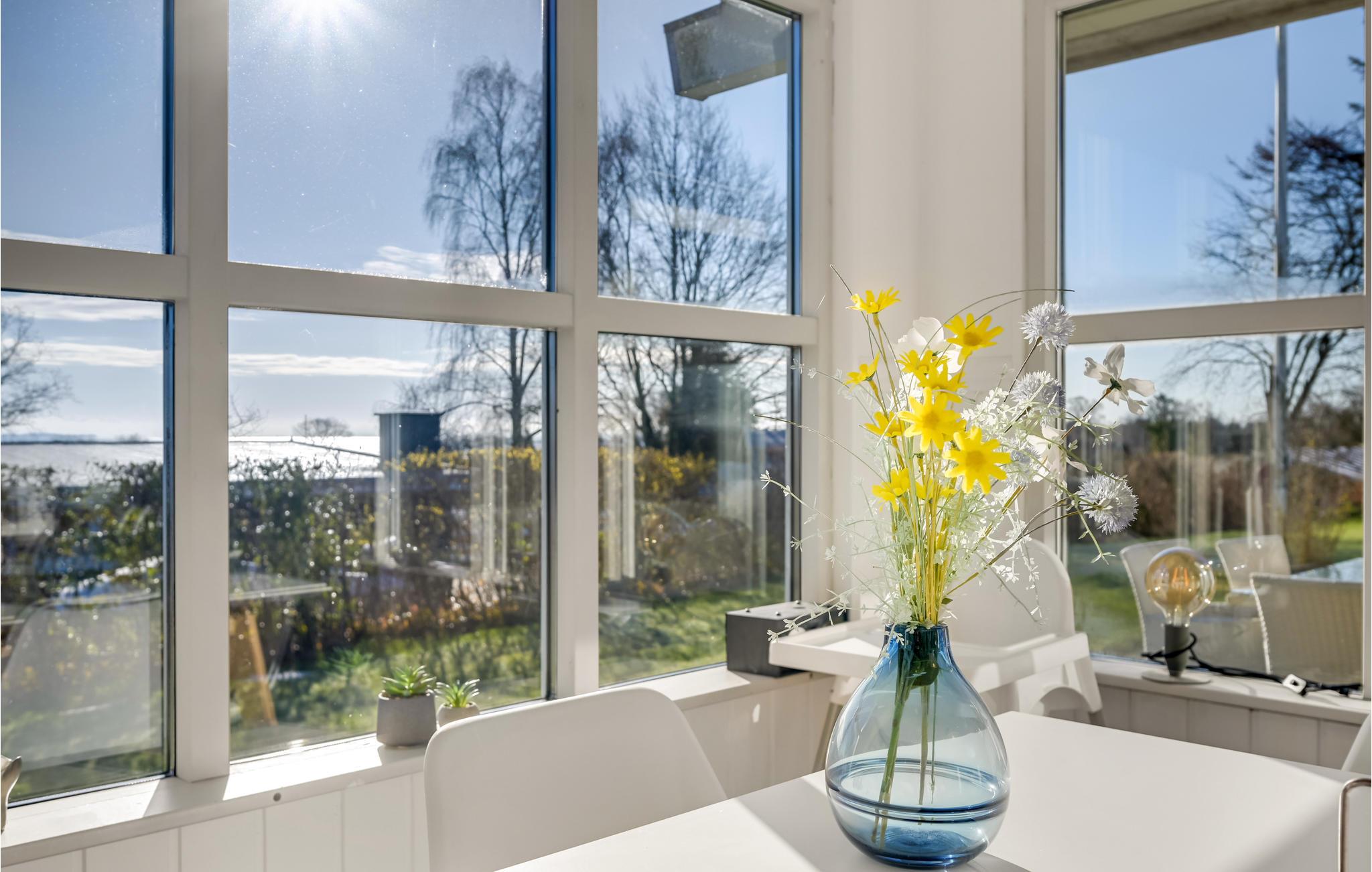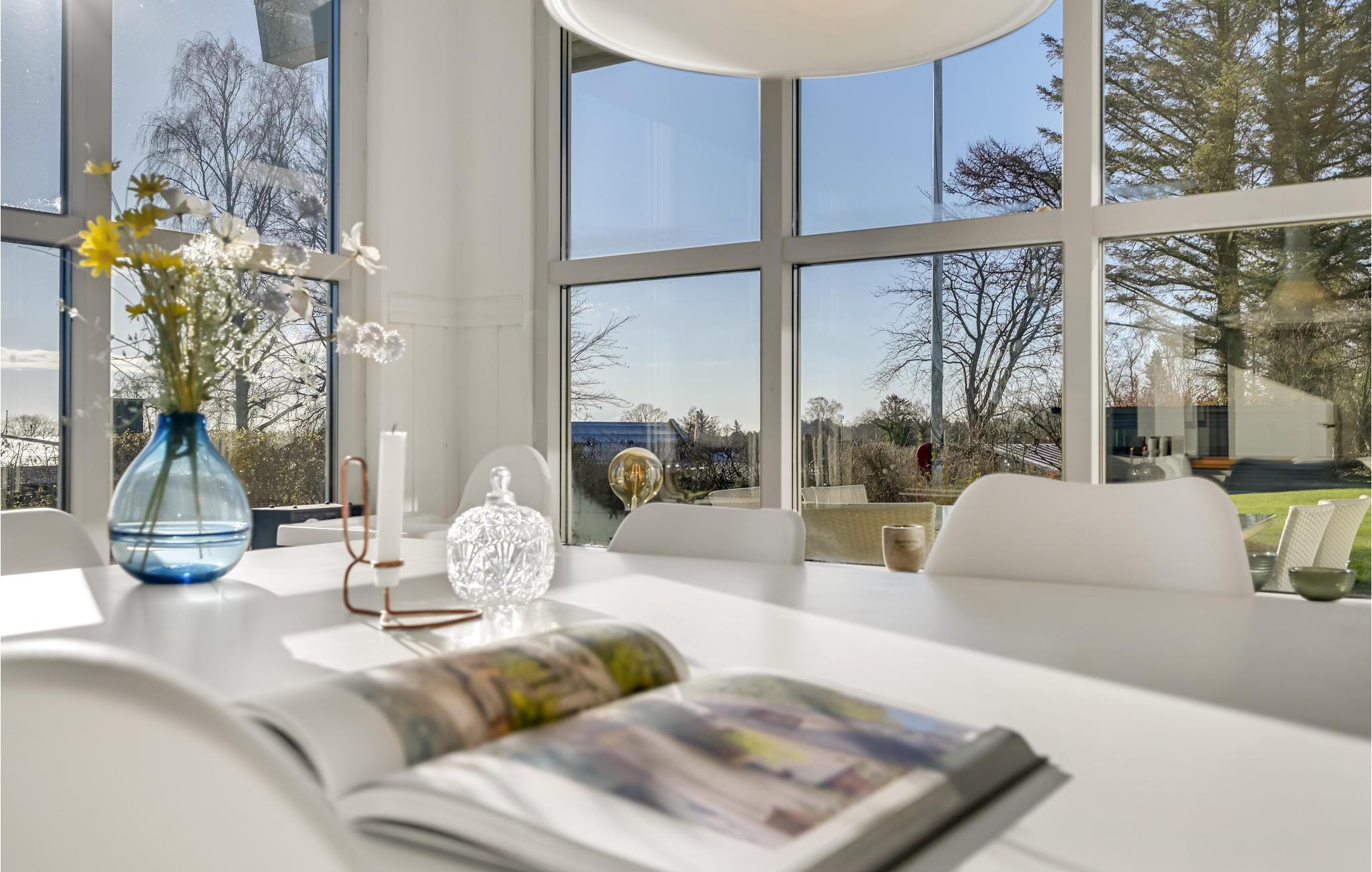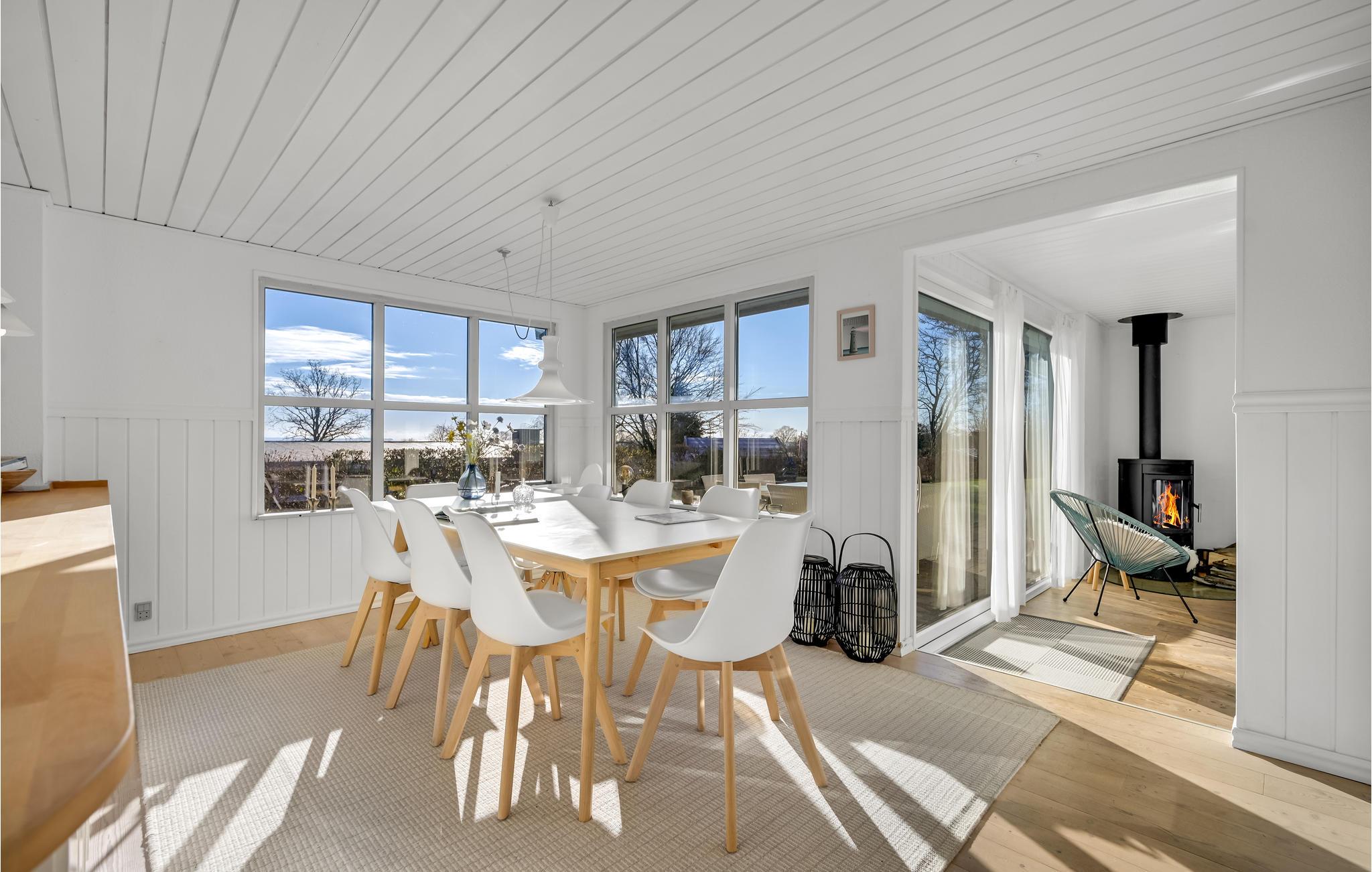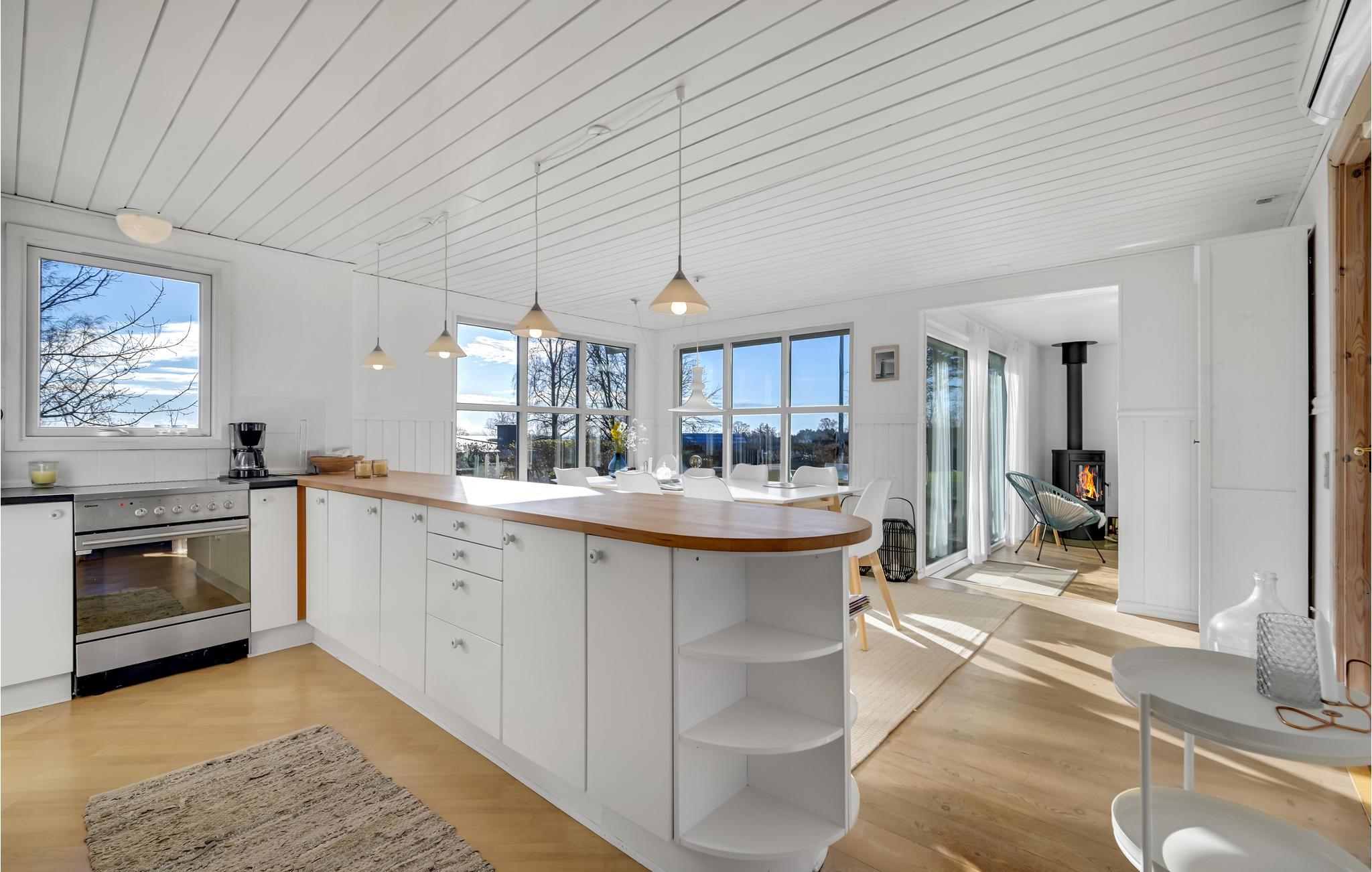 Die wohnliche Einrichtung mit modernen Möbeln schafft eine behagliche Wohlfühlatmosphäre in den hellen Räumen dieses kinderfreundlichen Hauses. Kochen und essen Sie in aller Ruhe zusammen mit schönem Blick auf das Meer durch großflächige Sprossenfenster und lassen Sie die Hektik des Alltags hinter sich. Abends machen Sie es sich in bequemen Sitzmöbeln gemütlich, nehmen sich ein Buch aus dem Regal, spielen Spiele, sehen einen Film oder plaudern bis spät in den Abend am behaglich knisternden Kaminofen.