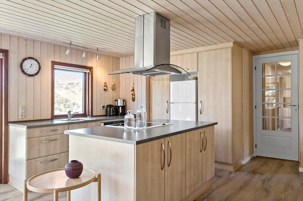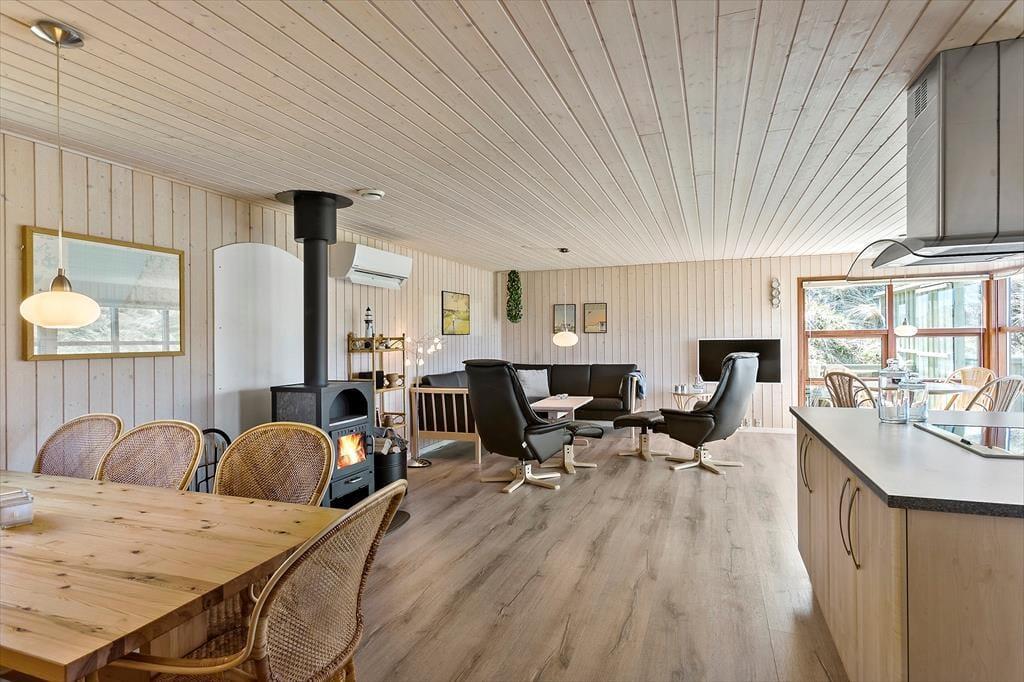 Wenn du das Ferienhaus betrittst, wirst du von einer offenen und hellen Küche und einem Wohnzimmer empfangen. Hier gibt es viel Platz zum Zusammensein und Entspannen, und die großen Fenster lassen die Sonne in den Raum strömen, sodass du dich immer der Natur draußen näher fühlst. Die offene Küche ermöglicht es dir, köstliche Mahlzeiten zuzubereiten, während du gleichzeitig an den Gesprächen teilnimmst, während andere sich im gemütlichen Wohnzimmer entspannen. Wenn die Dunkelheit hereinbricht, kannst du den Kaminofen anzünden und eine gemütliche und warme Atmosphäre schaffen – perfekt für lange Winterabende mit Familie und Freunden.