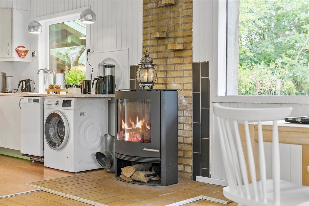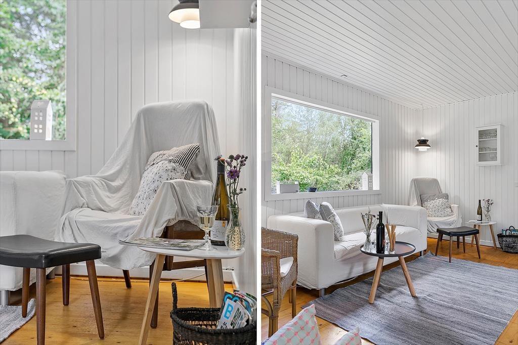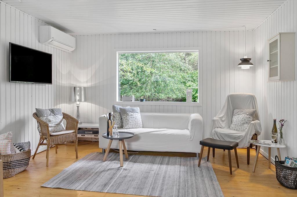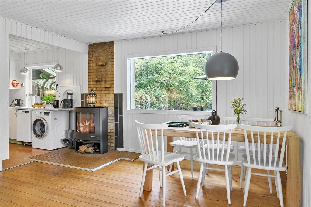 Das Ferienhaus präsentiert sich mit seinen weiß gestrichenen Holzwänden, dem Kaminofen und dem hell möblierten Wohnraum schön und einladend. Nahe der Polstersitzgruppe sorgt ein Flachbild-TV mit Chromecast für Unterhaltung und Abwechslung. Der Esstisch ist nah an der offenen Küche platziert, sodass das Servieren der Mahlzeiten ein Leichtes ist. Das Badezimmer mit Dusche befindet sich nah am Hauseingang. Die Schlafplätze für insgesamt sechs Personen verteilen sich auf drei gute Schlafzimmer.
