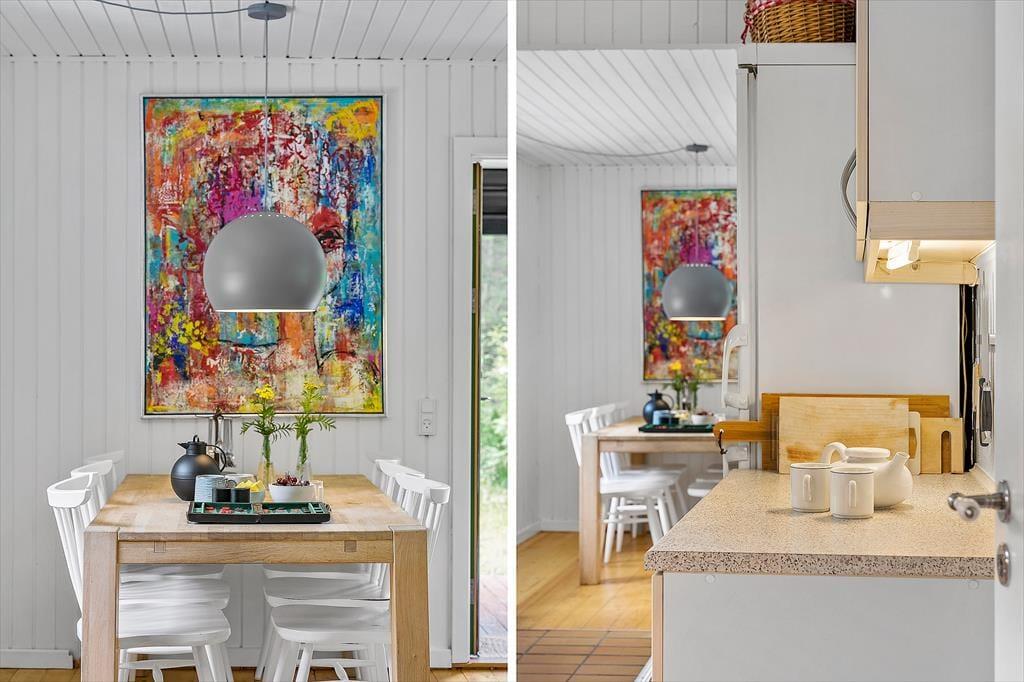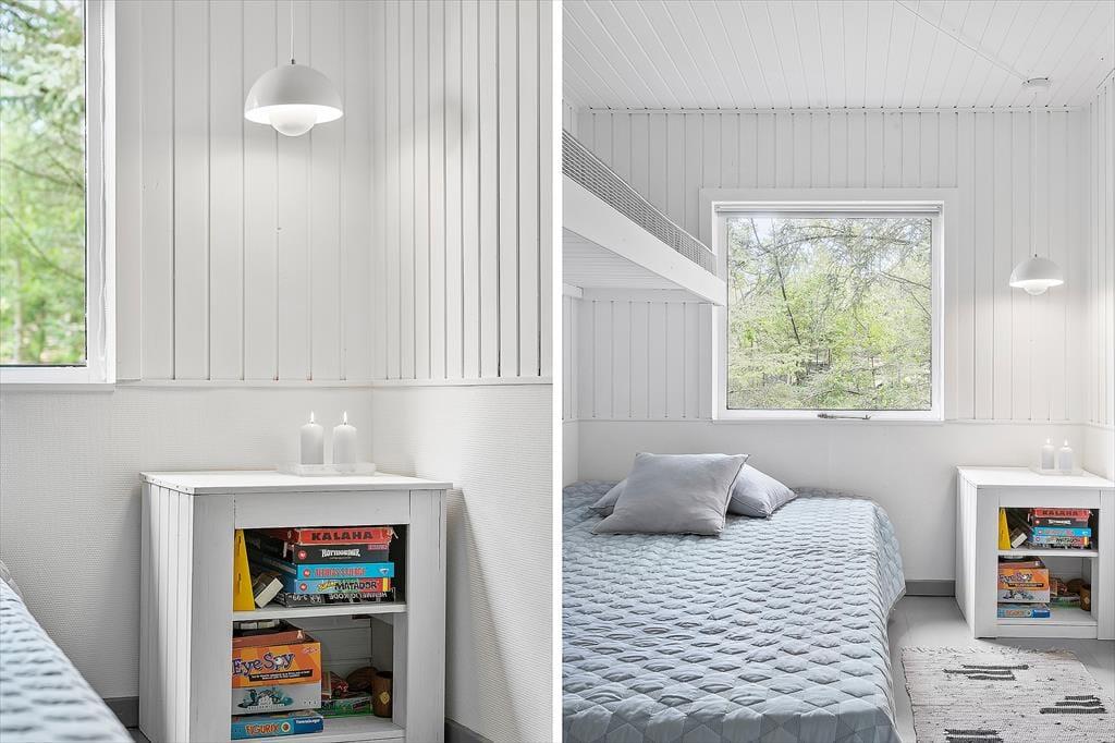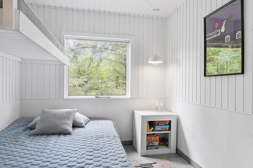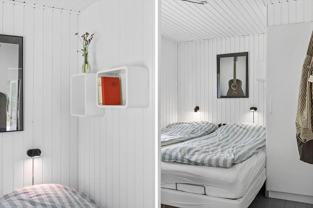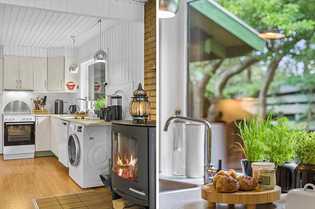 Das Ferienhaus präsentiert sich mit seinen weiß gestrichenen Holzwänden, dem Kaminofen und dem hell möblierten Wohnraum schön und einladend. Nahe der Polstersitzgruppe sorgt ein Flachbild-TV mit Chromecast für Unterhaltung und Abwechslung. Der Esstisch ist nah an der offenen Küche platziert, sodass das Servieren der Mahlzeiten ein Leichtes ist. Das Badezimmer mit Dusche befindet sich nah am Hauseingang. Die Schlafplätze für insgesamt sechs Personen verteilen sich auf drei gute Schlafzimmer.